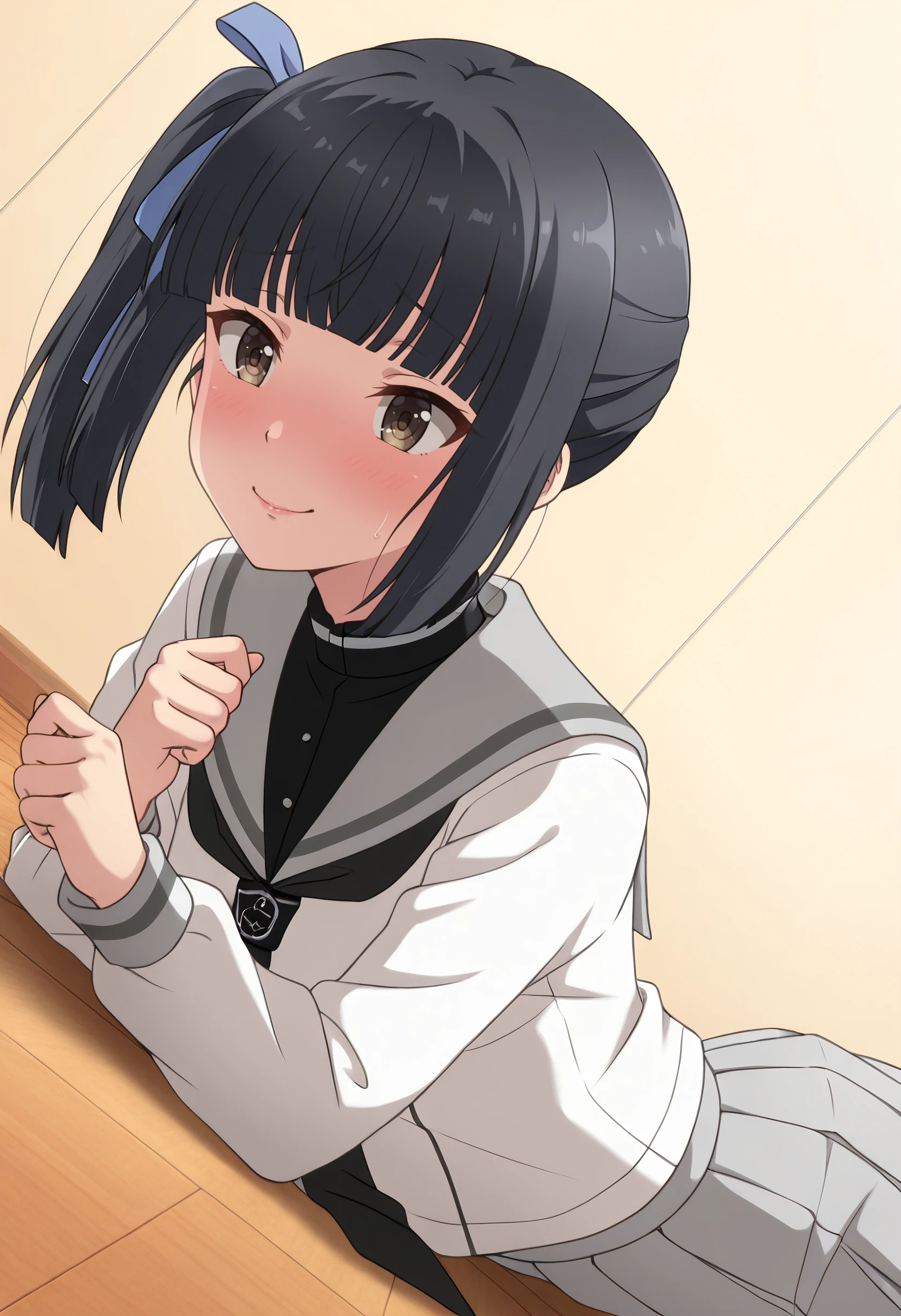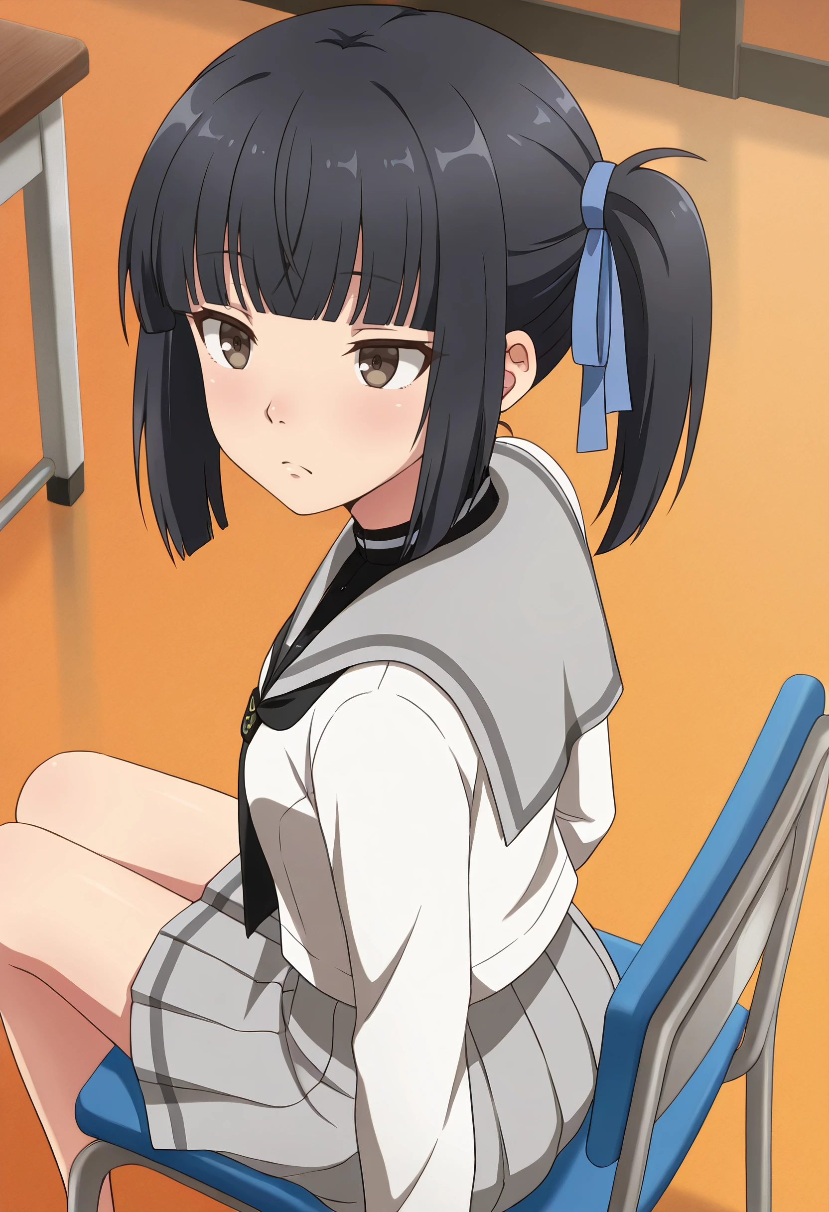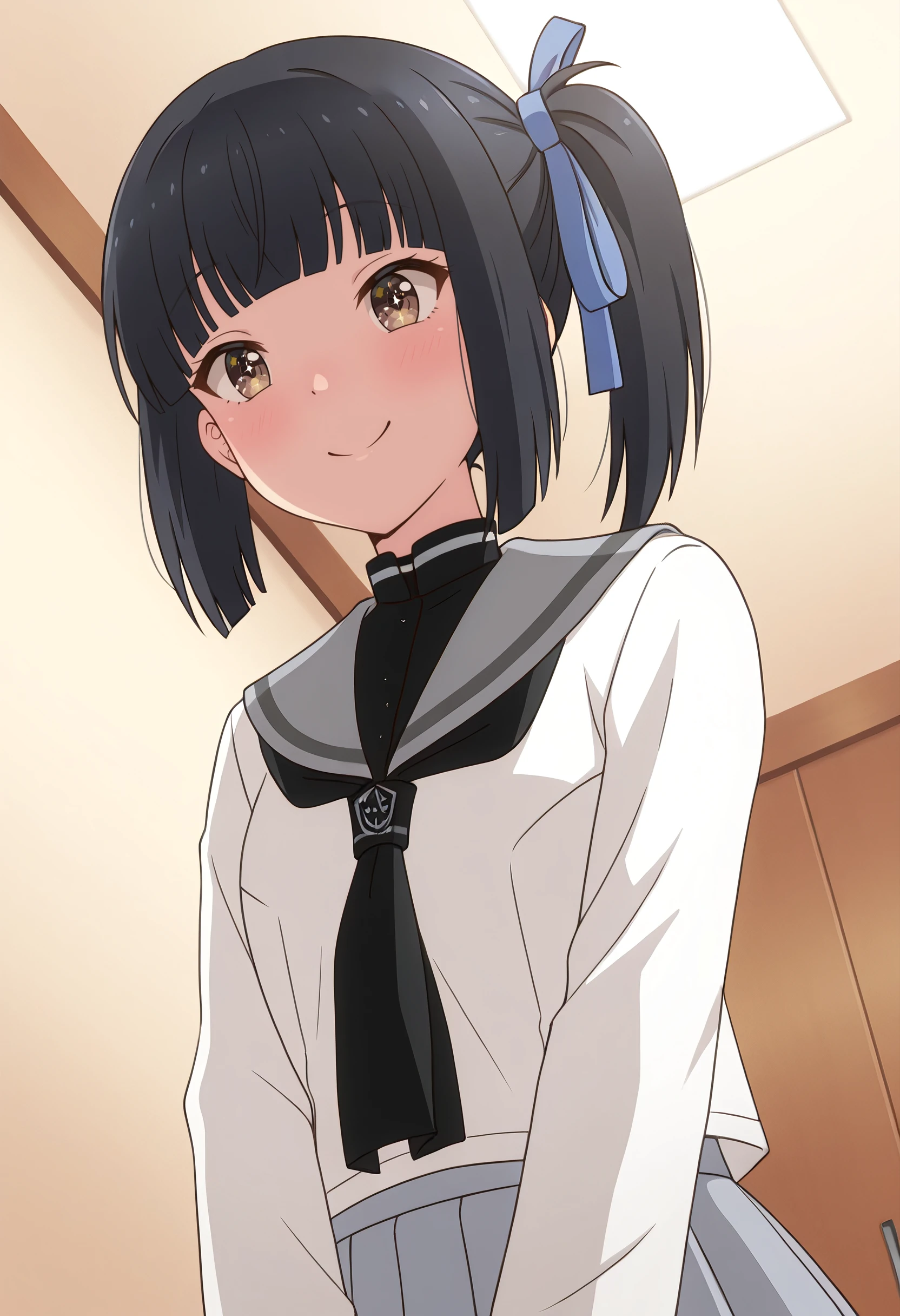 MiyaSchool, sailor collar, school uniform, grey sailor collar, long sleeves, serafuku, neckerchief, black neckerchief, ribbon, blue ribbon, black necktie, pleated skirt, skirt, grey skirt, white serafuku,