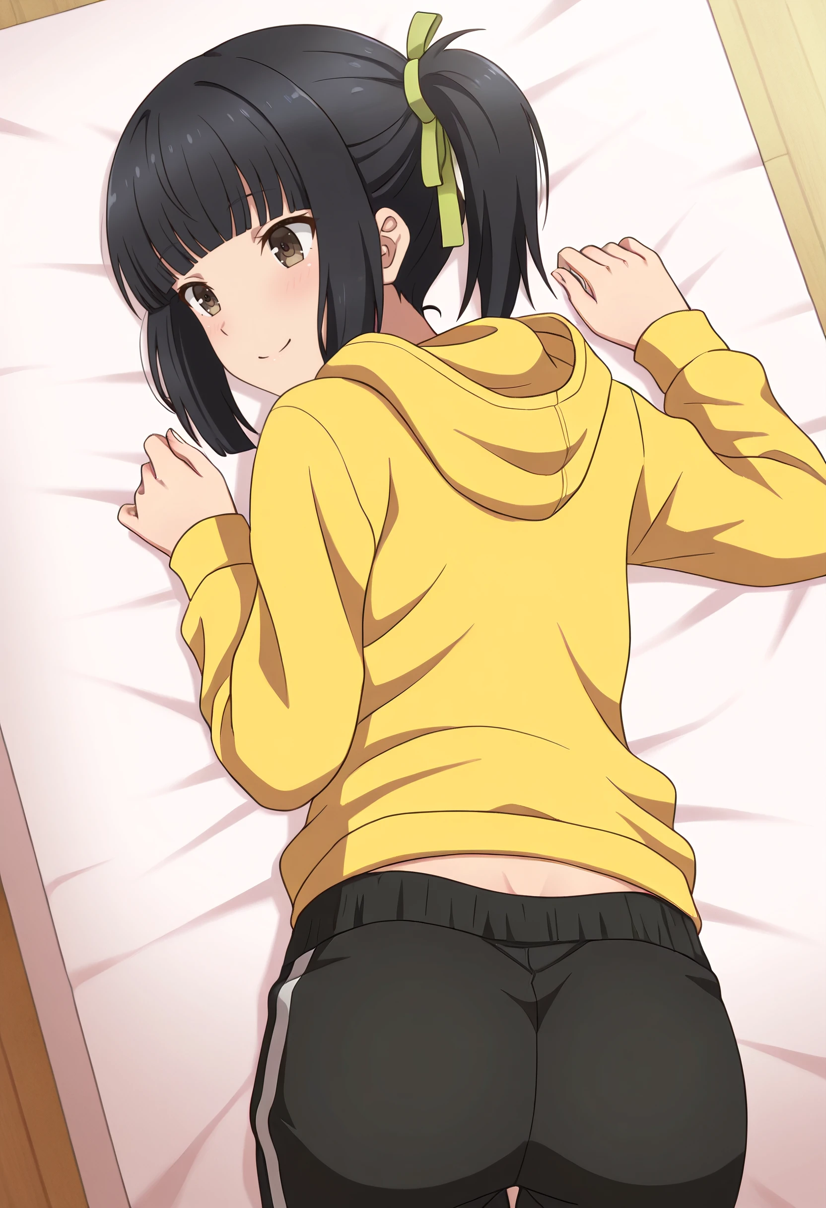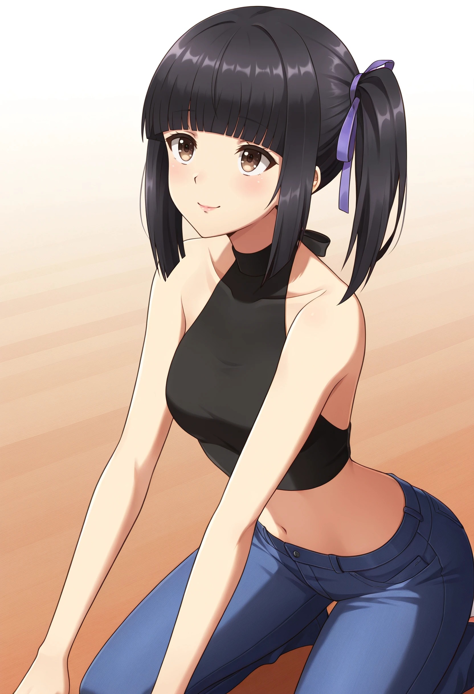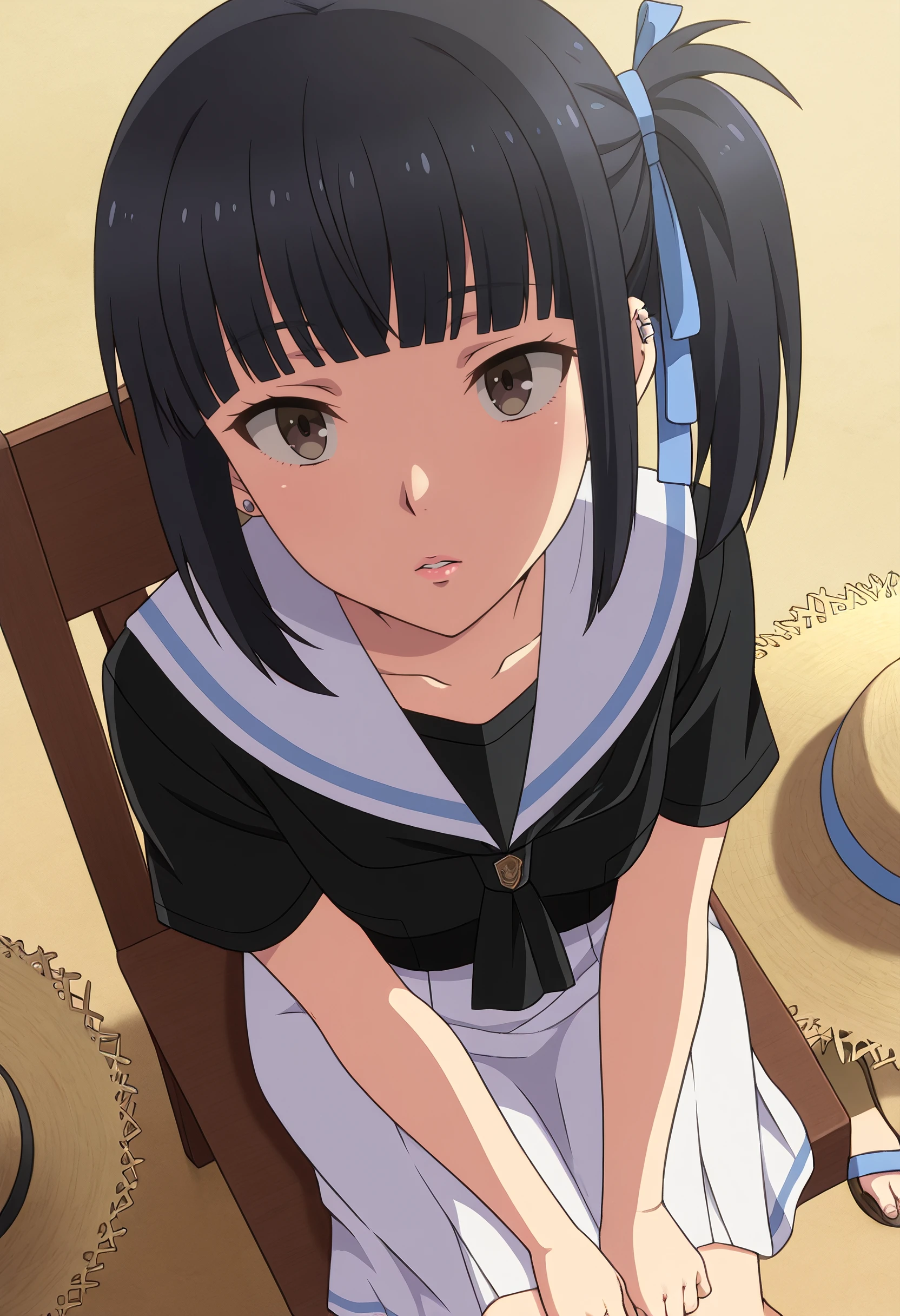 TNMMiya, brown eyes, black hair, hair ribbon, short hair, side ponytail, blunt bangs, ponytail, sidelocks,