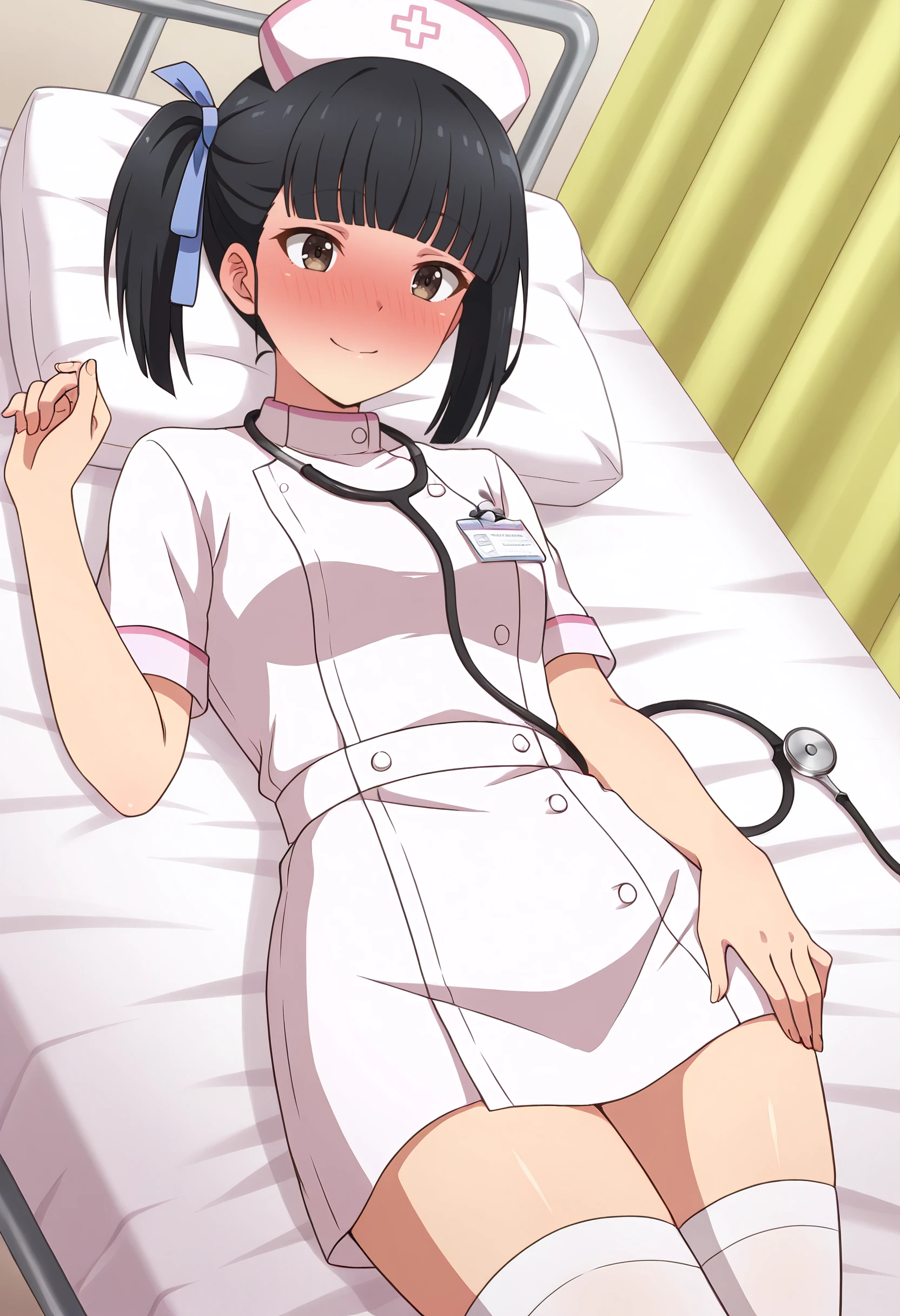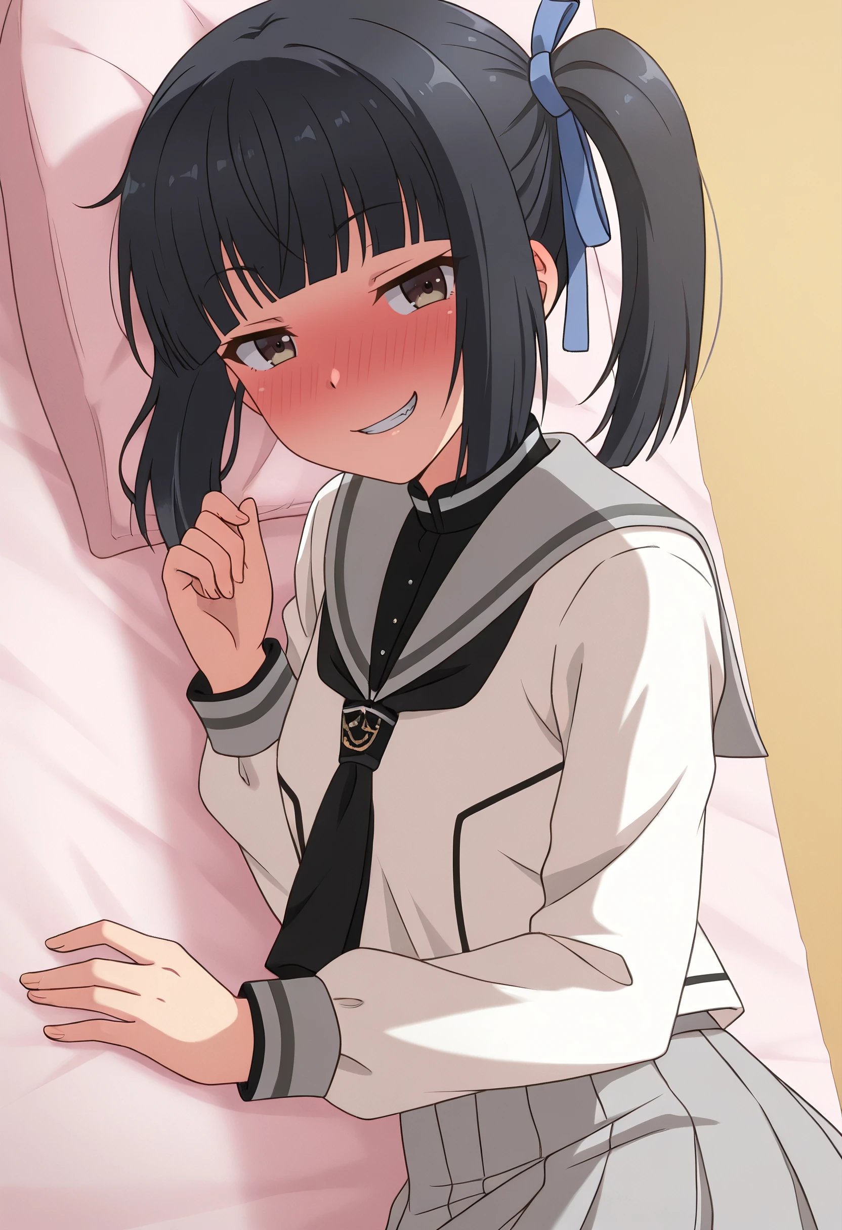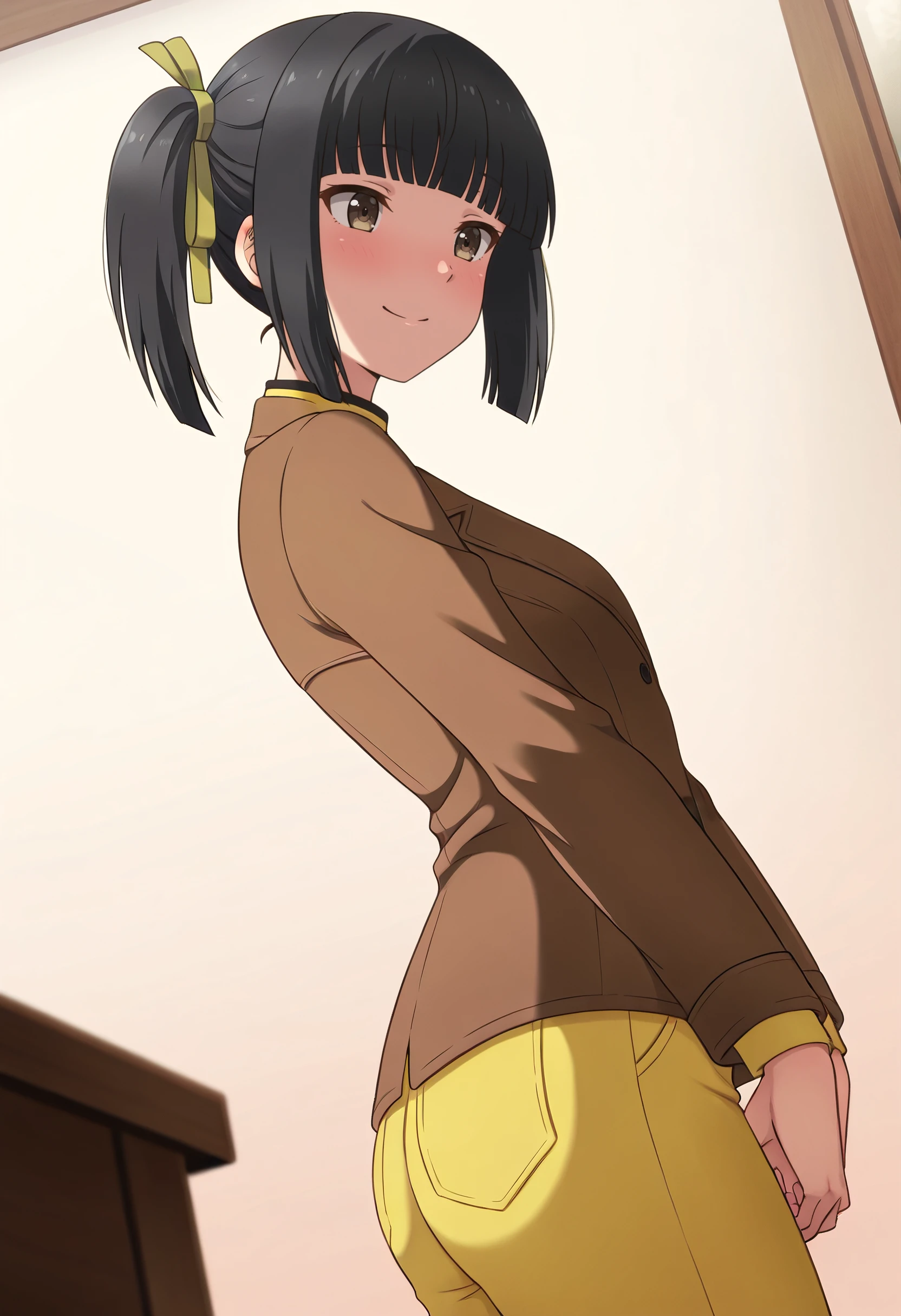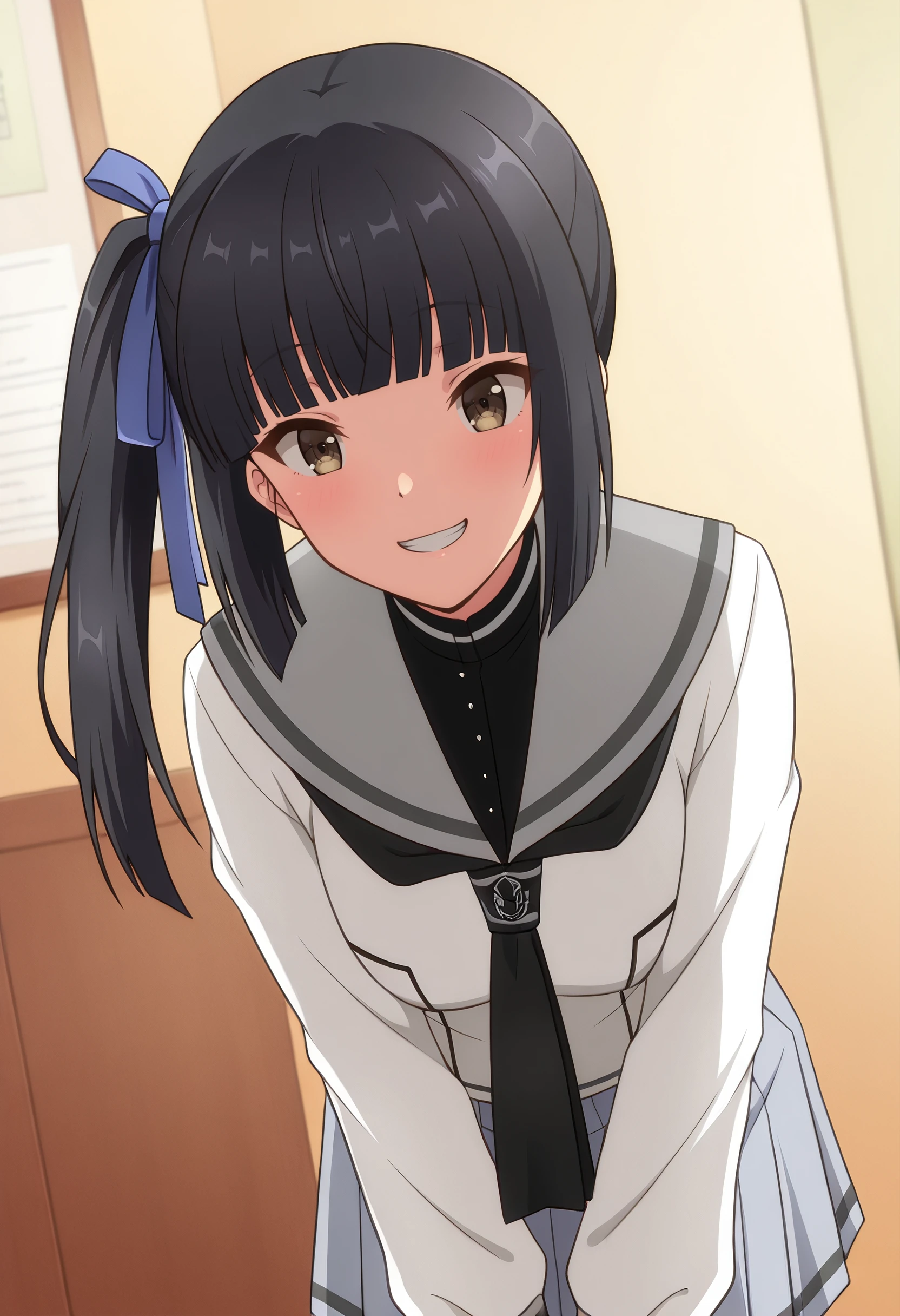 TNMMiya, brown eyes, black hair, hair ribbon, short hair, side ponytail, blunt bangs, ponytail, sidelocks,
