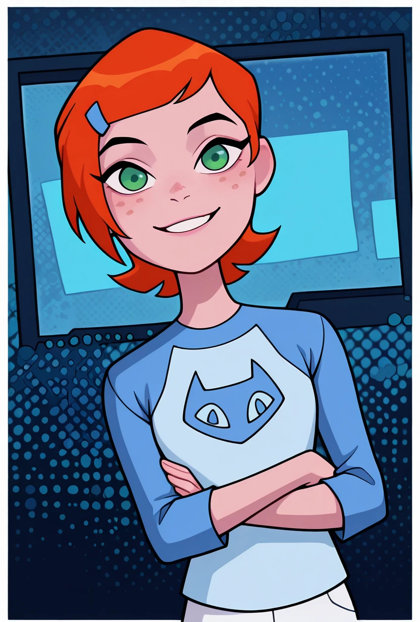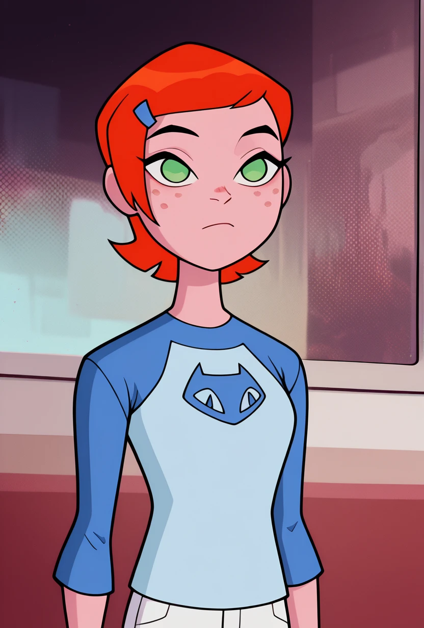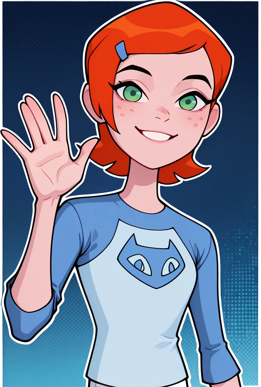 gwenov, orange hair, 1girl, short hair, hairclip, green eyes, raglan sleeves, freckles, white pants, blue shirt