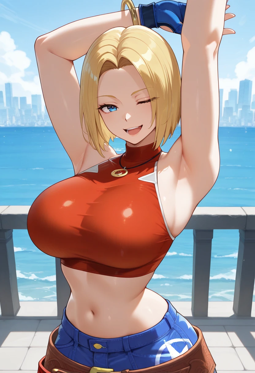 BMK0F, blonde hair, short hair, parted hair,blue eyes, sleeveless crop top, , navel, fingerless gloves, bangle, baggy jeans, large belt, star print