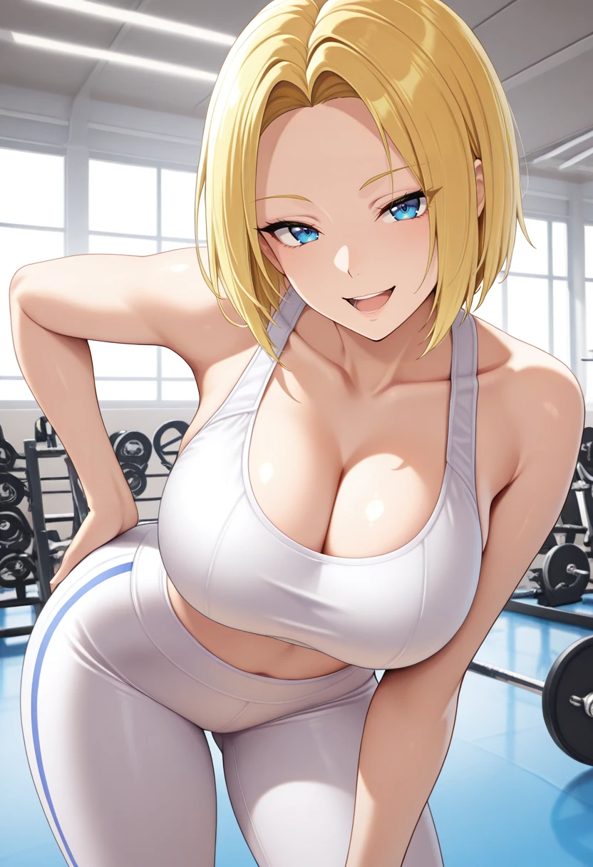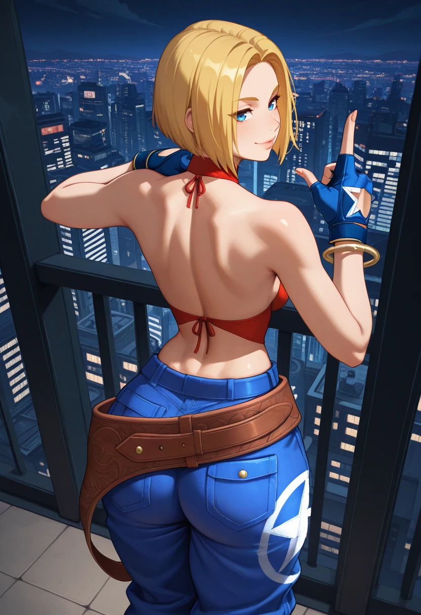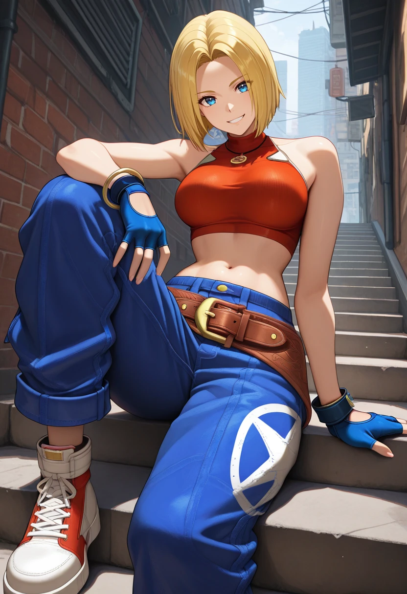 "BMK0F, blonde hair, short hair, parted hair,blue eyes, sleeveless crop top, , navel, fingerless gloves, bangle, baggy jeans, large belt, star print"