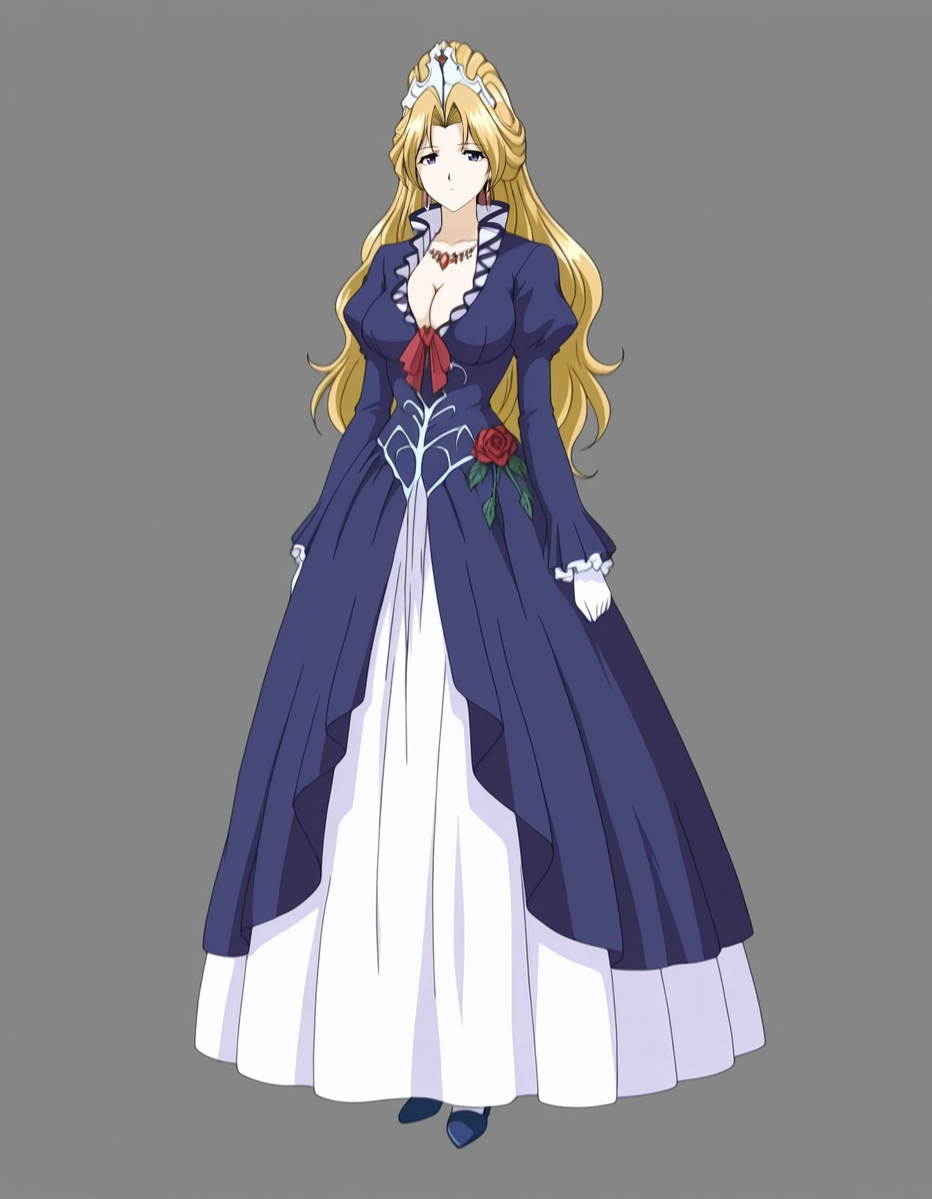 mai_kpdk,mai_elizakp,long_hair,blonde_hair,large_,princess,crown,earrings,necklace,blue_dress,long_sleeves,rose,cleavage