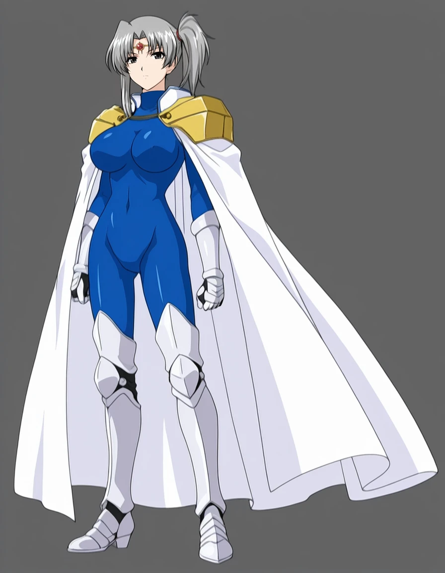 mai_kpdk,mai_cecilkp,long_hair,side_ponytail,grey_hair,black_eyes,large_,circlet,turtleneck,blue_,white_gloves,armored_boots,armor,very_long_cape,white_cape
