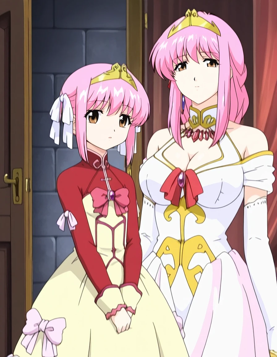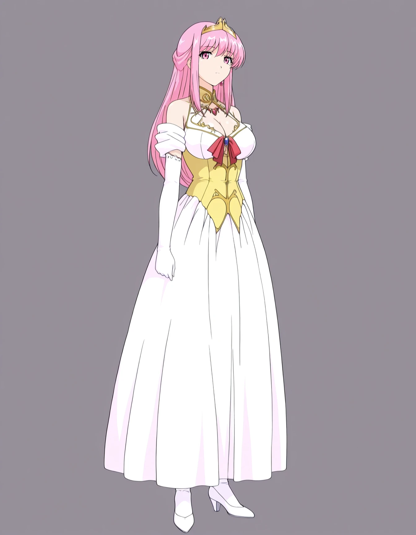 mai_kpdk,mai_phggkp,long_hair,pink_hair,pink_eyes,large_,crown,princess,long_dress,white_dress,yellow_vest,_shoulders