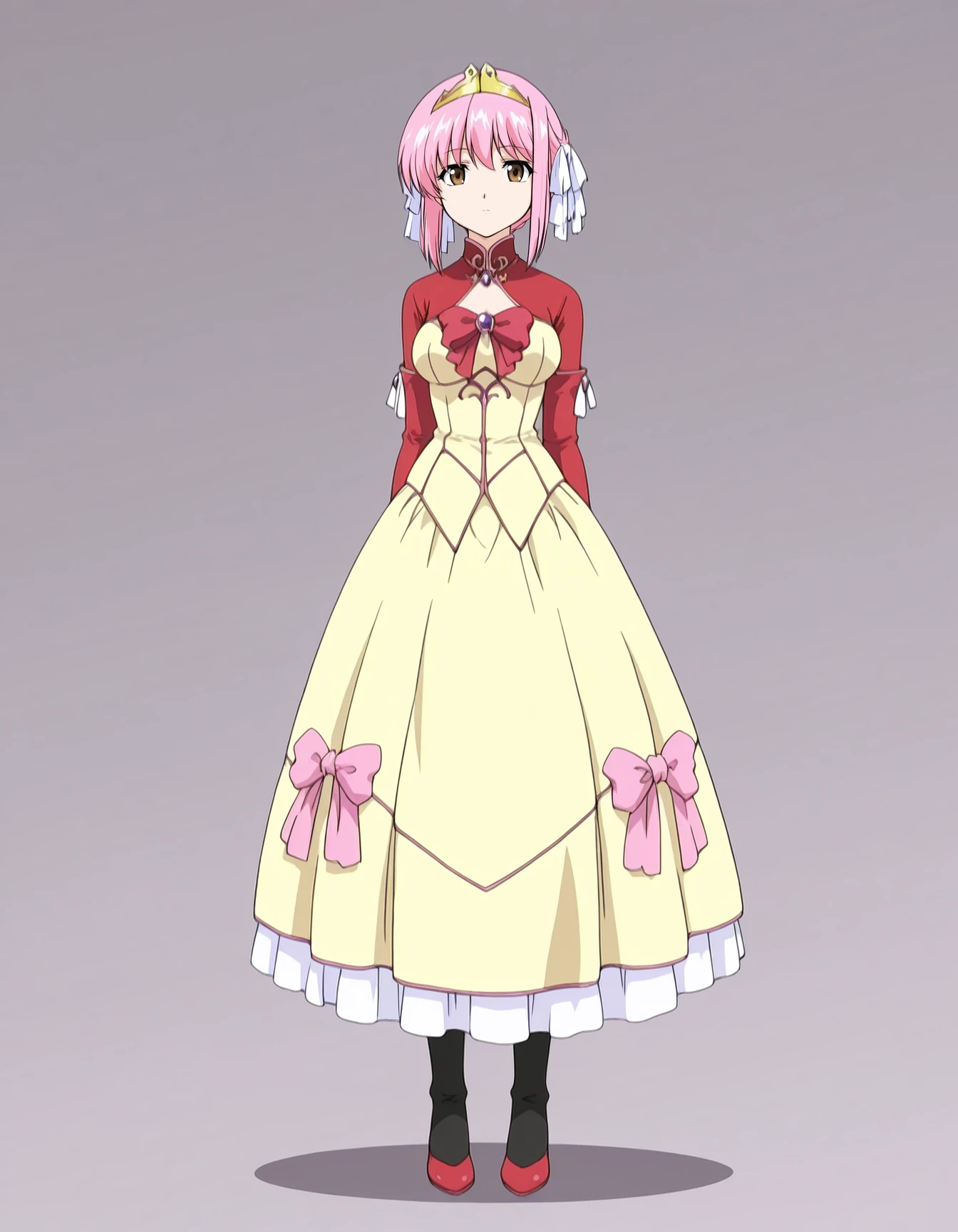 mai_kpdk,mai_kuunakp,short_hair,pink_hair,brown_eyes,crown,hair_ribbon,brooch,yellow_dress, long_dress,red_sleeves,yellpw_bow,pink_bow_on_side