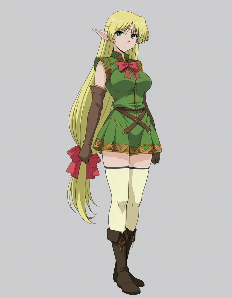 mai_kpdk,mai_elfggkp,elf,very_long_hair,blonde_hair,green_eyes,pointy_ears,circlet,red_bow,green_dress,brown_elbow_gloves,yellow_thighhighs,brown_boots
