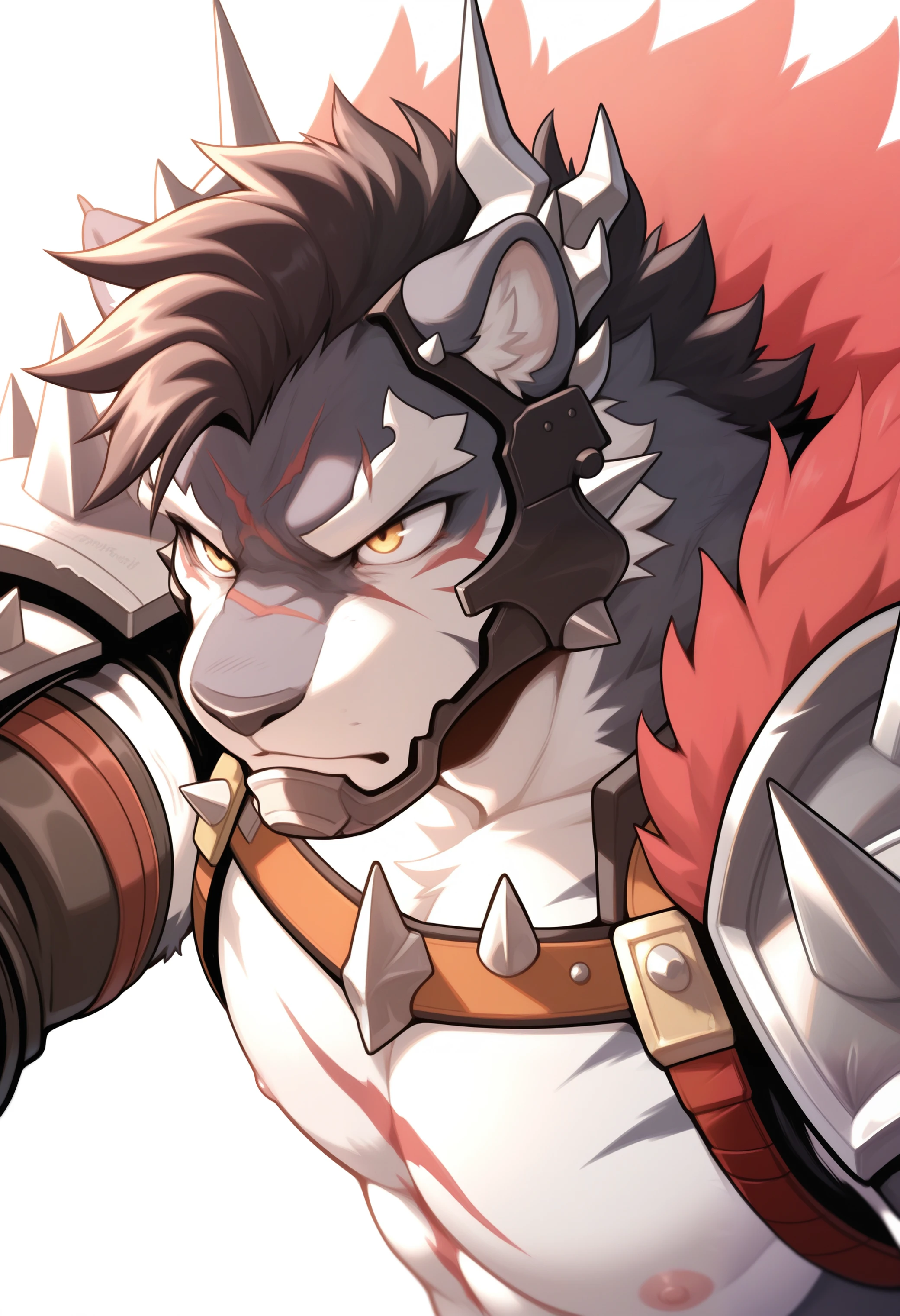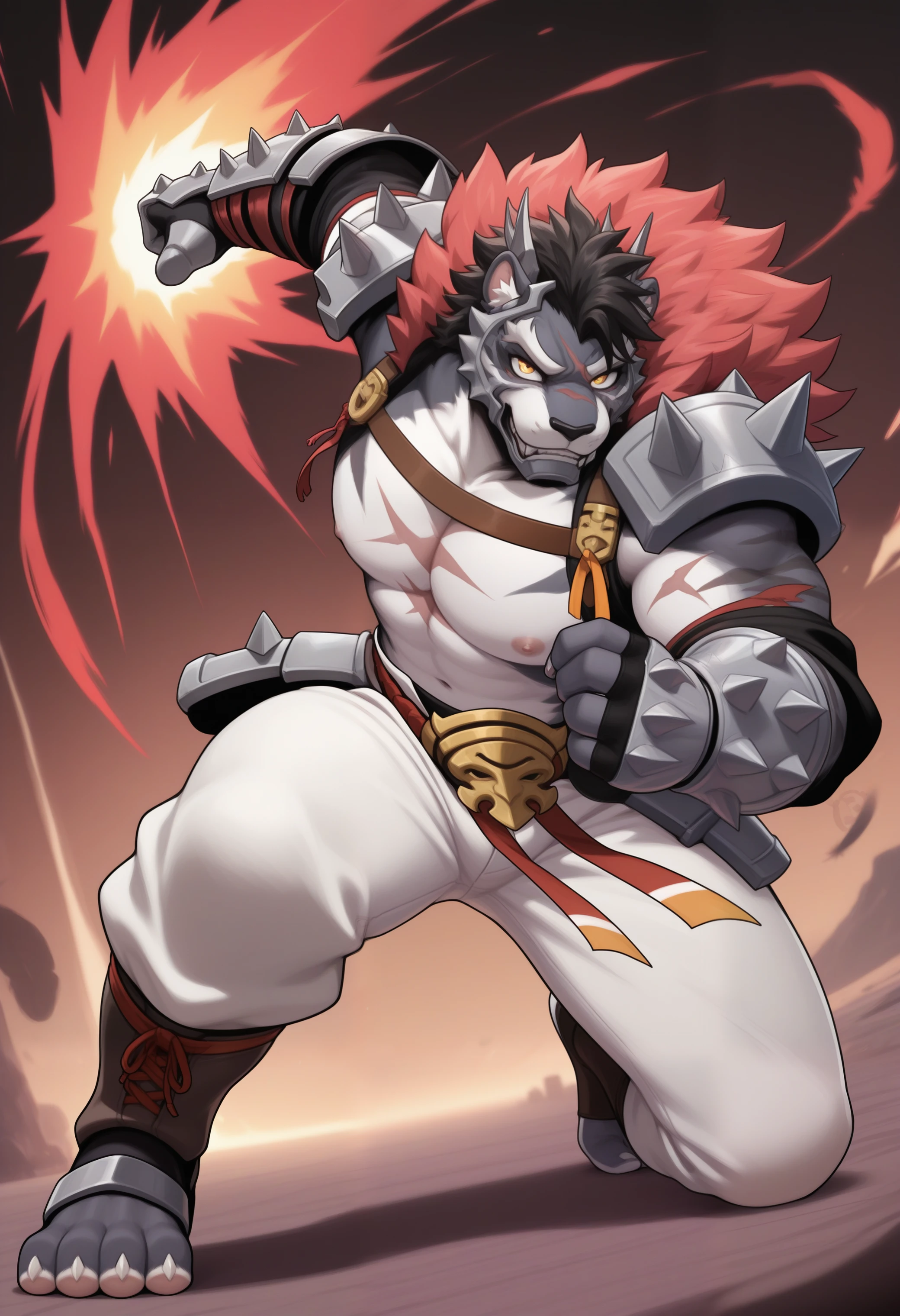 Ravager Outfit: face armor, red feathers, gauntlets, spiked armor, spiked pauldrons, white pants,