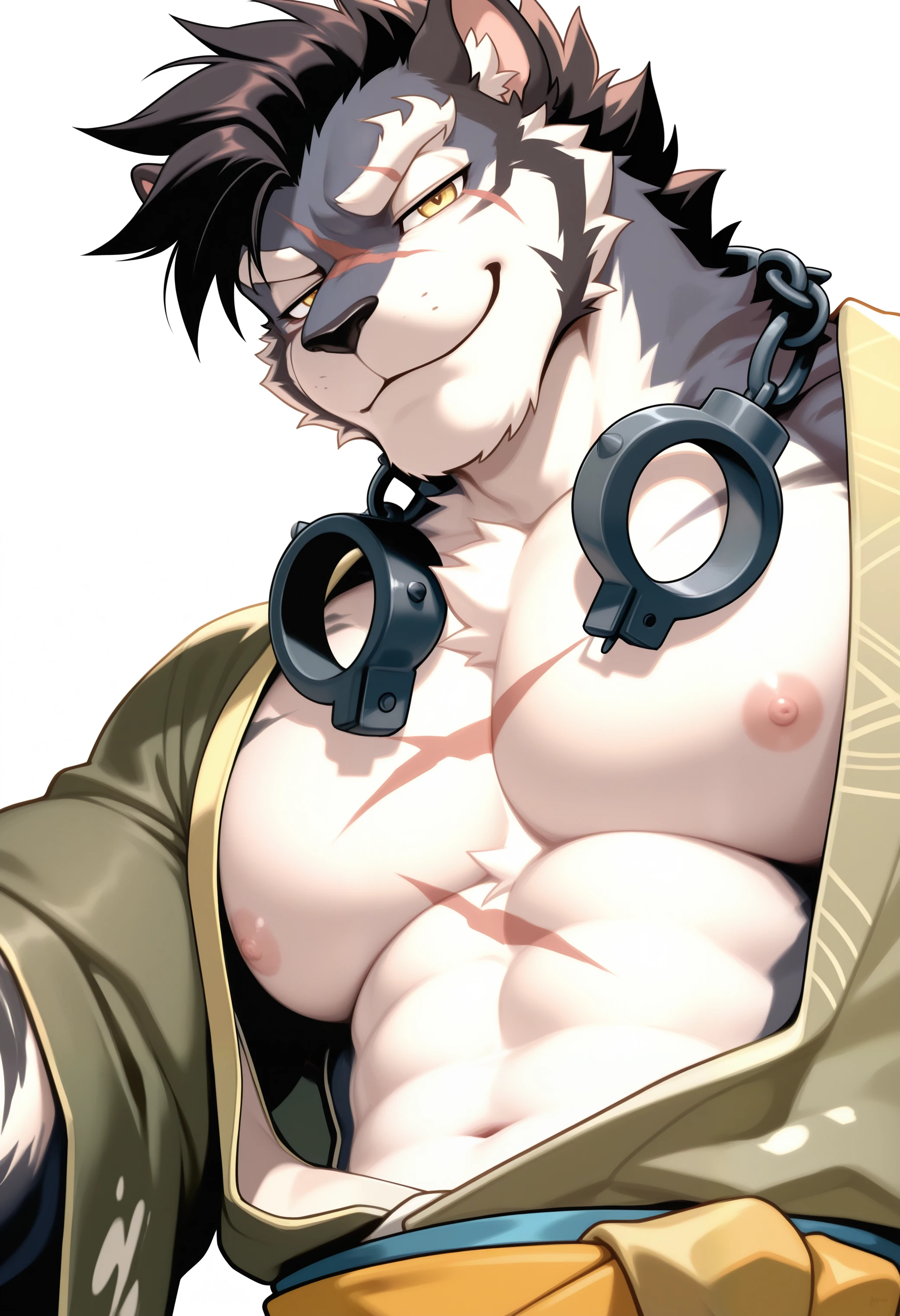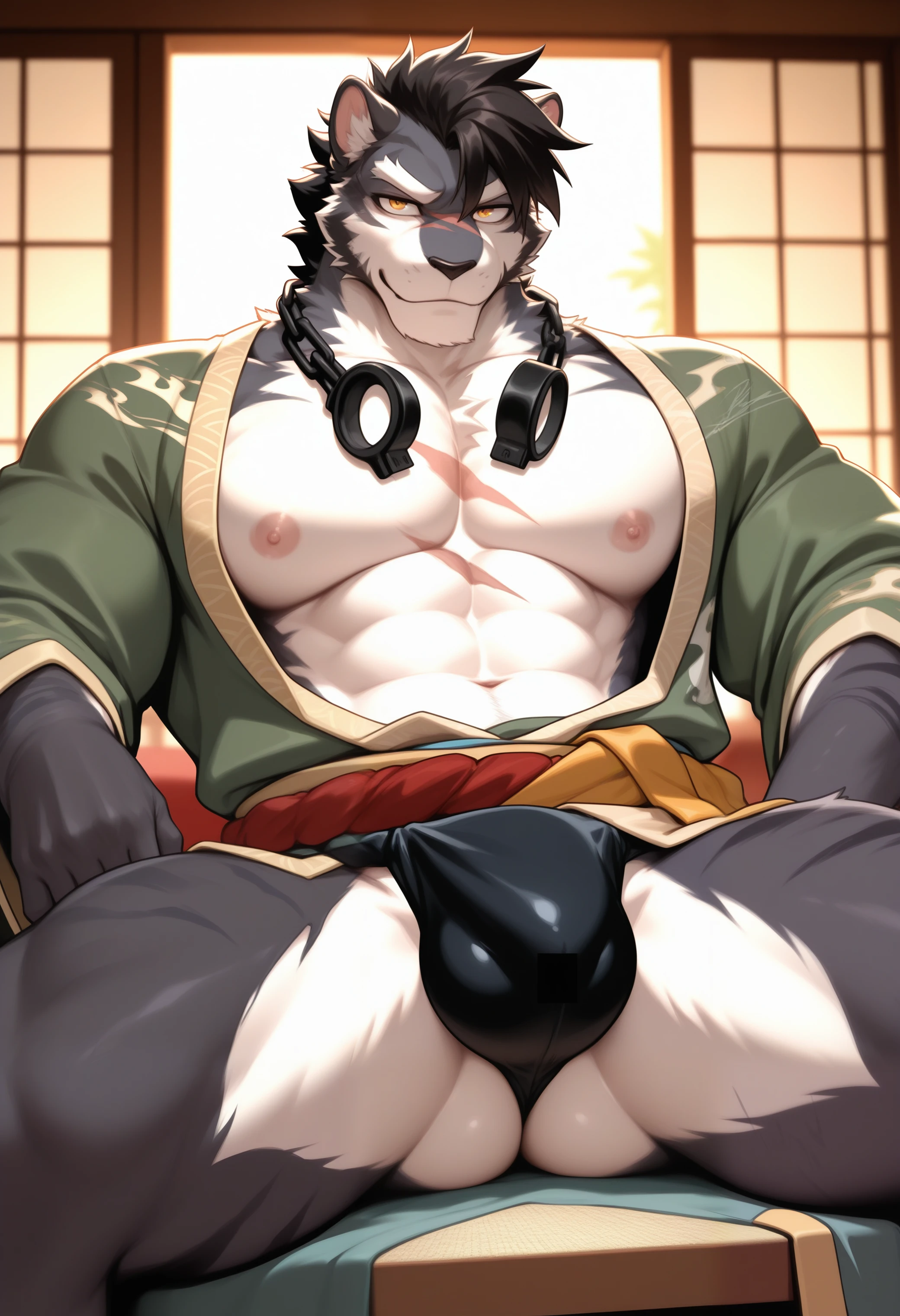 Kemono Outfit: green kimono, open kimono, black fundoshi, handcuffs around neck,