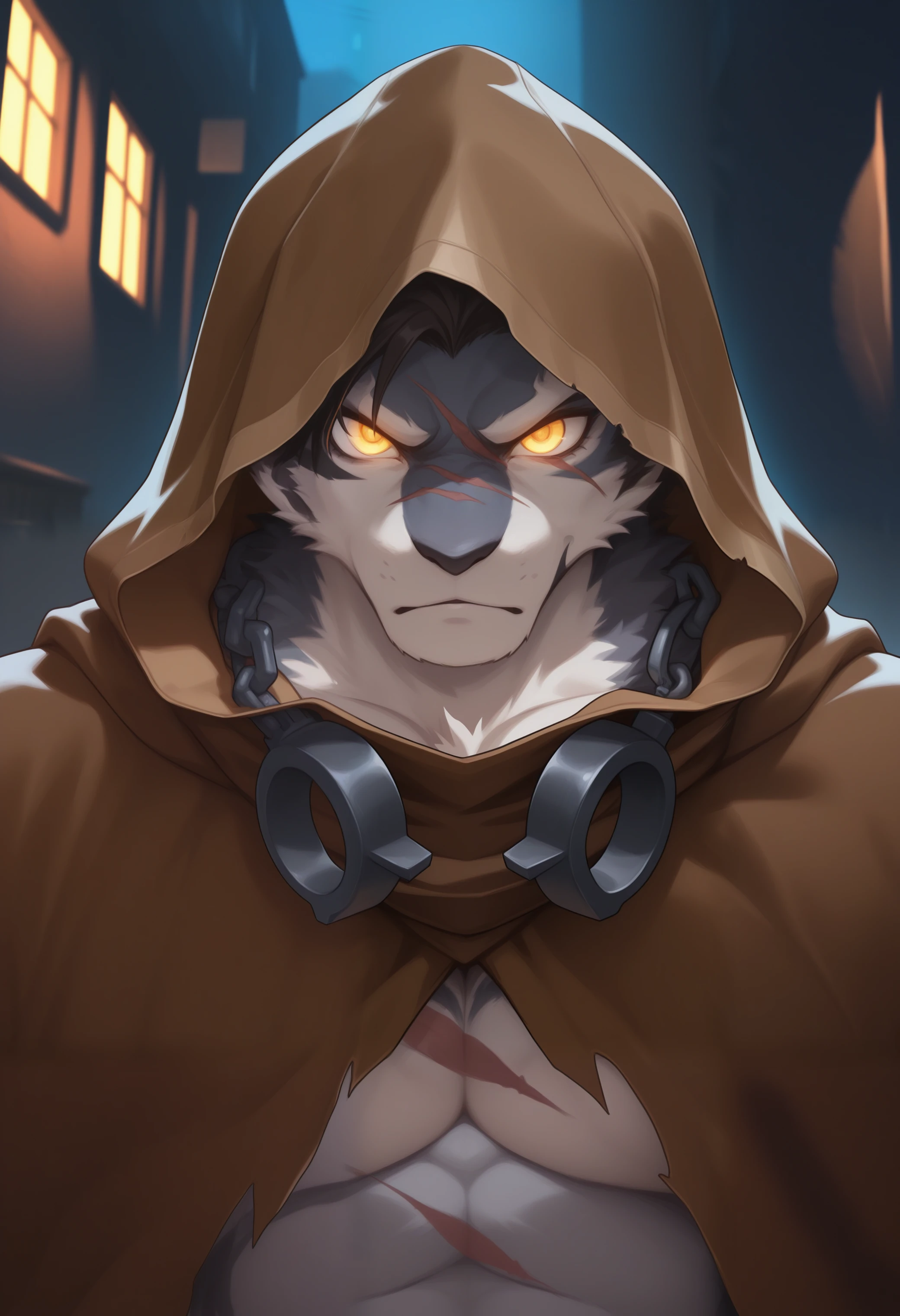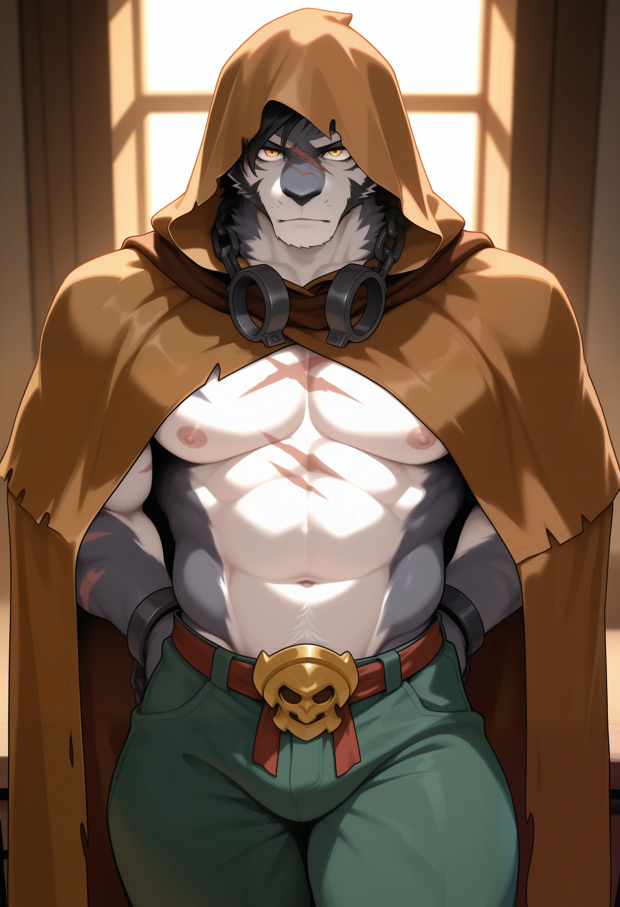 Nightcrawler Outfit: brown cloak, handcuffs around neck, red_fundoshi,