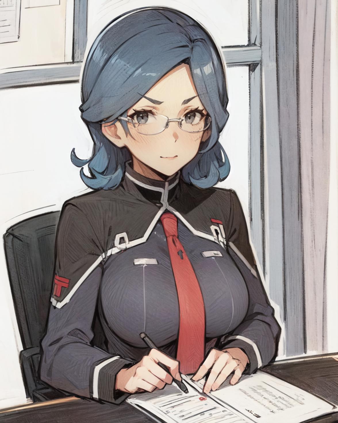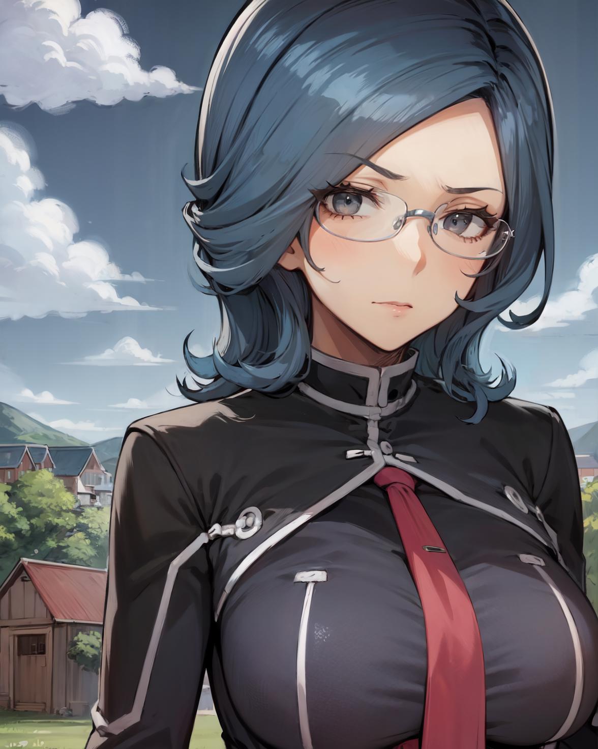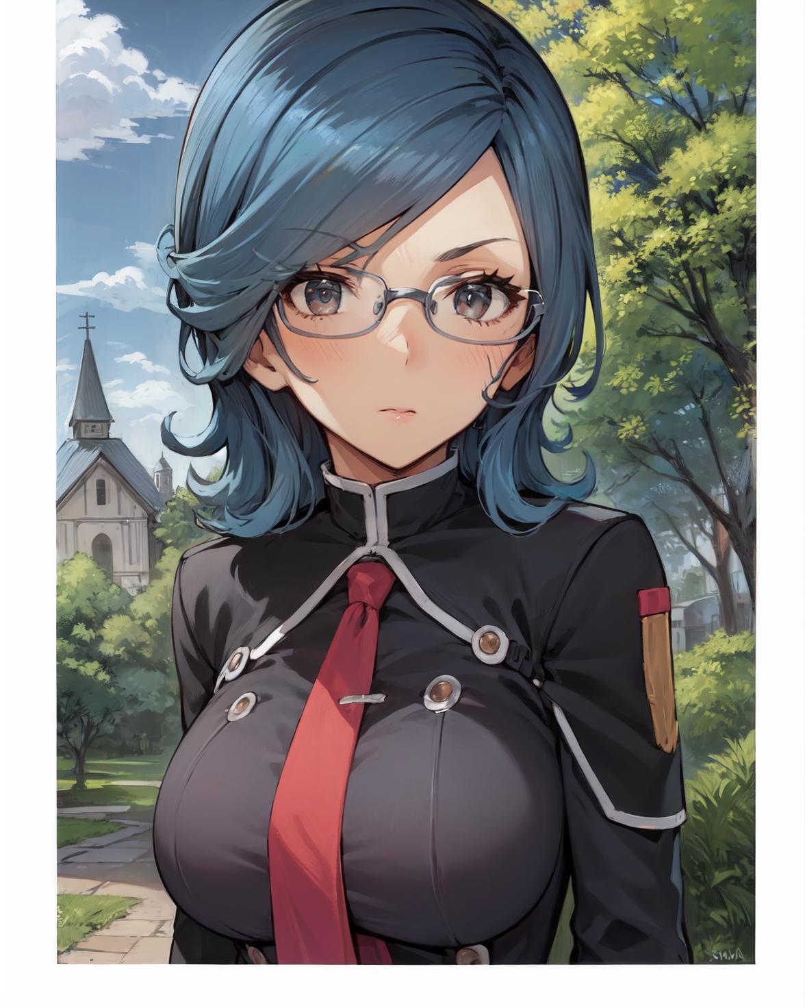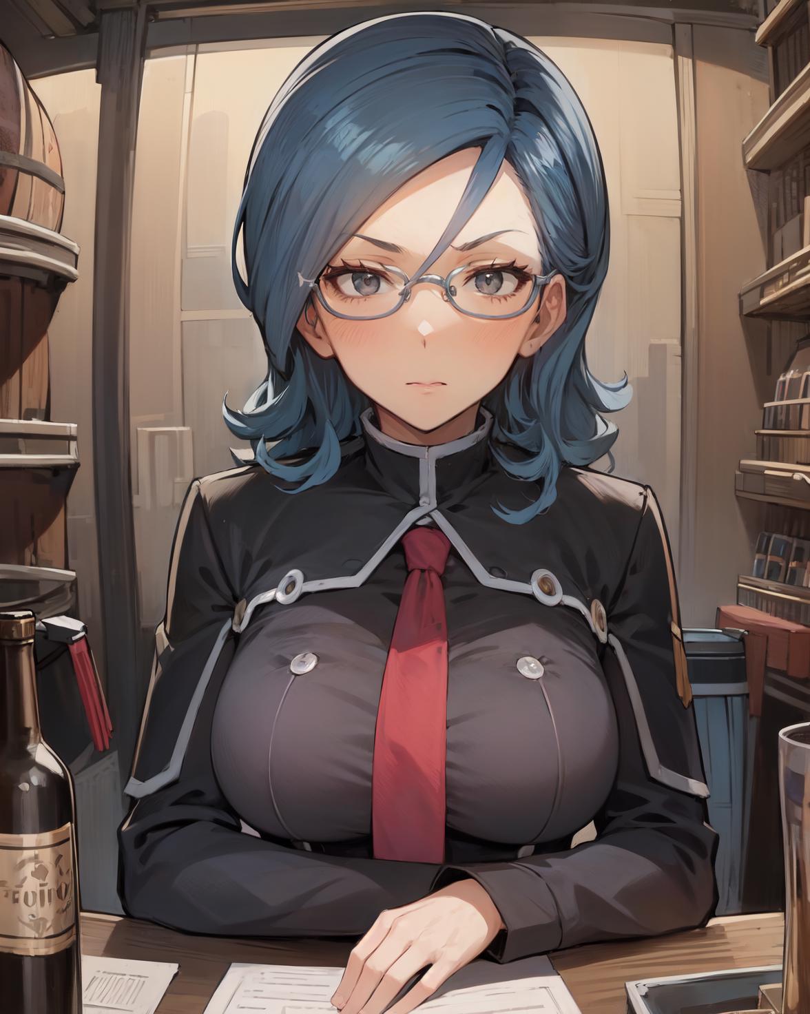 <lora:SonyaV2-000009:1>, Sonya Baelz, blue hair, medium hair, grey eyes, large breasts, half-frame glasses, gray glasses,