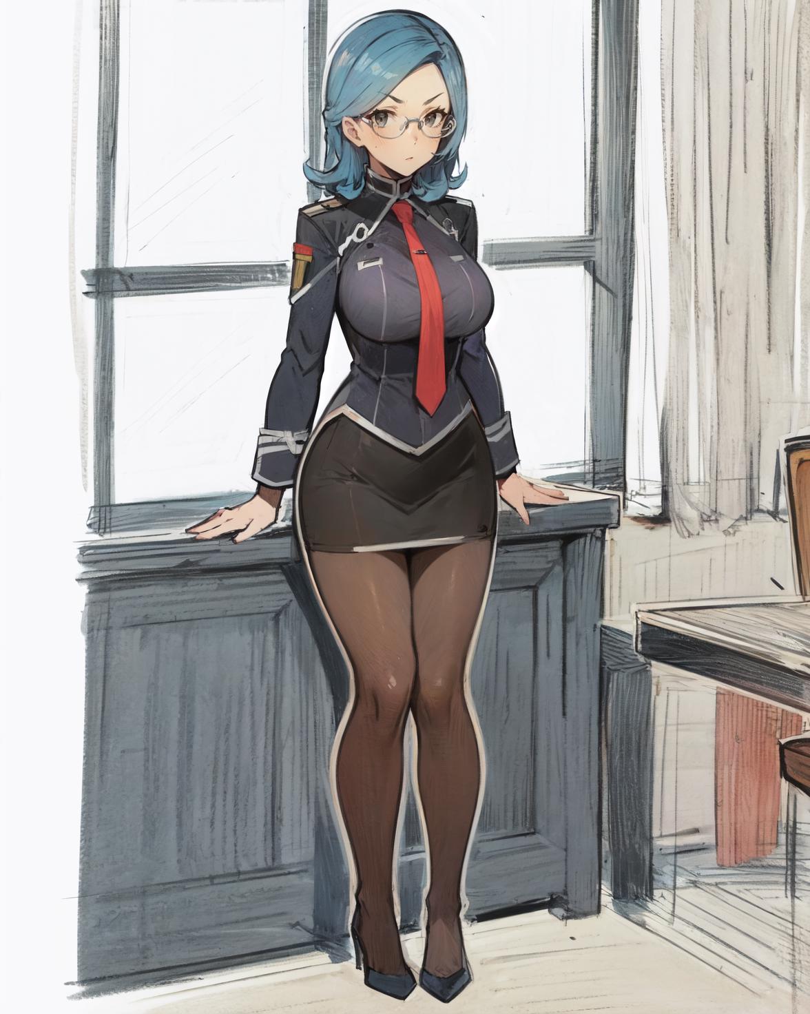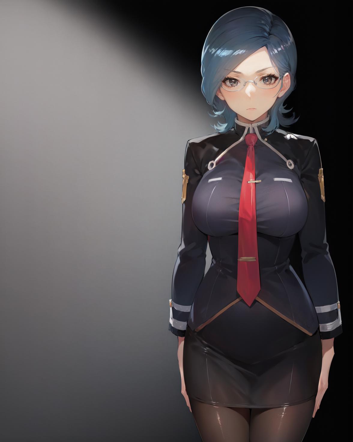uniform, grey suit, black skirt, pencil skirt, black pantyhose, grey high heels, red necktie,You can lower the lora weight for more background detail in exchange for less outfit accuracy.