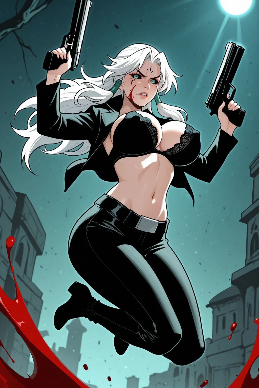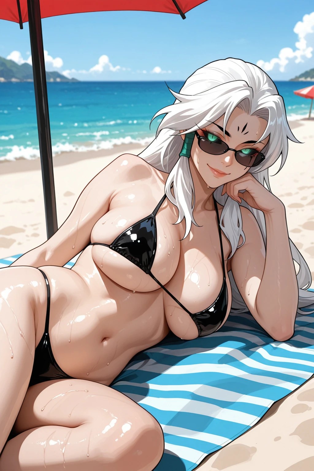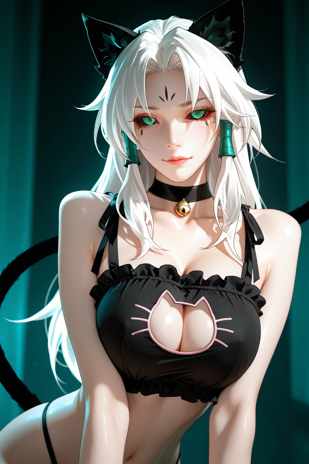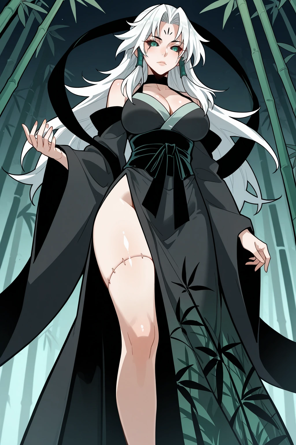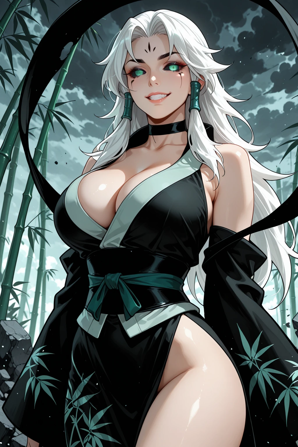 • Trigger Zombie : SprtLrd, demon, long hair, white hair, curtained hair, forehead mark, colored sclera, black sclera, green pupils, facial Tattoo, side braids, hair tubes, choker, halterneck, black shawl, cleavage, detached sleeves, japanese clothes, bamboo print, wide sleeves, obi, side slit, stitched leg
