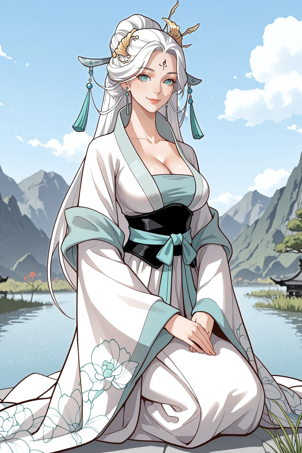 • Trigger : SprtLrd, fairy, long hair, white hair, parted bangs, half updo, hair bun, hair Ornament, hair stick, Tassel hair Ornament, forehead writing, aqua eyes, earrings, hanfu, Flower print, Shawl, corset, belt, waist ribbon, wide sleeves