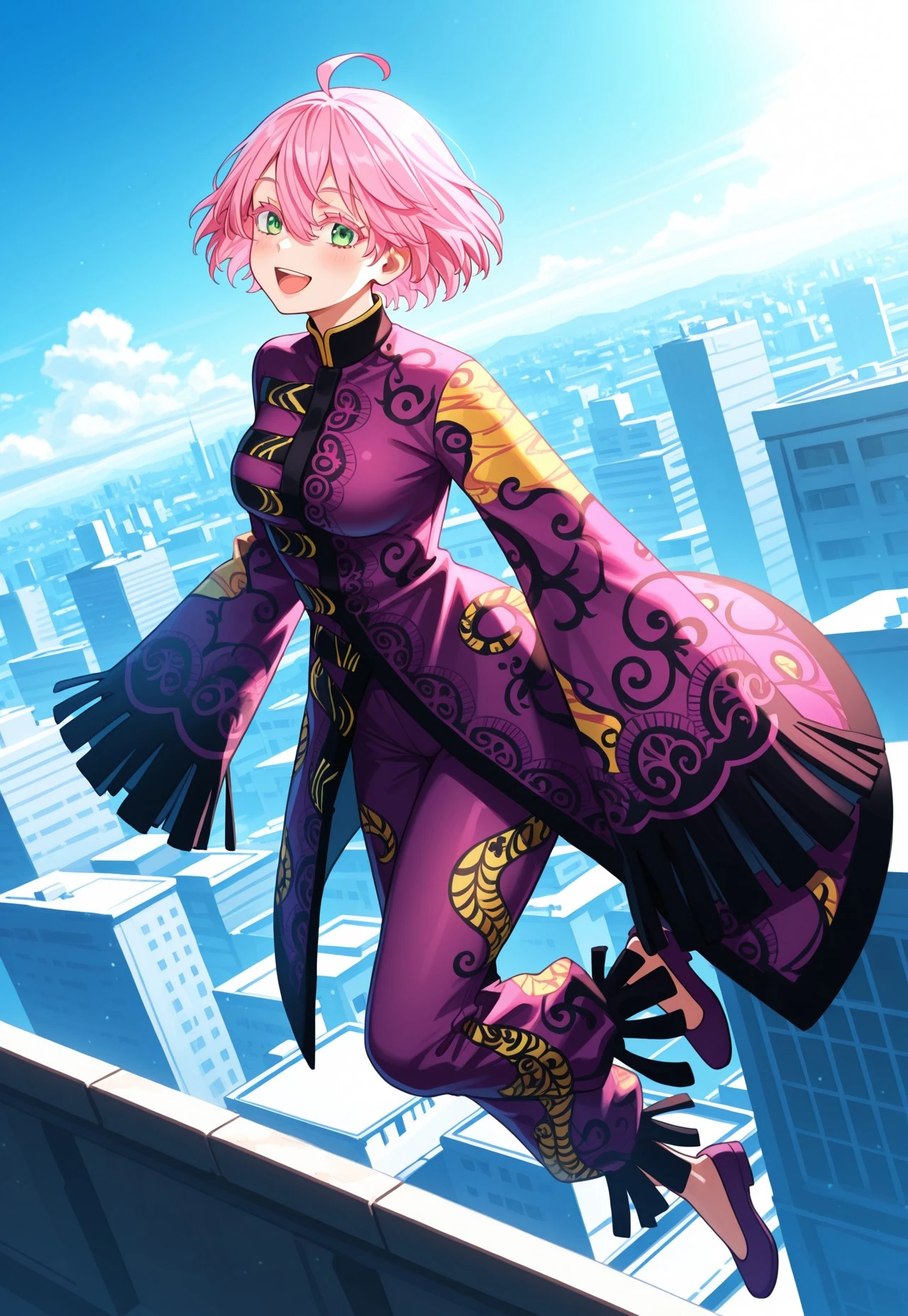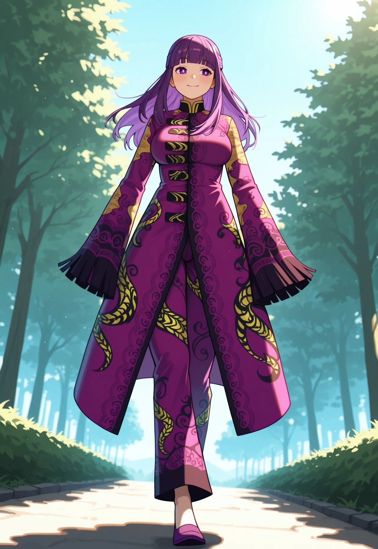 print coat, long coat, sleeves past fingers, wide sleeves, fringe trim, harem pants, print pants, purple flats,