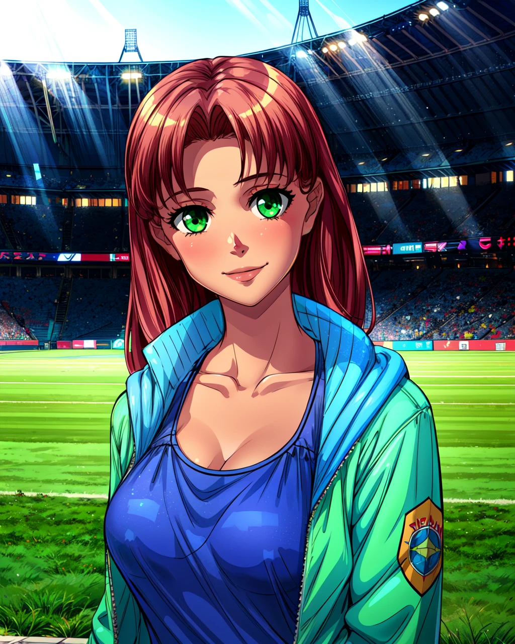 blolga, green eyes, brown hair, white shirt, red badge on shirt, red bow-tied neckerchief, leather belt, blue skirt
