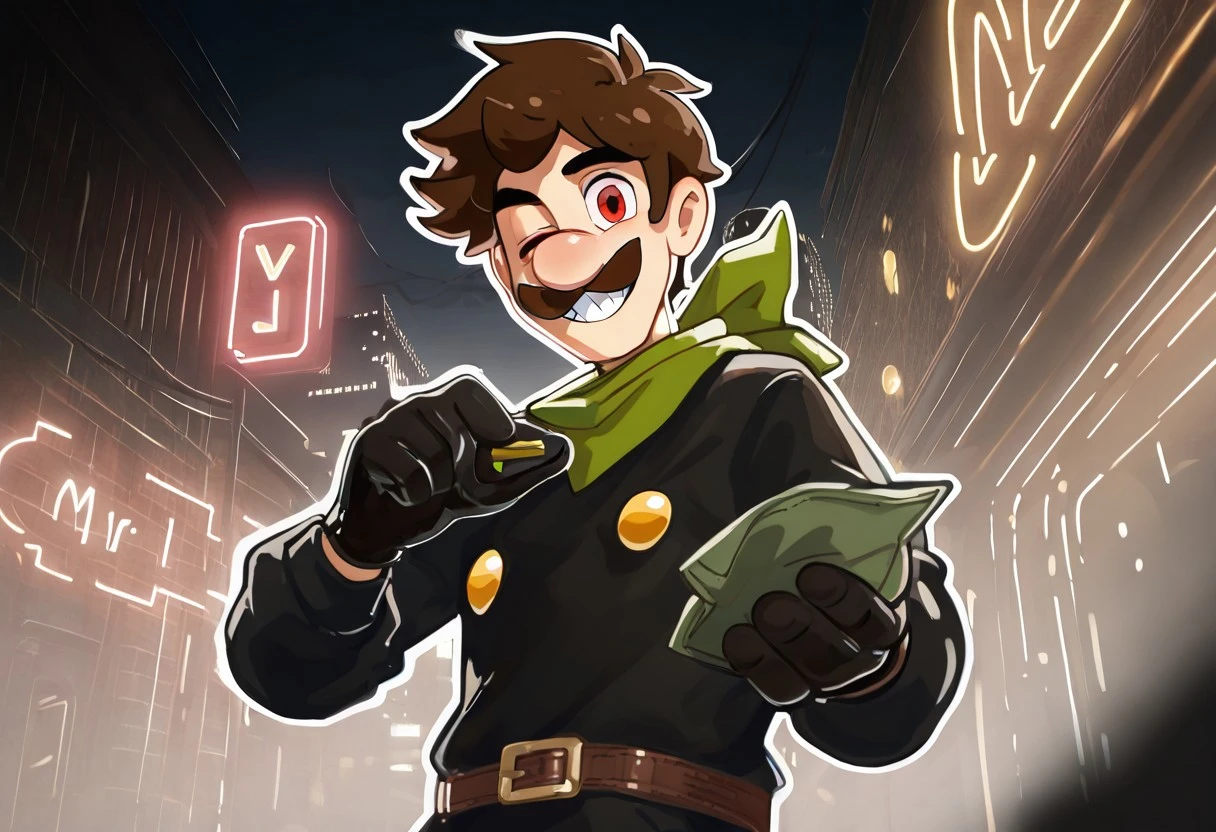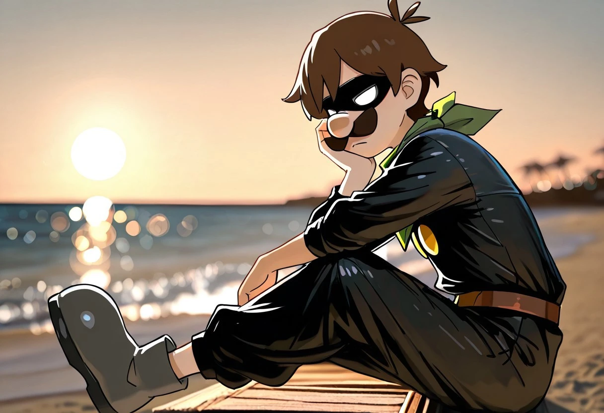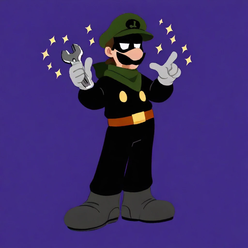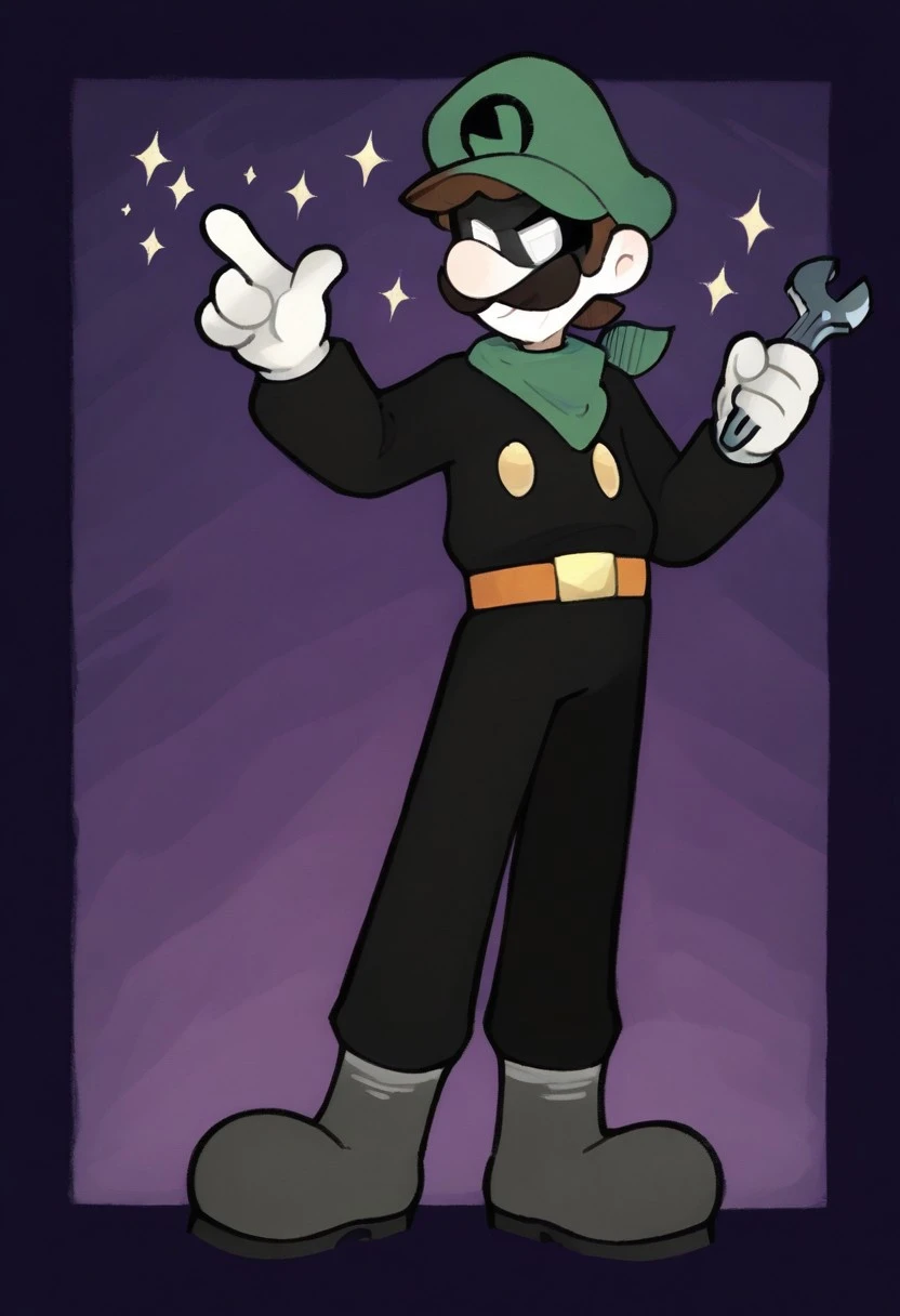 Black jumpsuit, green hat, domino mask, no pupils, white eyes, yellow buttons on chest, sturdy brown belt with a bright yellow buckle,gray boots ,handkerchief around neck, green handkerchief,