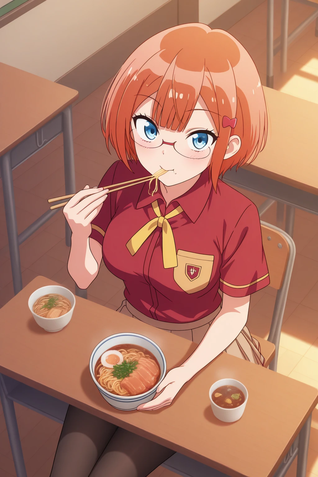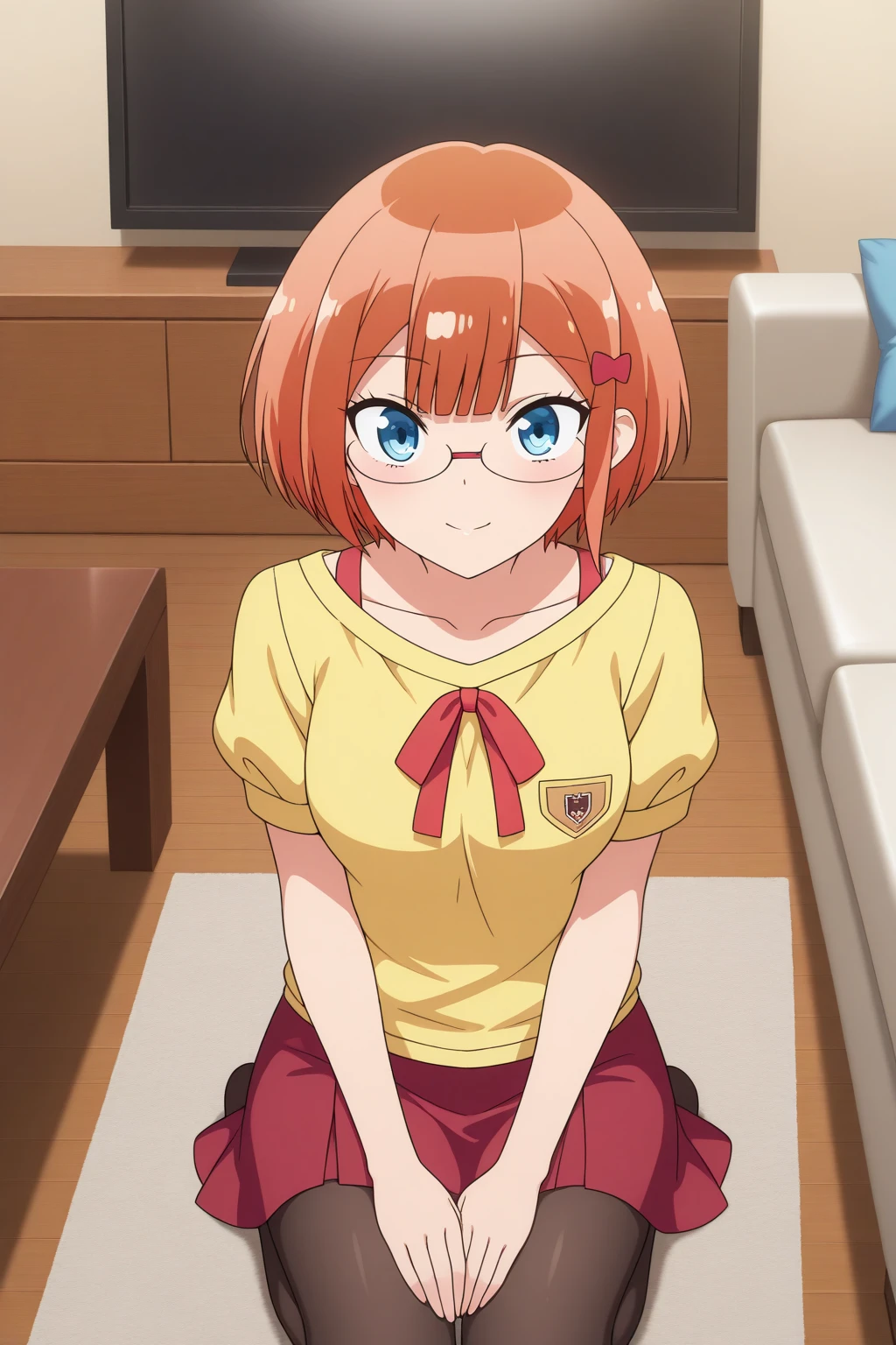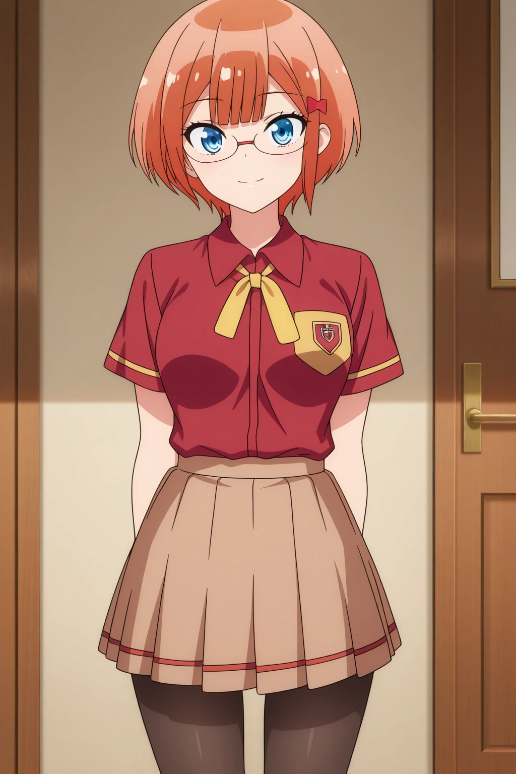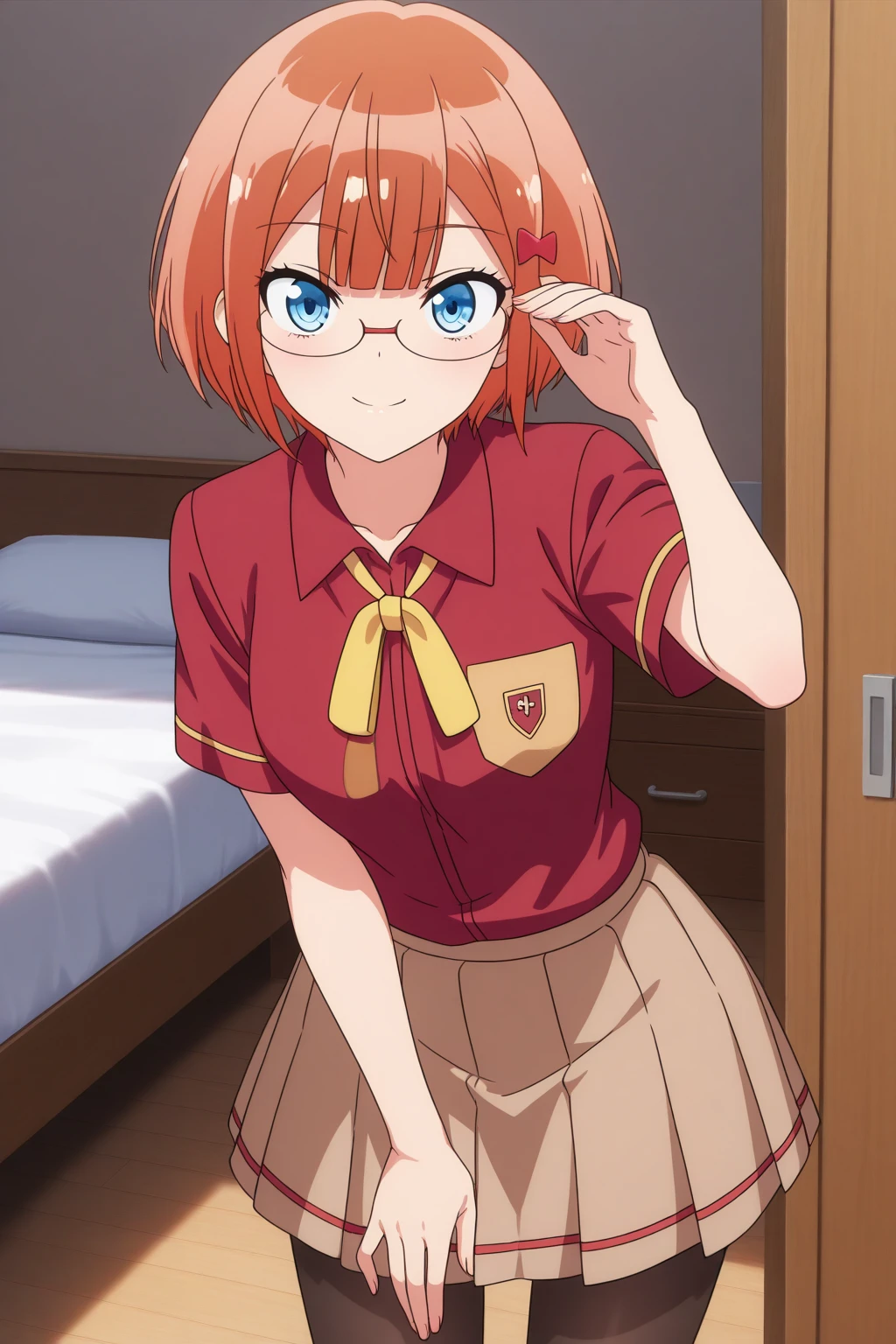 aarizu, blue eyes, glasses, orange hair, hair ornament, school uniform, yellow neck ribbon, red shirt, short sleeves, brown skirt, pleated skirt, black pantyhose, anime coloring,