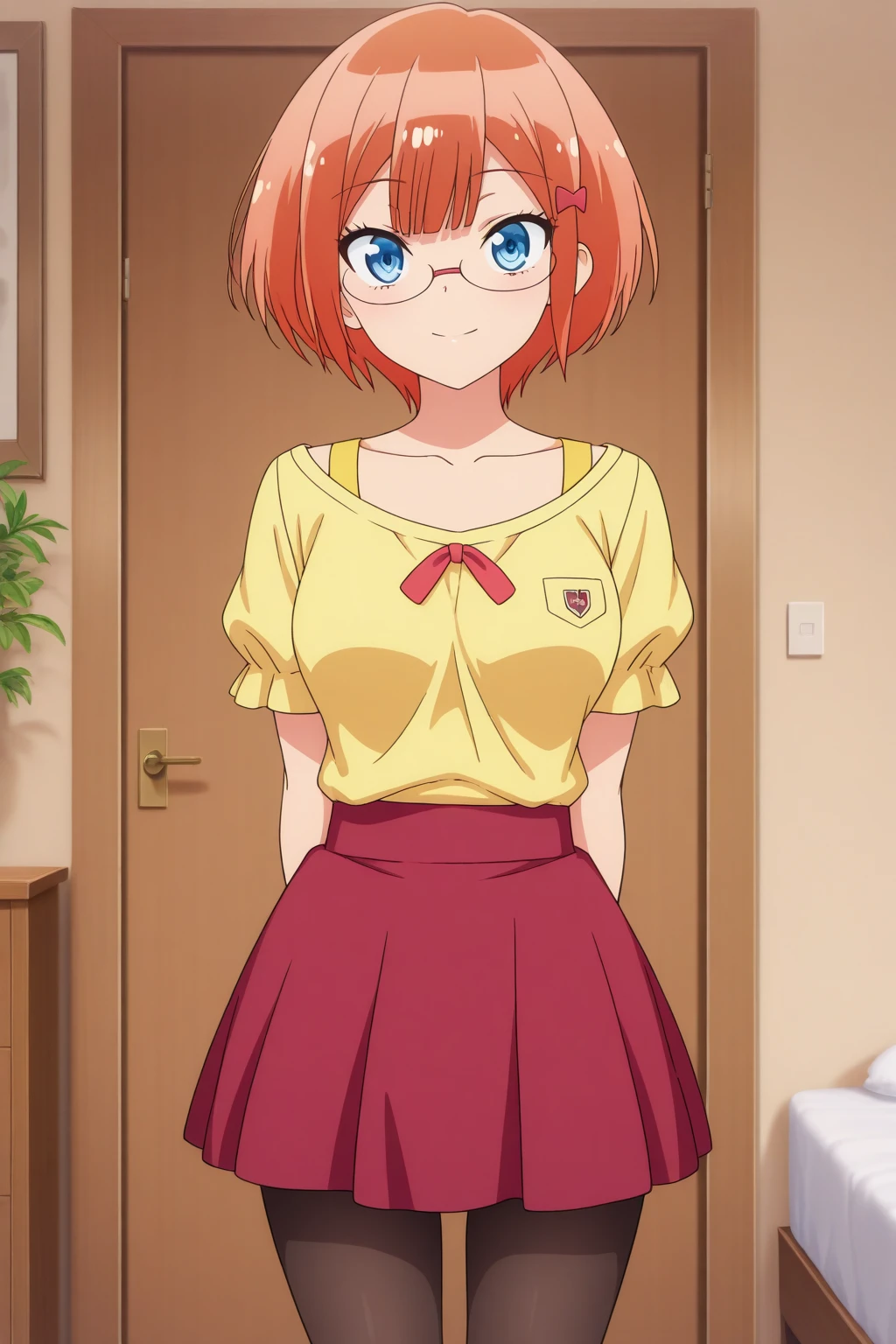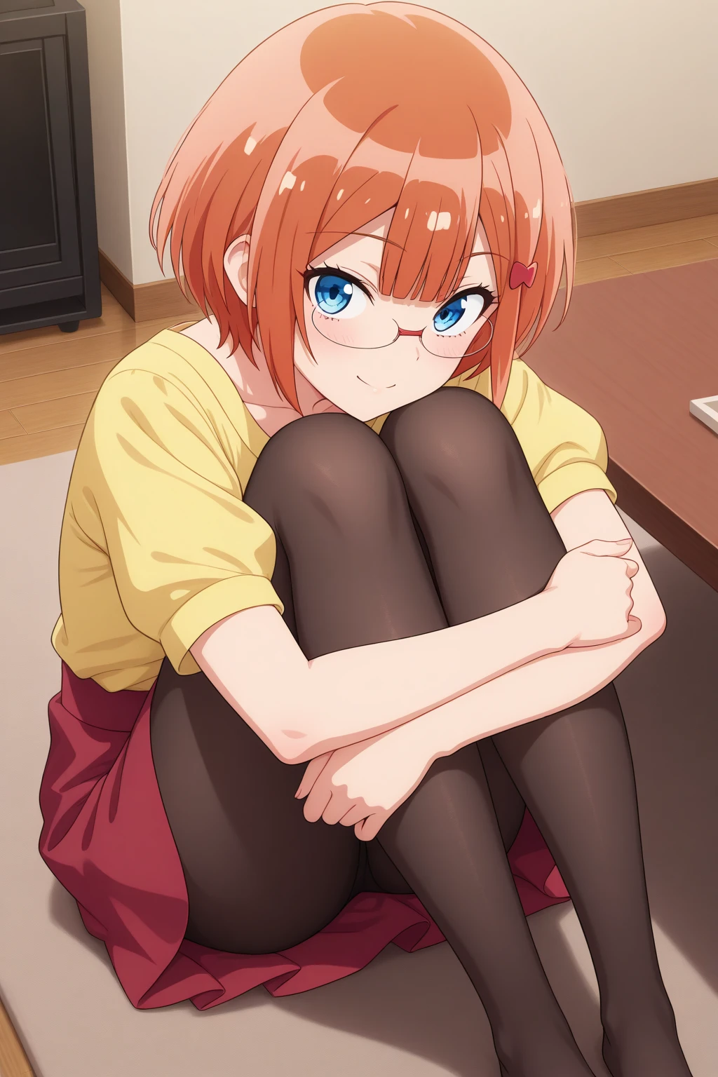 aarizu, blue eyes, glasses, orange hair, hair ornament, yellow shirt, red skirt, black pantyhose, anime coloring,