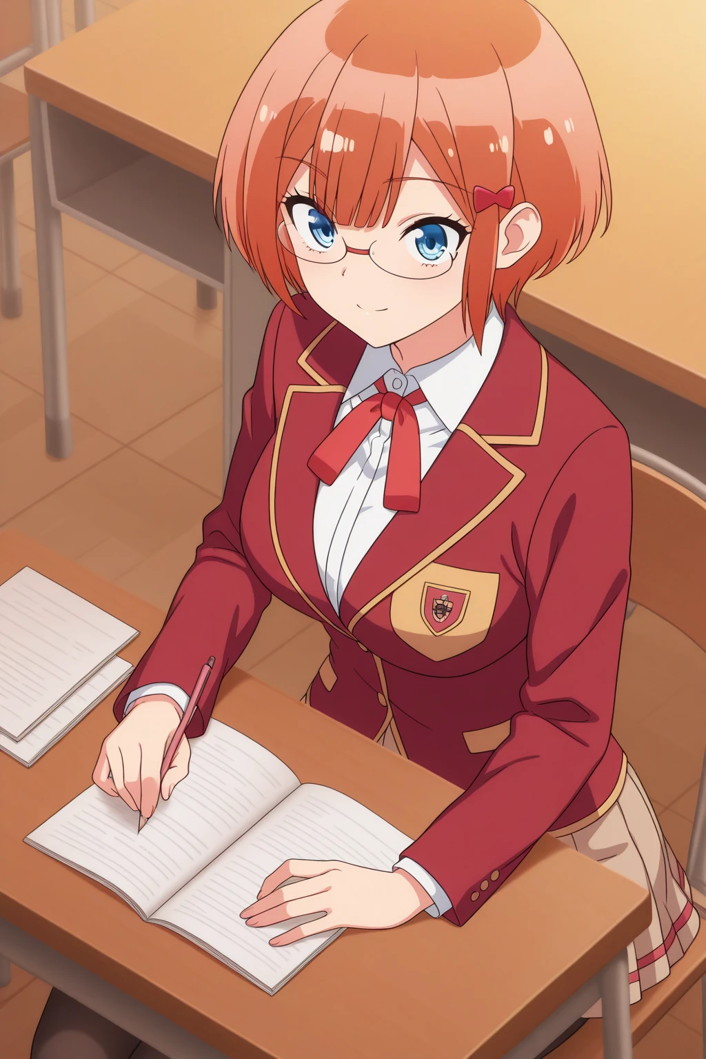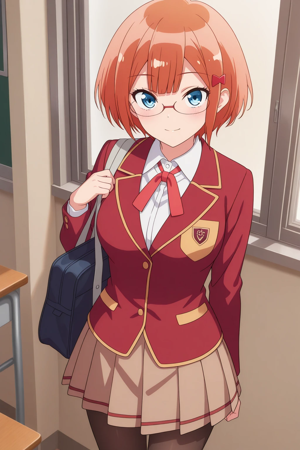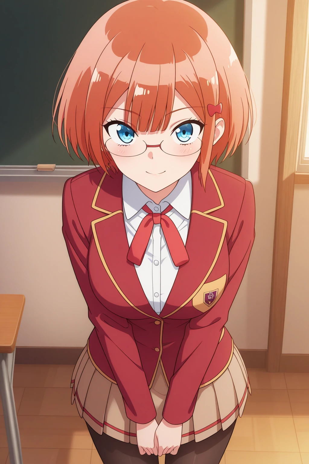 aarizu, blue eyes, glasses, orange hair, hair ornament, school uniform, red ribbon, neck ribbon, white shirt, red jacket, blazer, brown skirt, pleated skirt, black pantyhose, anime coloring,