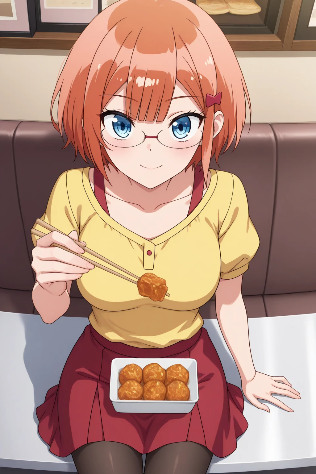 aarizu, blue eyes, glasses, orange hair, hair ornament, yellow shirt, red skirt, black pantyhose, anime coloring,Work Uniform: