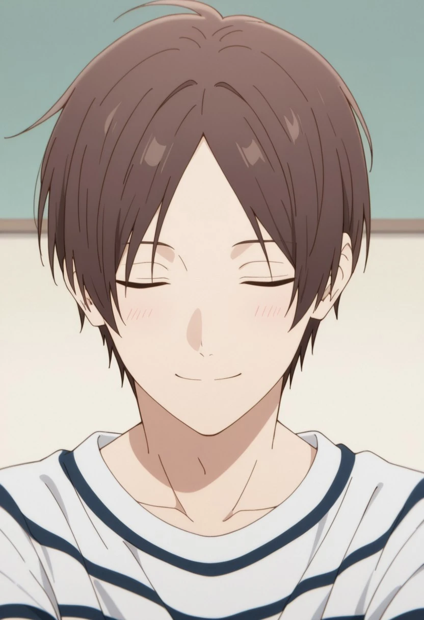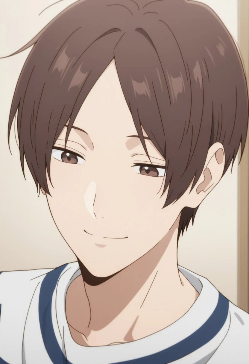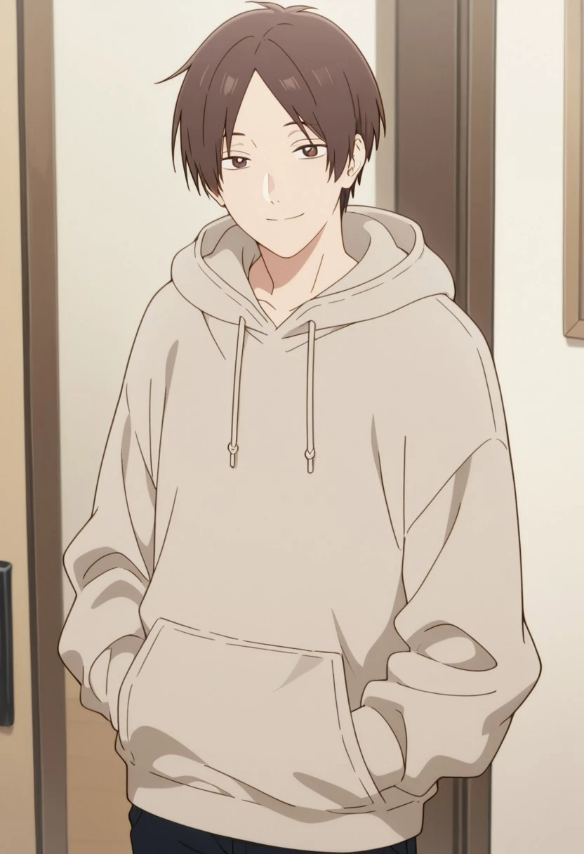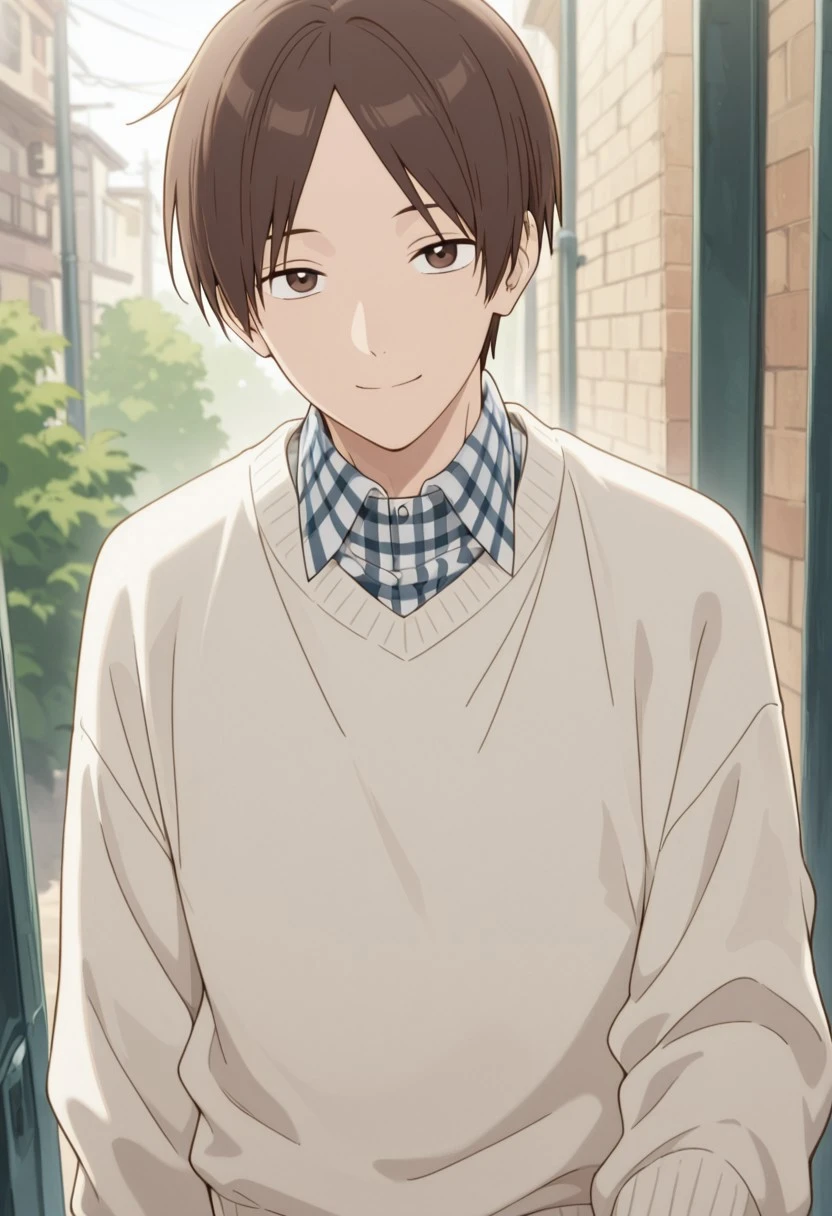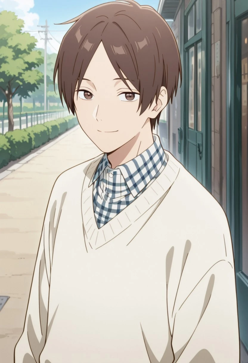 1boy, male focus, solo, brown eyes, brown hair, parted bangs, plaid shirt, collared shirt, white sweater, black pants, sneakers, white footwear,