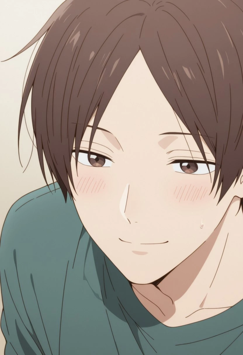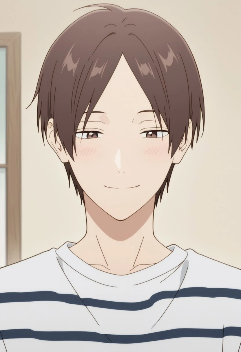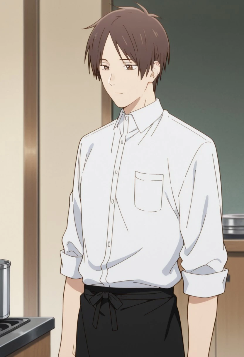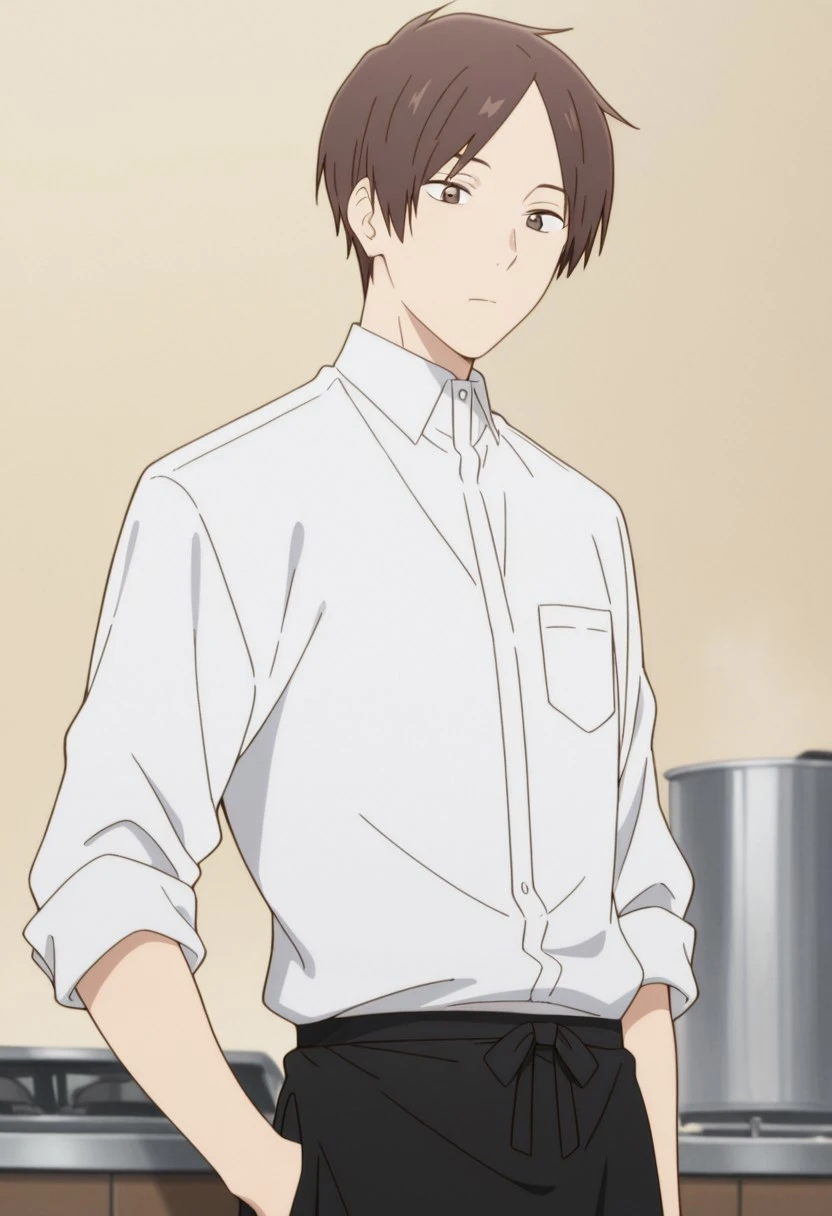 1boy, male focus, solo, brown eyes, brown hair, parted bangs, white shirt, collared shirt, sleeves rolled up, waist apron, black apron, black pants,