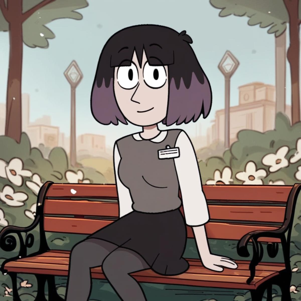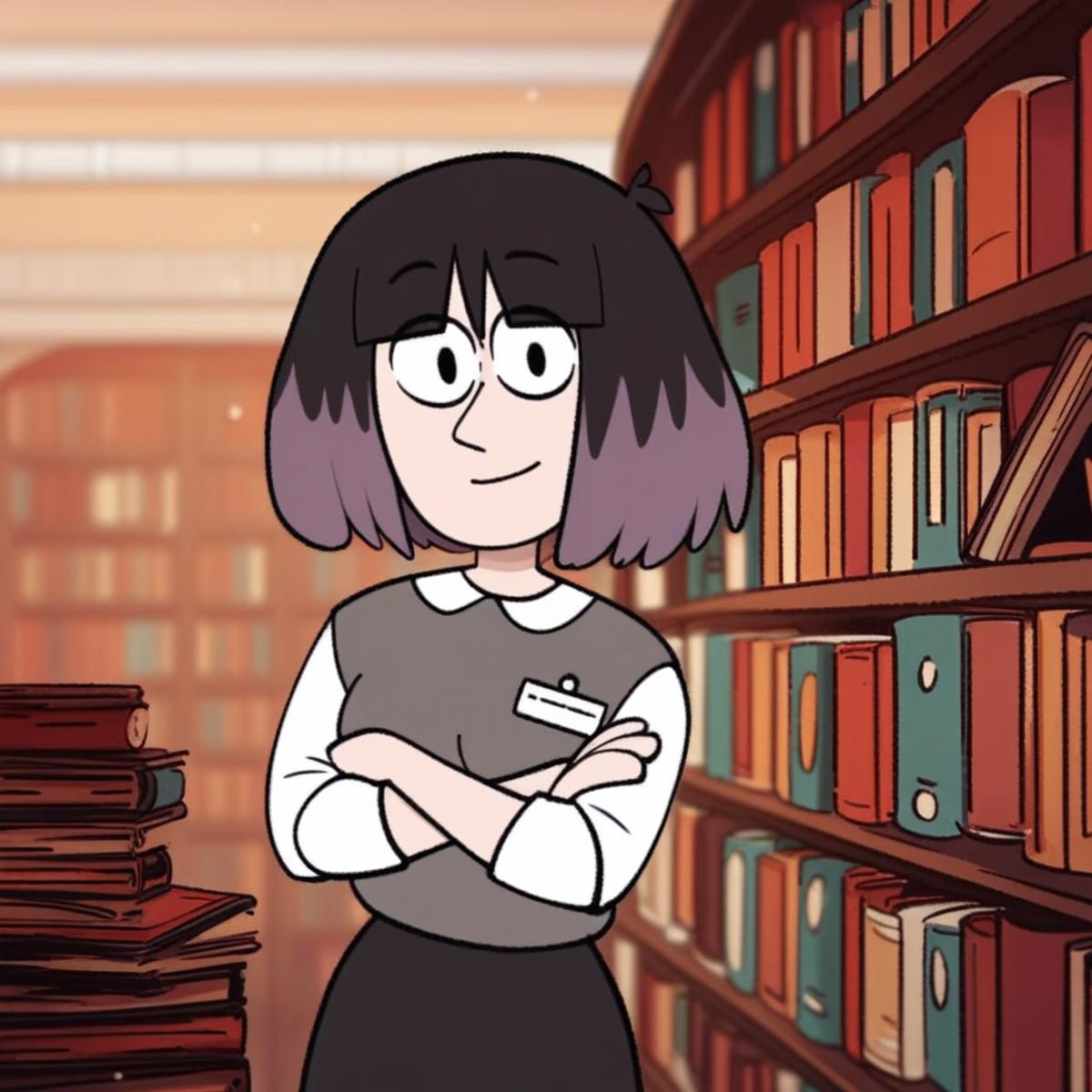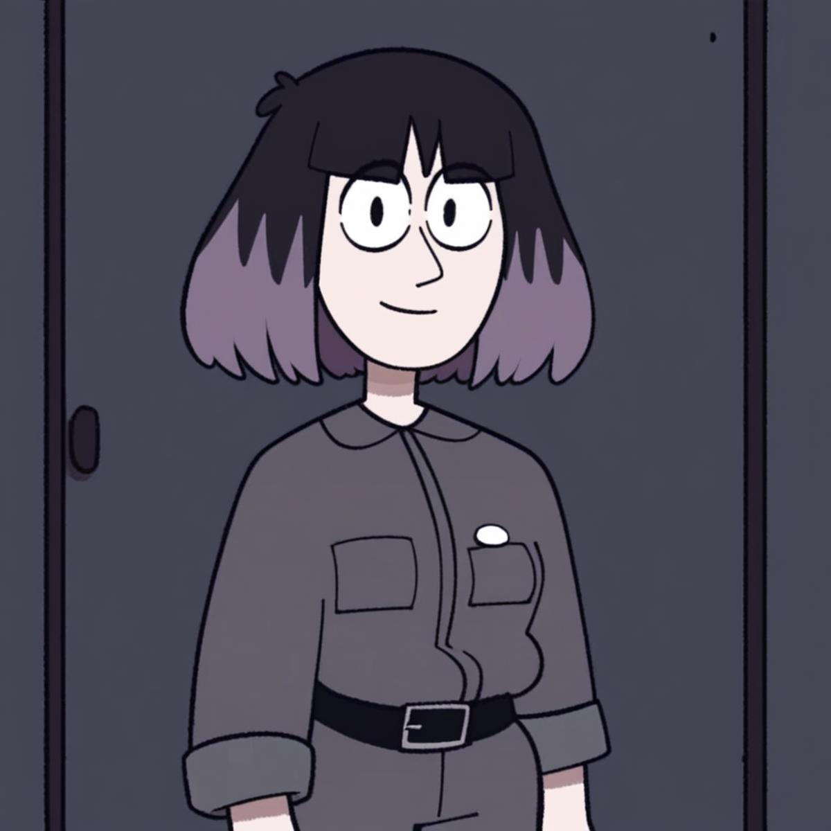 Ka1sa, purple and black hair, grey sweater vest, white blouse, black skirt, grey leggings, black cloak
