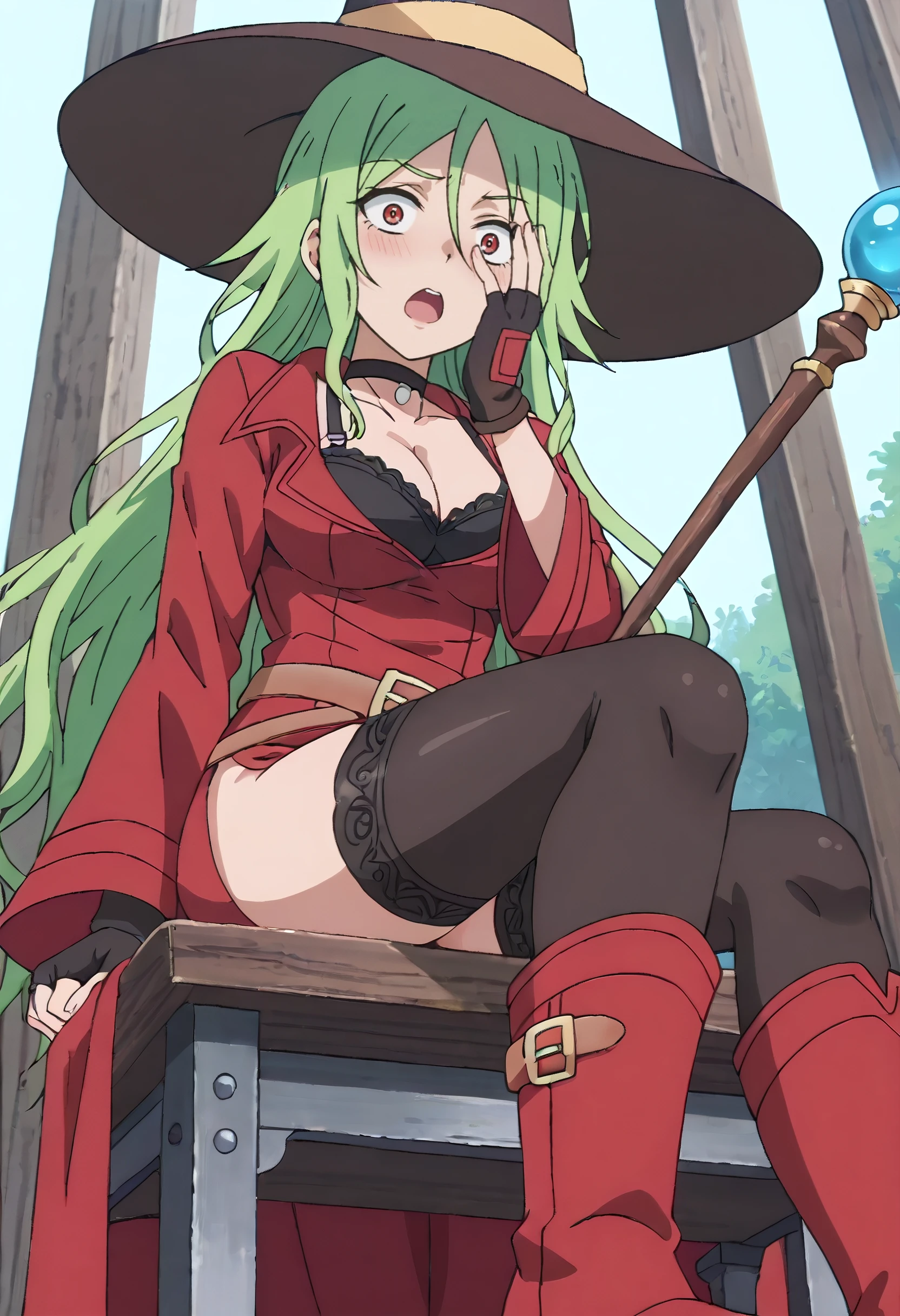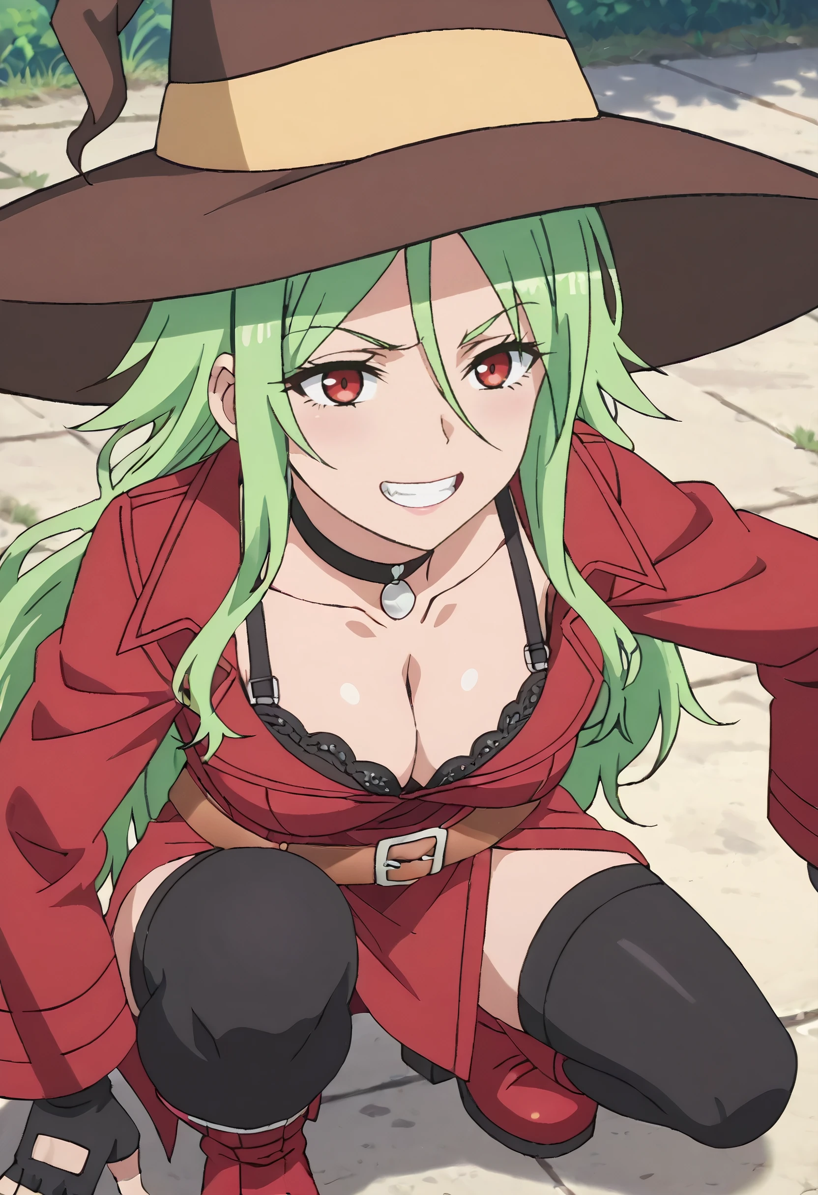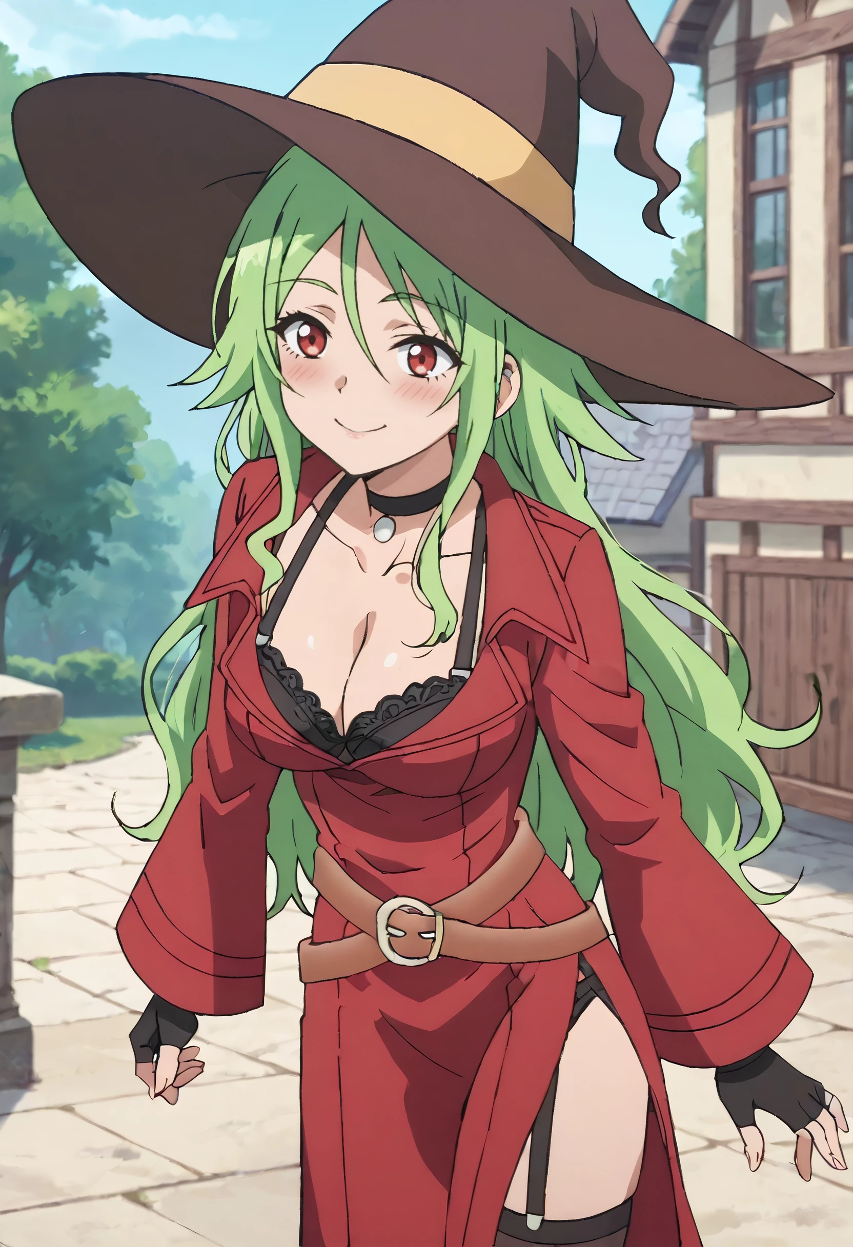 MimosaOutfit, hat, witch hat, witch, choker, cleavage, long sleeves, gloves, black gloves, black choker, belt, dress, red dress, fingerless gloves, jacket, red jacket, boots, black bra, bra, red footwear, thighhighs, black thighhighs, brown belt, wide sleeves, side slit,