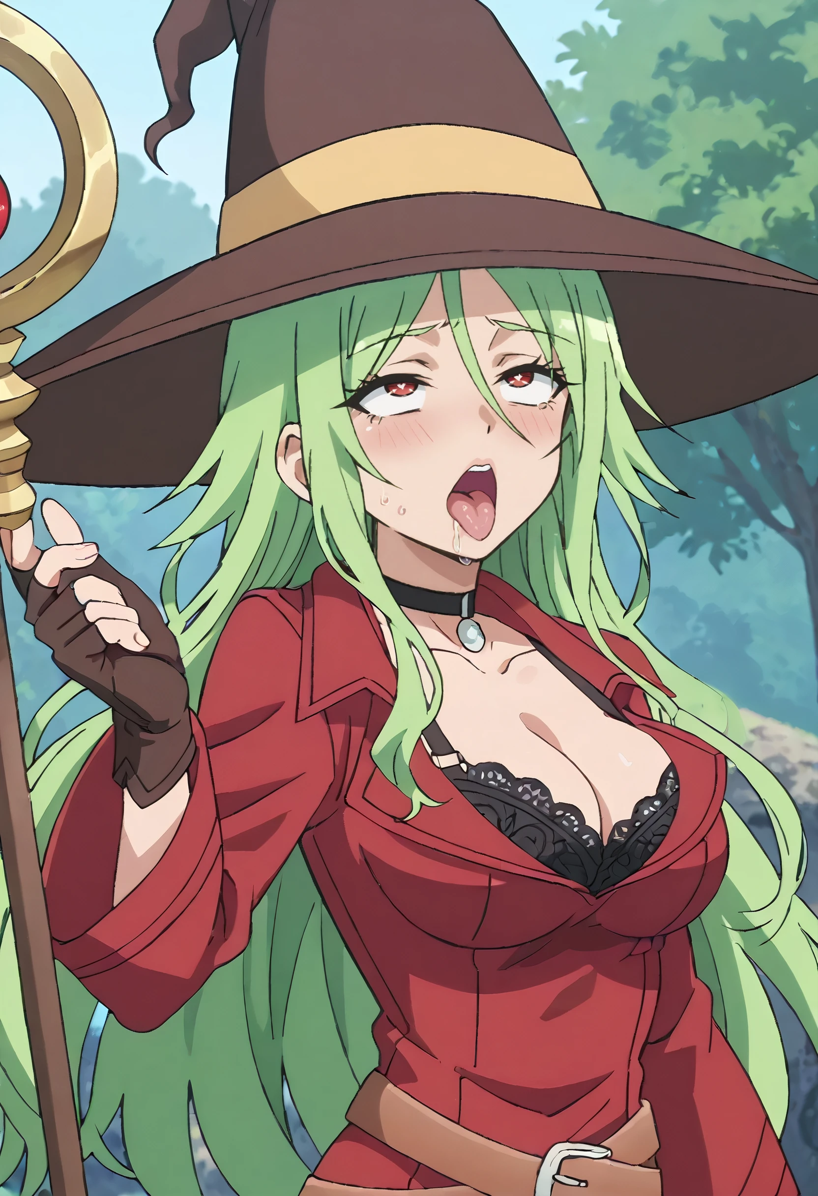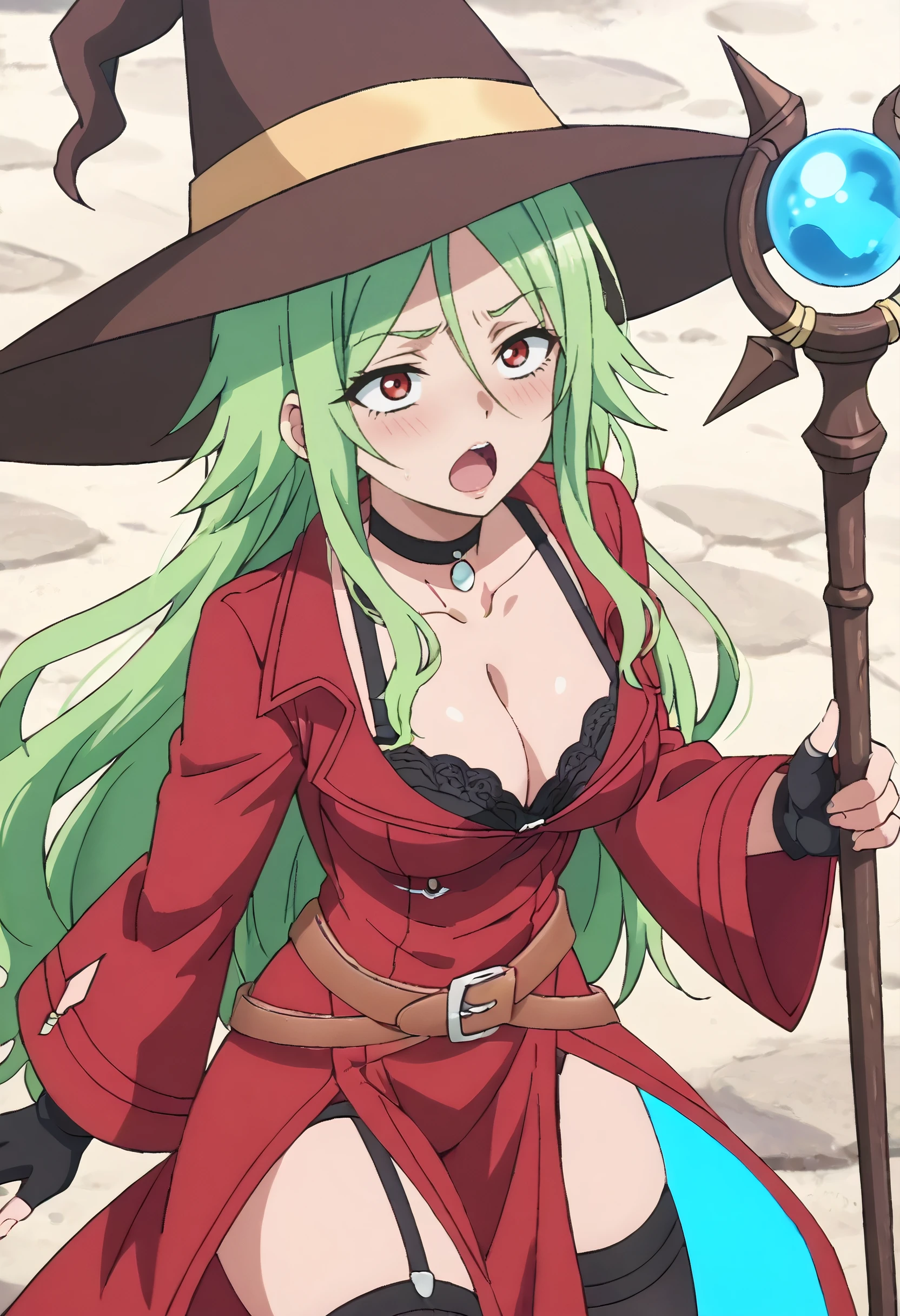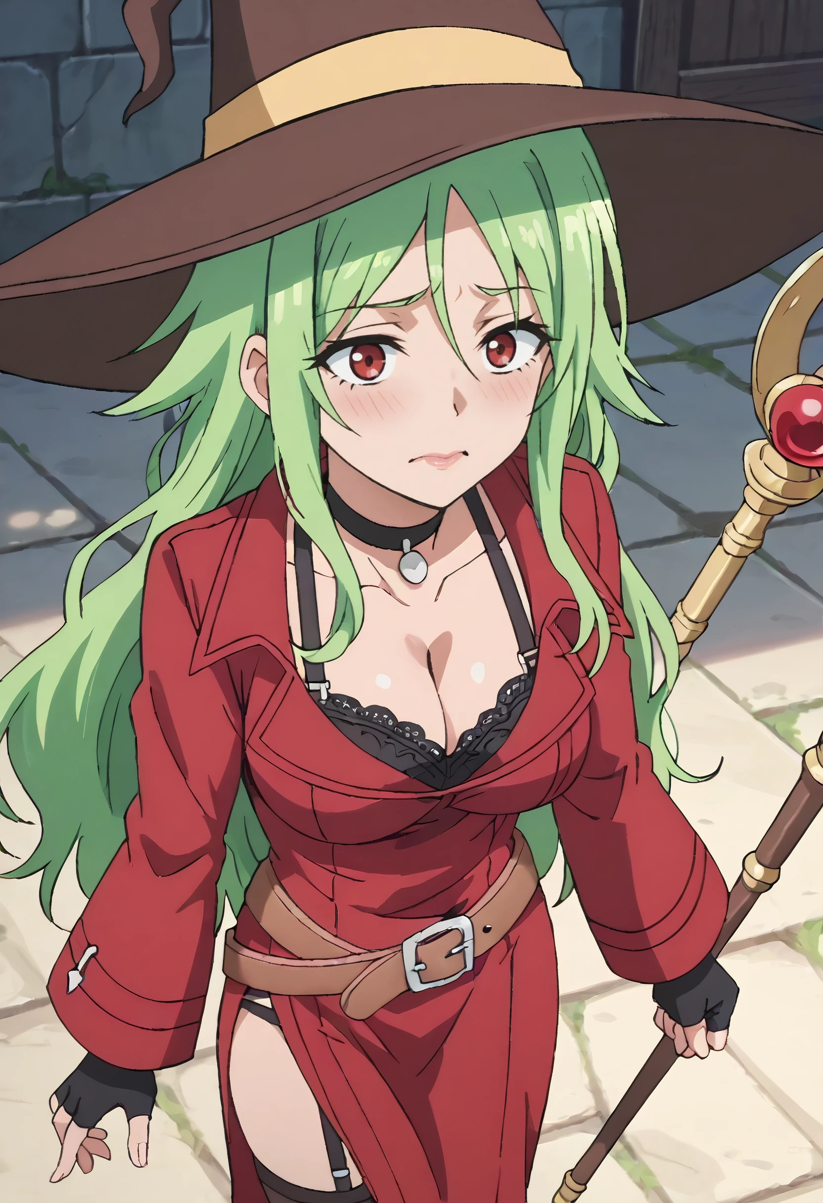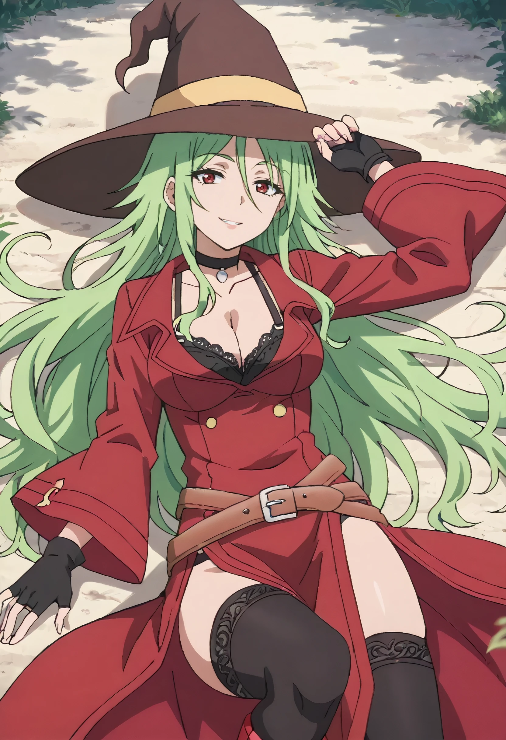 MimosaOutfit, hat, witch hat, witch, choker, cleavage, long sleeves, gloves, black gloves, black choker, belt, dress, red dress, fingerless gloves, jacket, red jacket, boots, black bra, bra, red footwear, thighhighs, black thighhighs, brown belt, wide sleeves, side slit,
