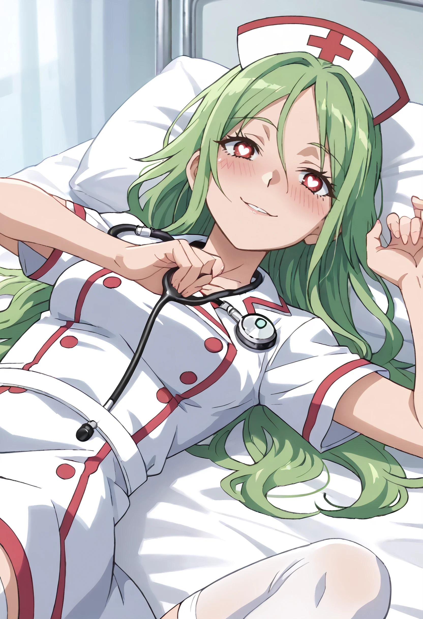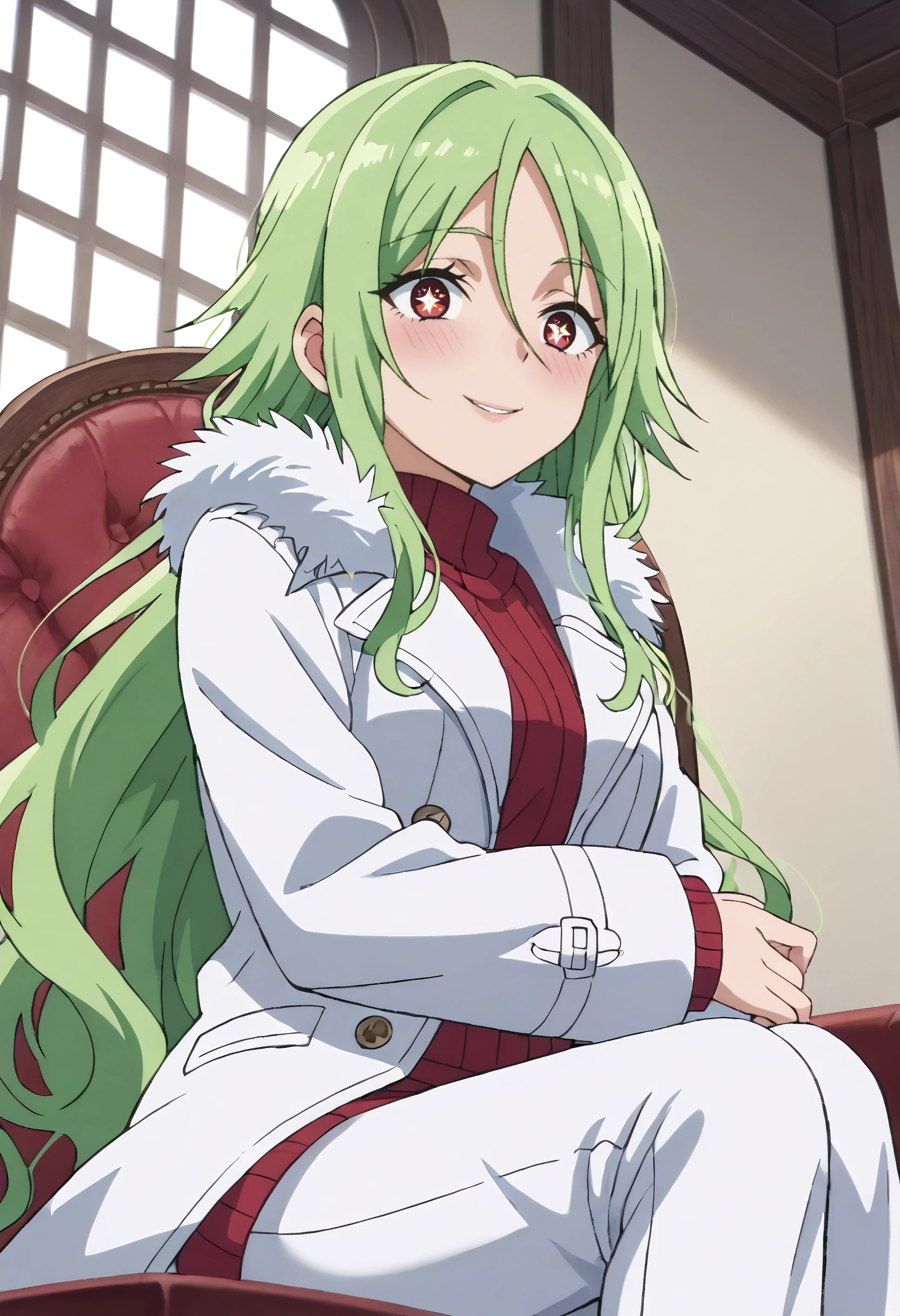 MOKMimosa, green hair, long hair, red eyes, hair between eyes, very long hair,