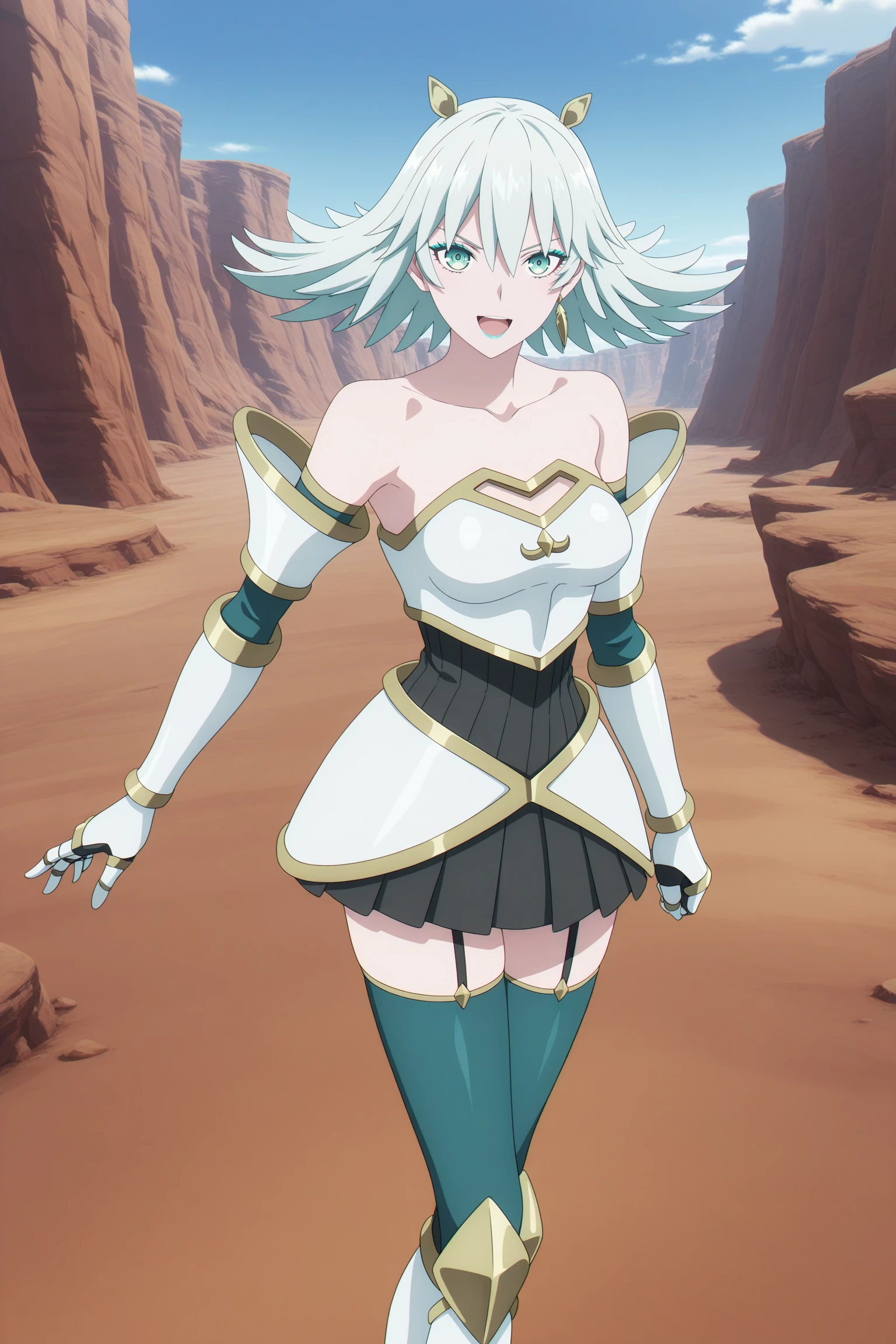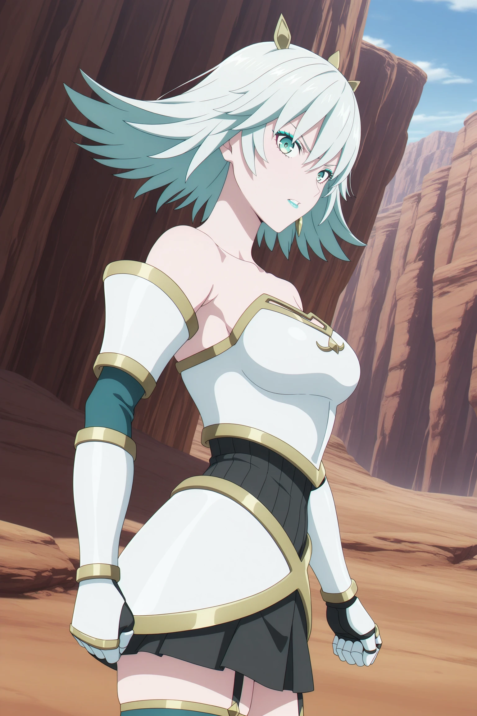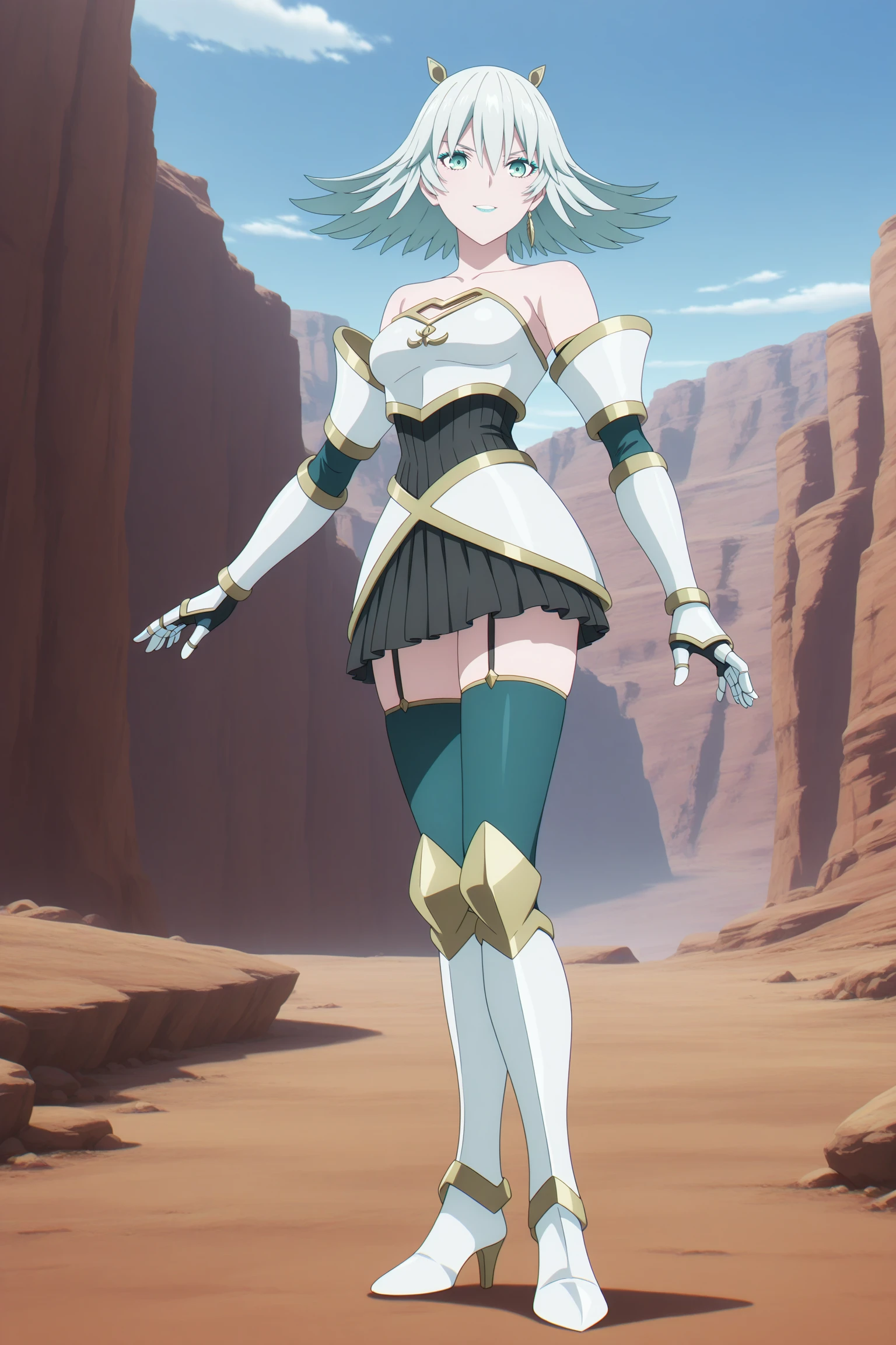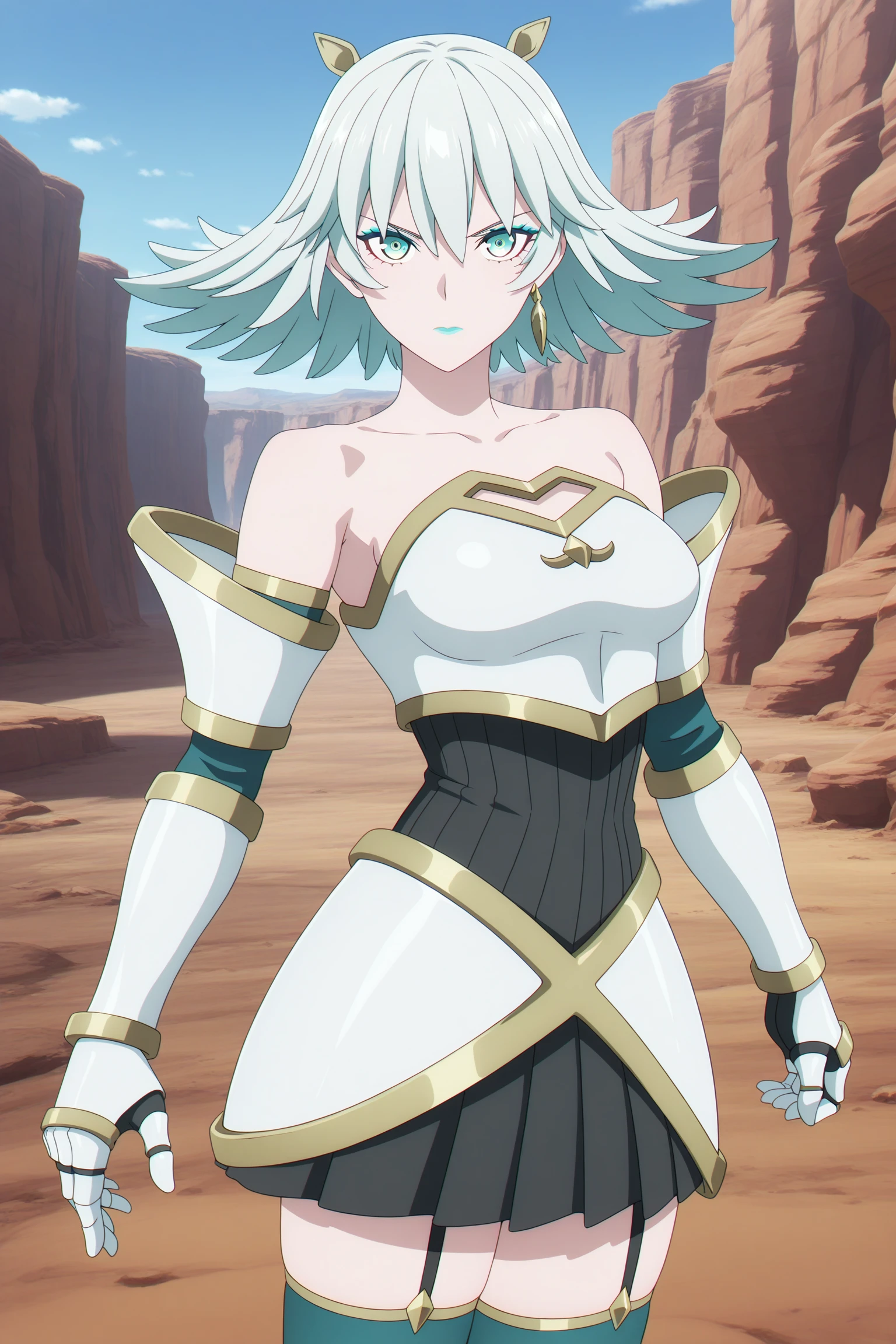 walkure, short hair, white hair, hair ornament, aqua eyeshadow, aqua eyes, aqua lips, single earring, feather earrings, armored dress, strapless dress, detached sleeves, arm guards, armored gloves, garter straps, aqua thighhighs, white footwear, knee boots, armored boots, high heel bootsDescription