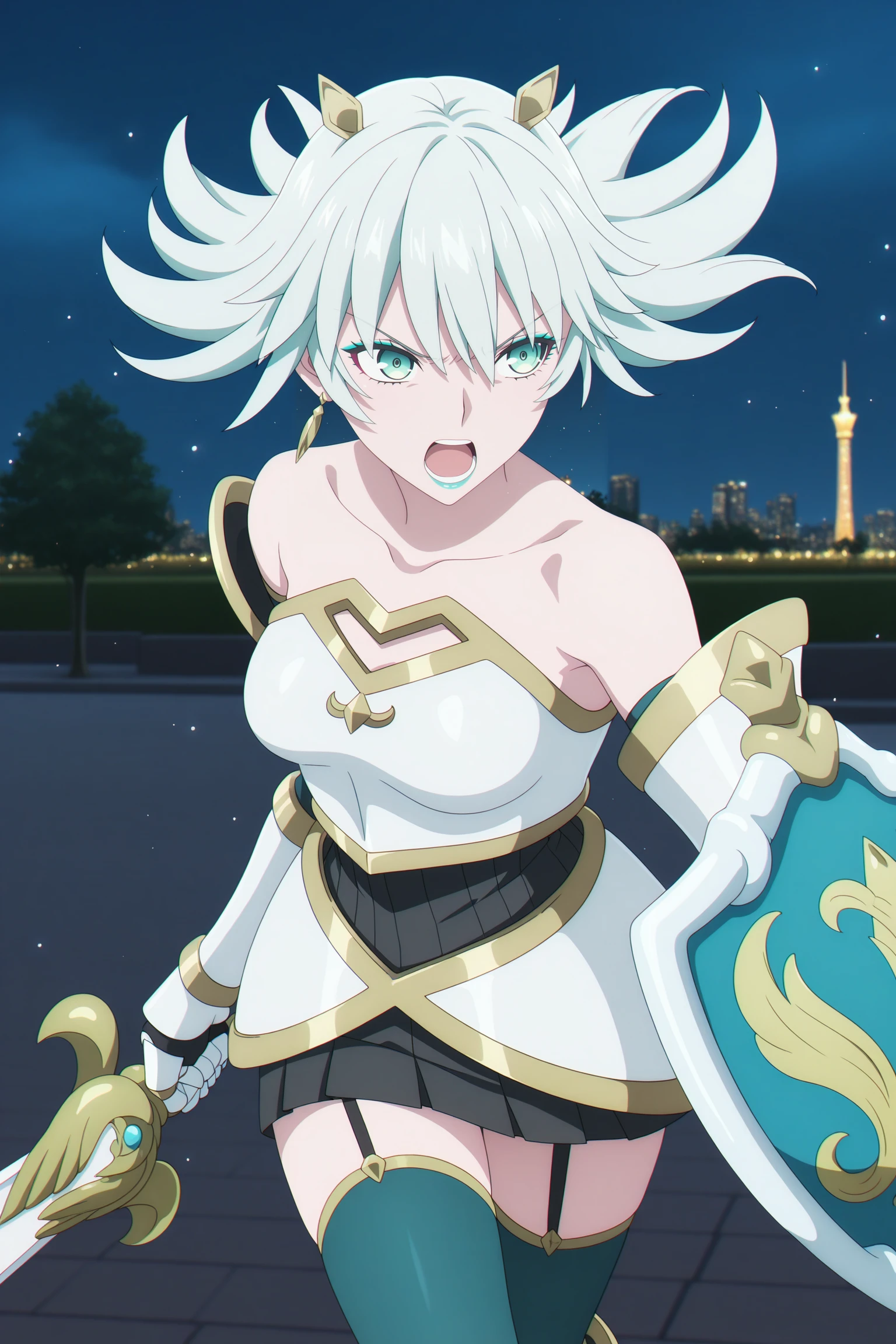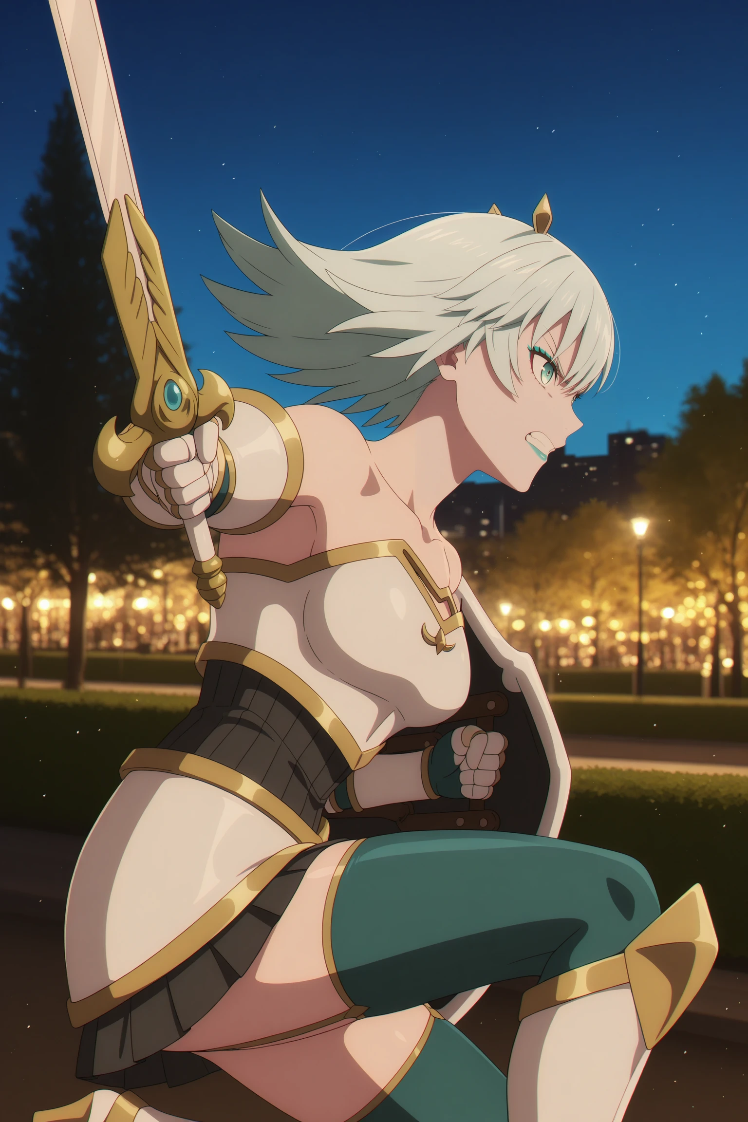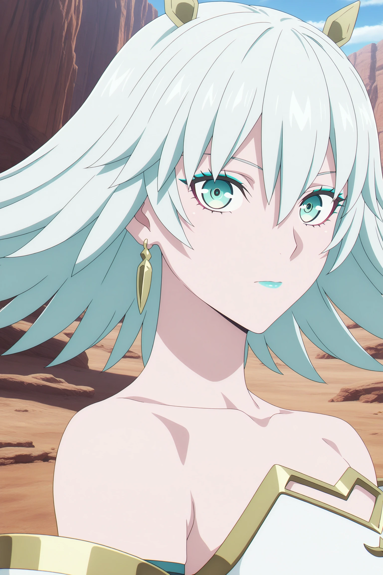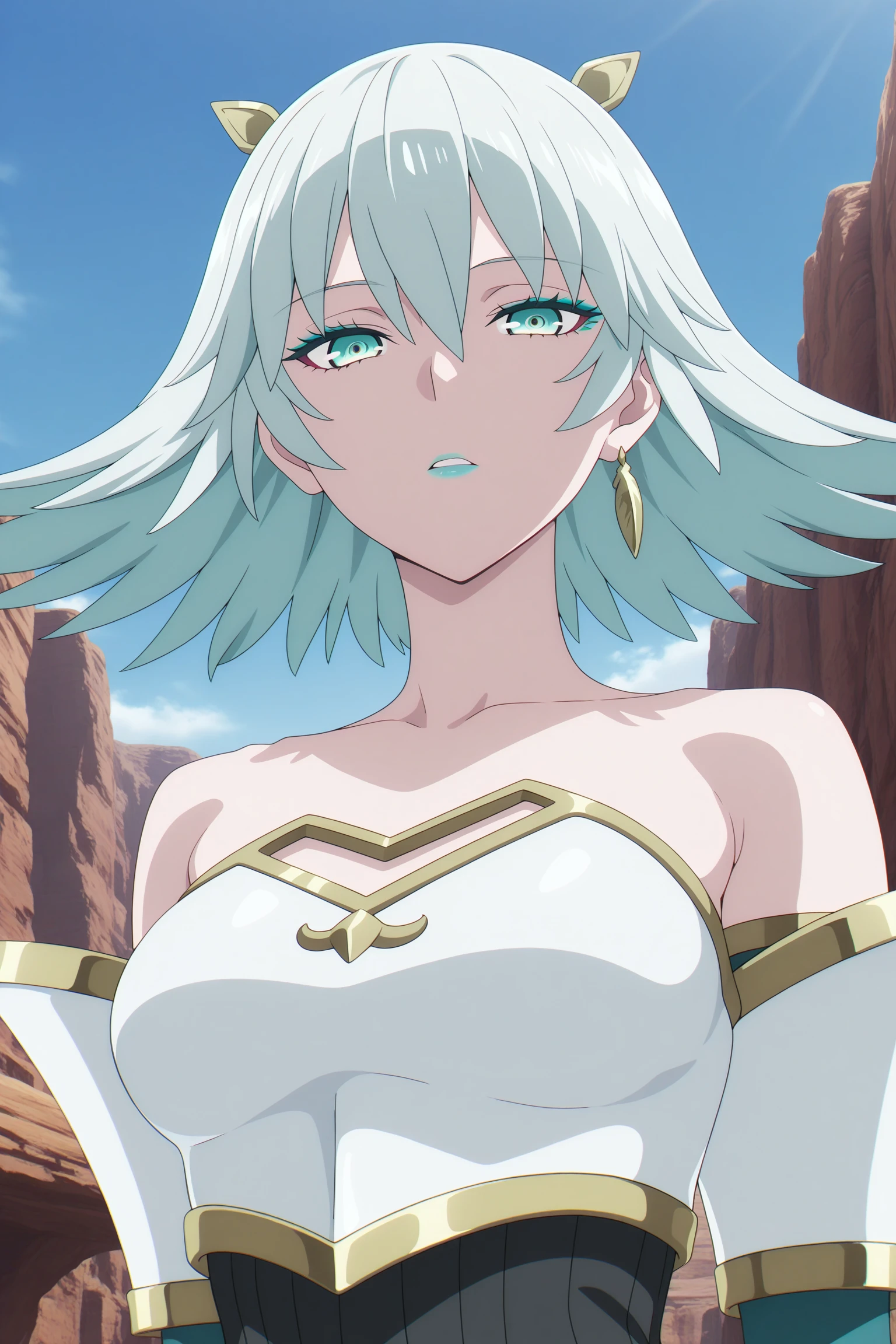 walkure, short hair, white hair, hair ornament, aqua eyeshadow, aqua eyes, aqua lips, single earring, feather earrings, armored dress, strapless dress, detached sleeves, arm guards, armored gloves, garter straps, aqua thighhighs, white footwear, knee boots, armored boots, high heel bootsDescription