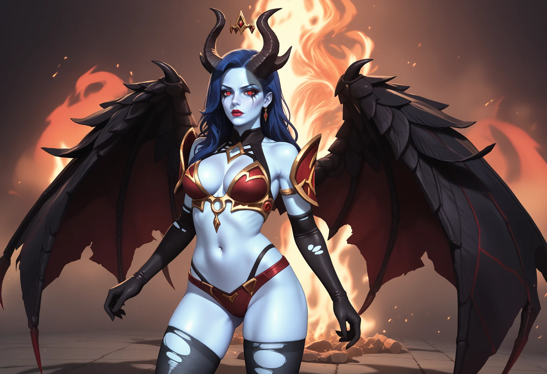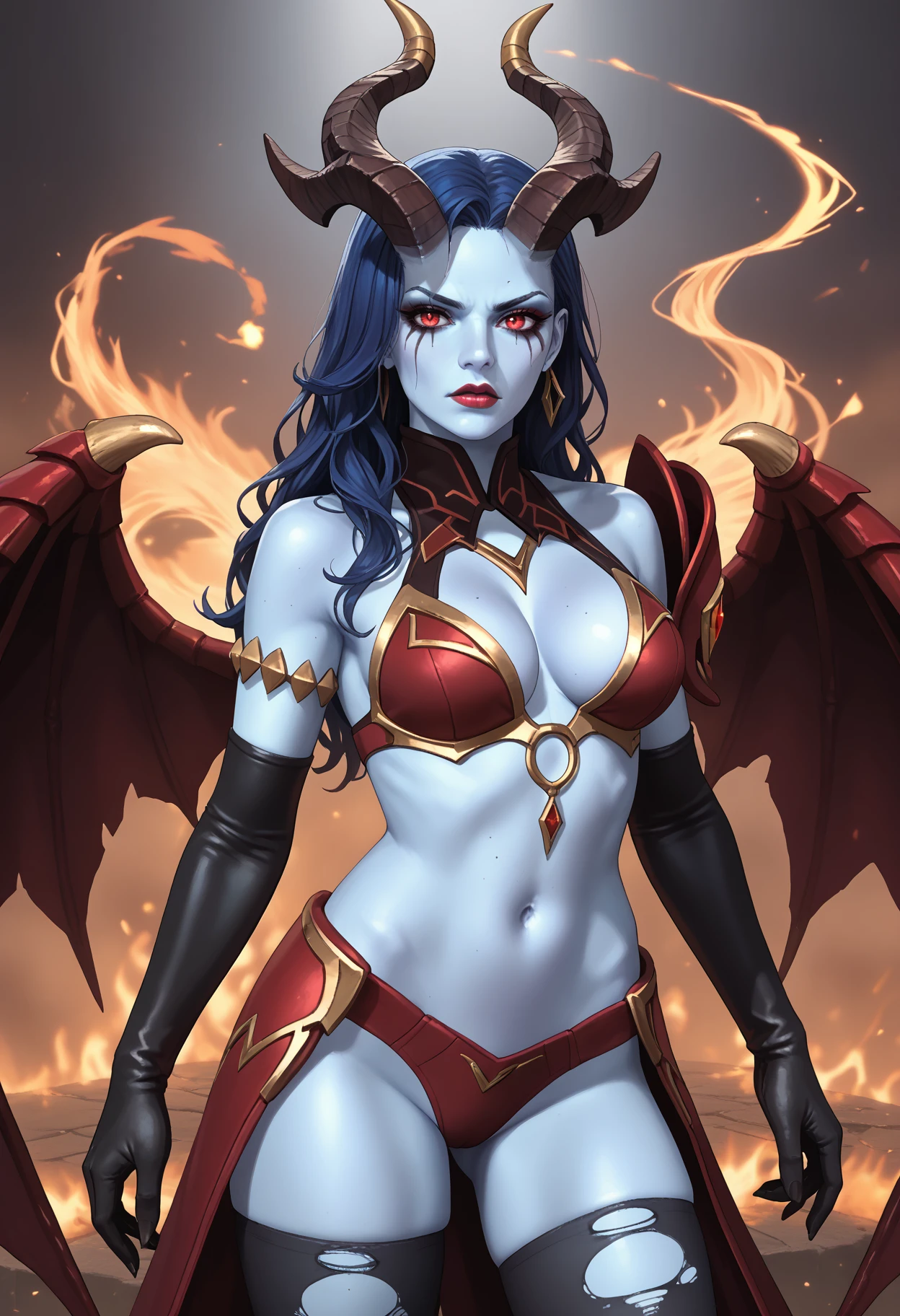 main tags: 1girl, solo, adult woman, demon girl, colored skin, blue skin, red eyes, long hair, black hair, breasts, medium breasts, horns, out1, navel, cleavage, armor, bikini armor, thighhighs, torn thighhighs, gloves, elbow gloves, boots, high heels, wings, long legs