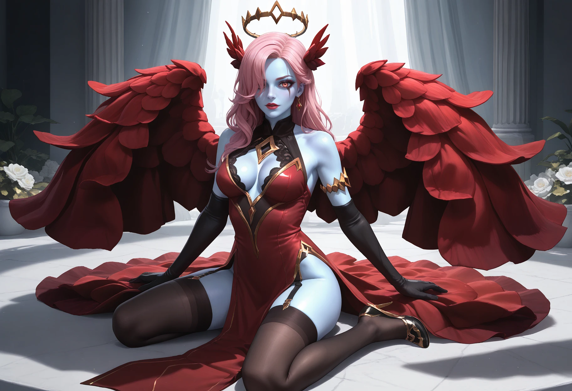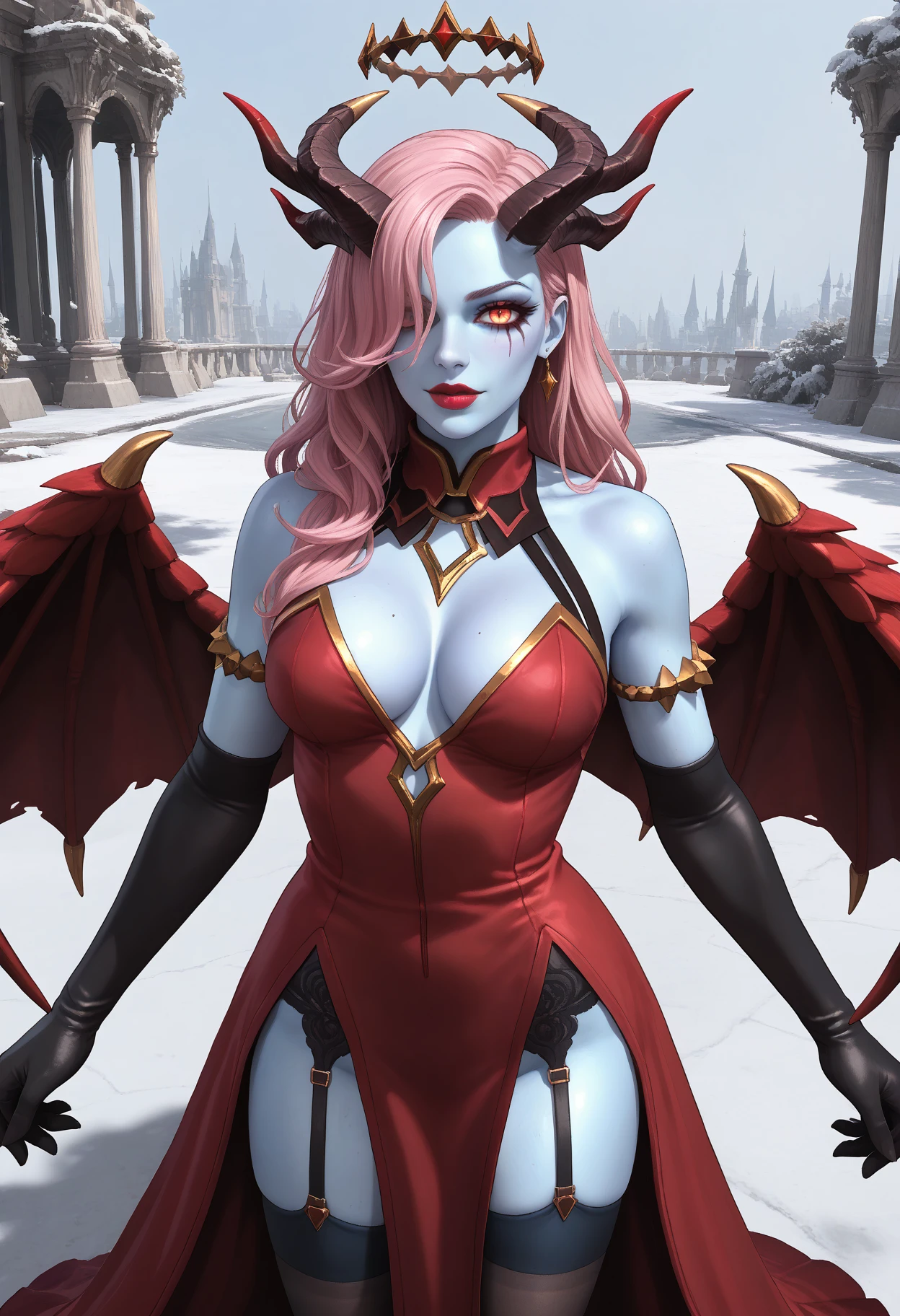 outfit 2 tags (The Rose of Ristful set): 1girl, solo, demon girl, horns, long hair, pink hair, hair over one eye, blue skin, colored skin, breasts, medium breasts, out2, dress, red dress, cleavage, gloves, elbow gloves, black gloves, bare shoulders, thighhighs, black thighhighs, garter straps, wings, red wings, halo,