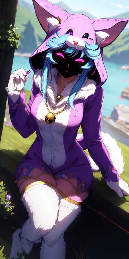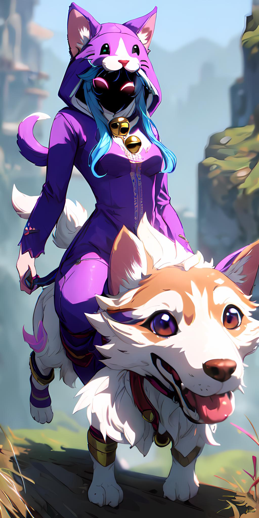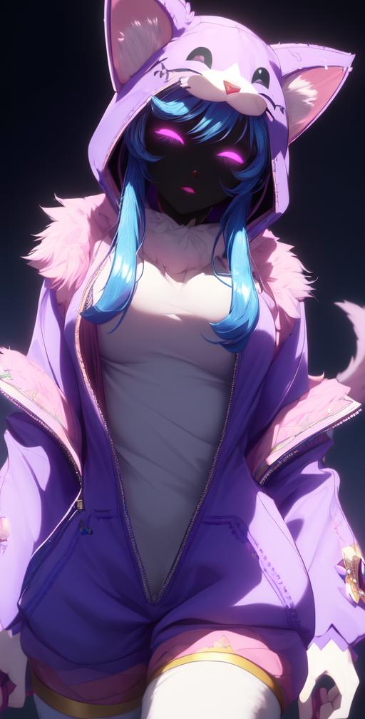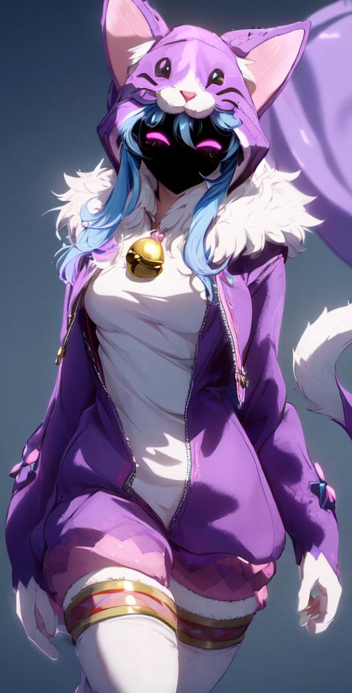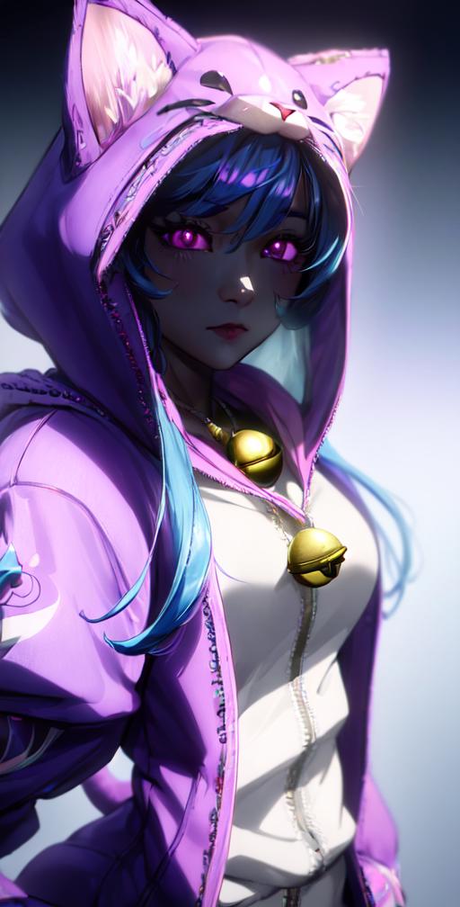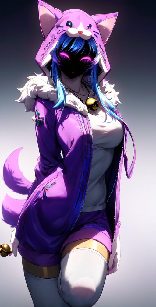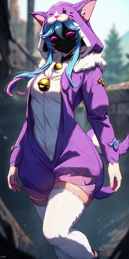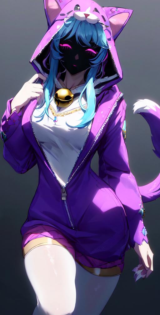 wooflamp, small breasts, pink eyes, blue hair, purple clothes ,hood, closed eyes, neon eyes, tail cat, necklace with bell, satyr legs