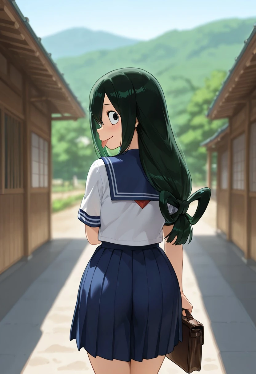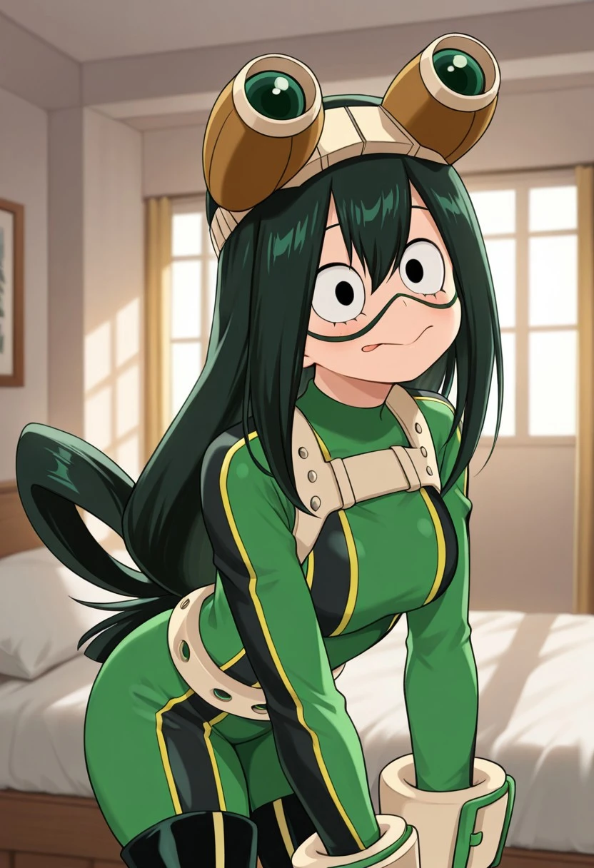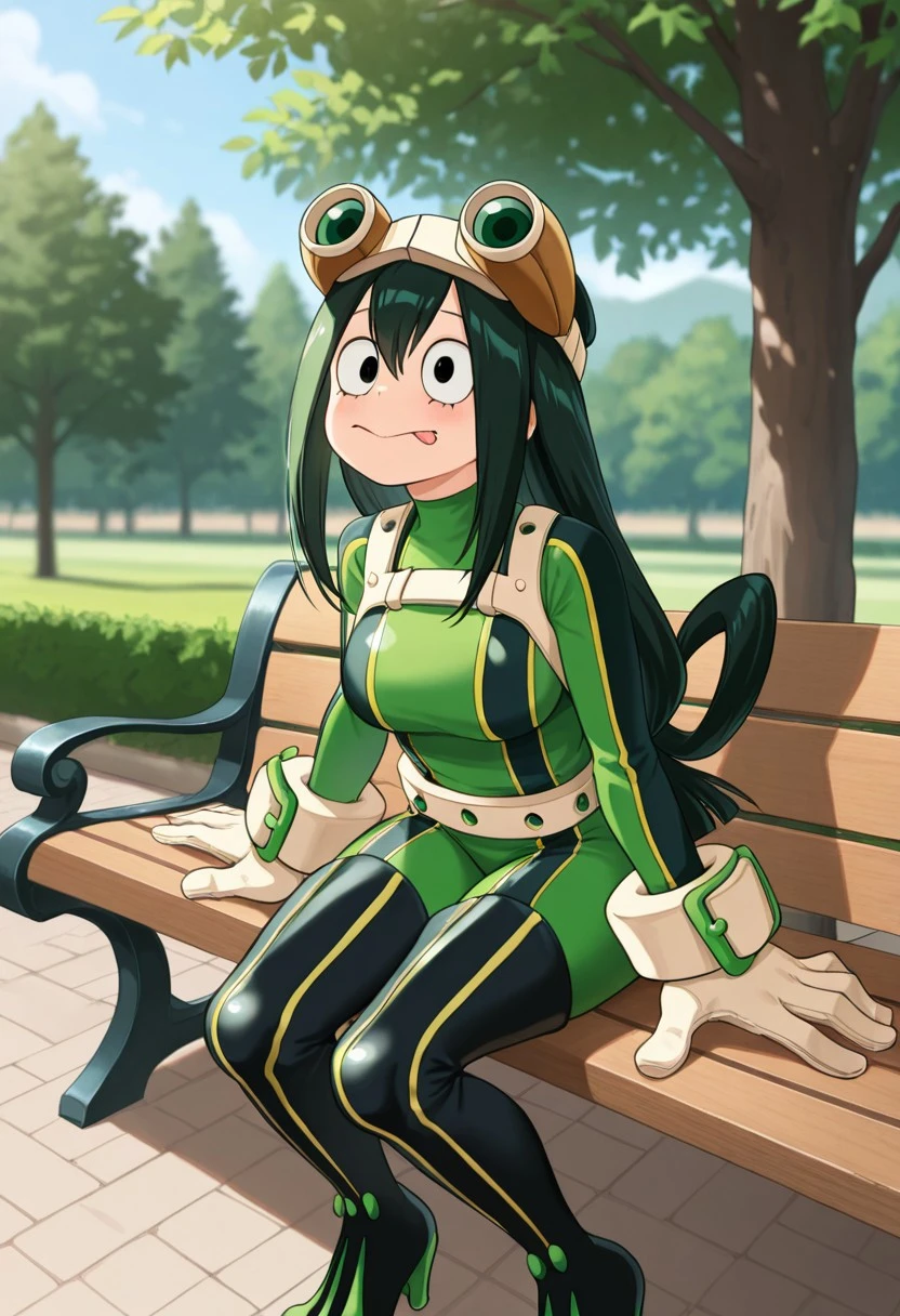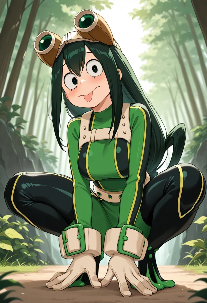 asui_tsuyu_mha_illust, bodysuit, tongue, gloves, goggles, goggles on head, green hair