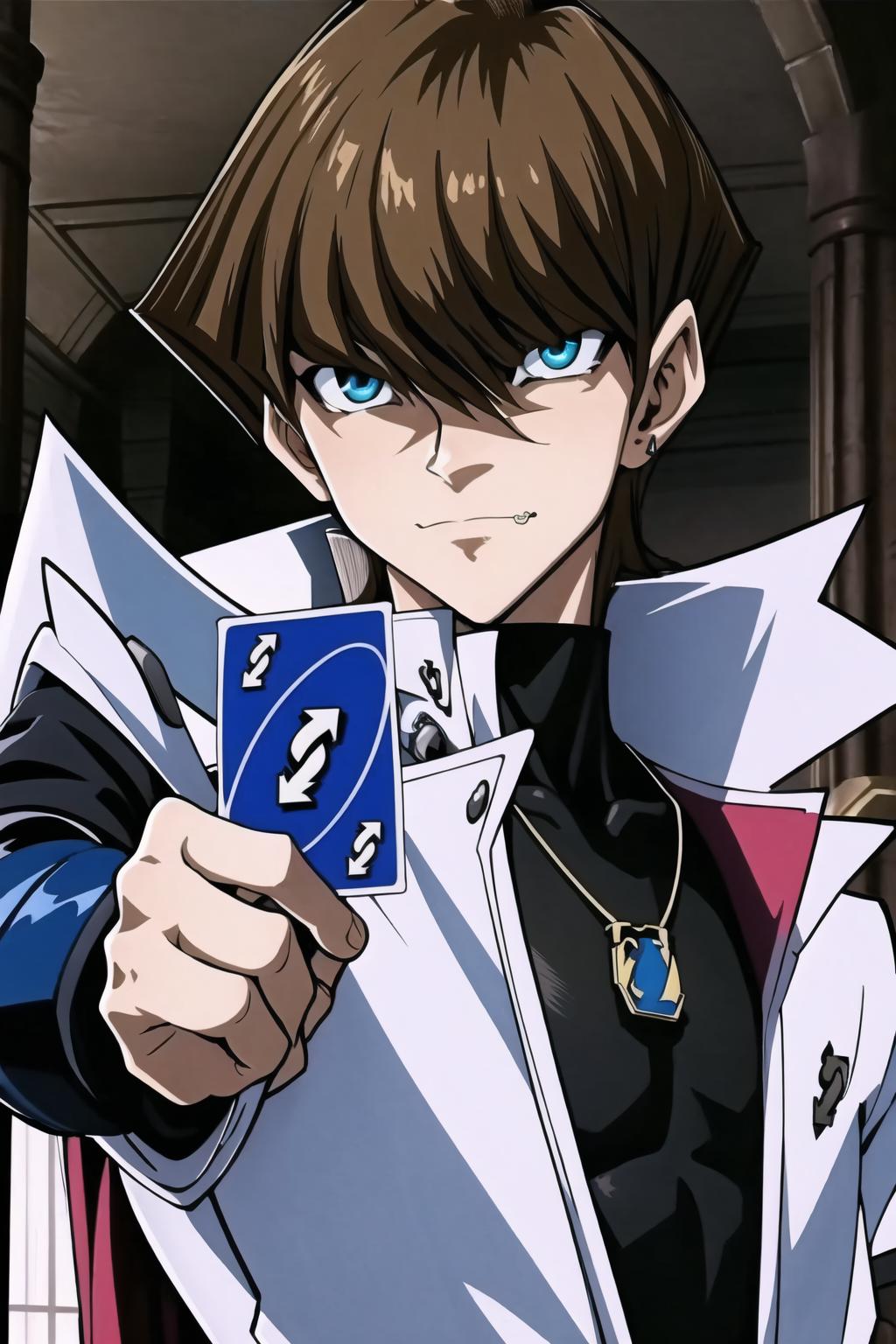 正面:1boy, short hair, brown hair, Seto Kaiba, blue eyes, open jacket, Card Shape Pendant, thigh boots, belt, Cold eyes, sneer, <lora:(人物 海马濑人 游戏王)Seto Kaiba:0.8>,