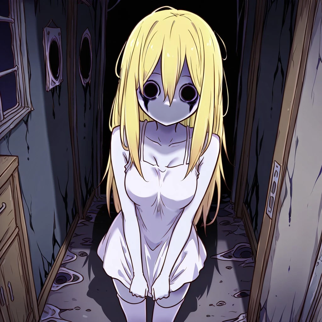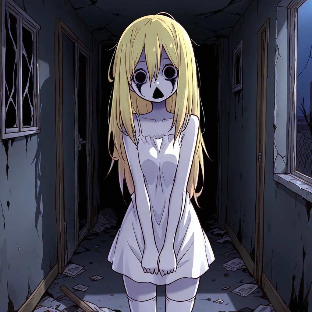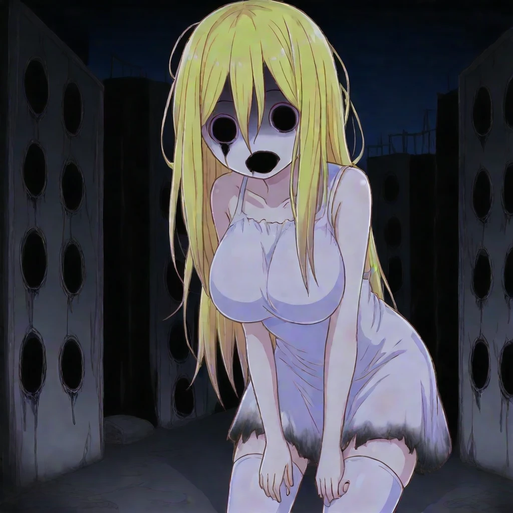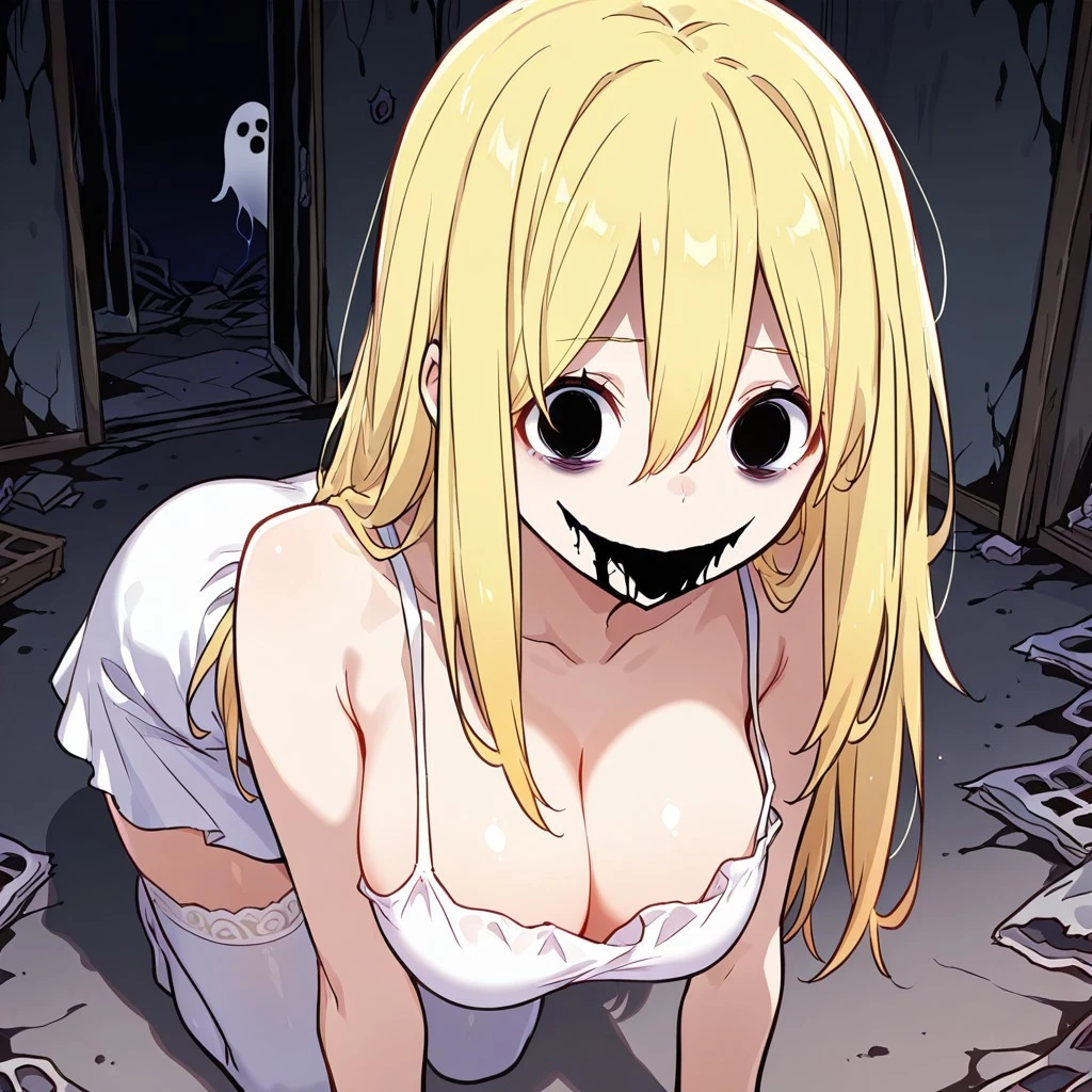 Spooky Akari: Akari, blonde hair, hair between eyes, long hair, solid circle eyes, ghost, horror theme, shadow eyes, shadow mouth, large breasts
