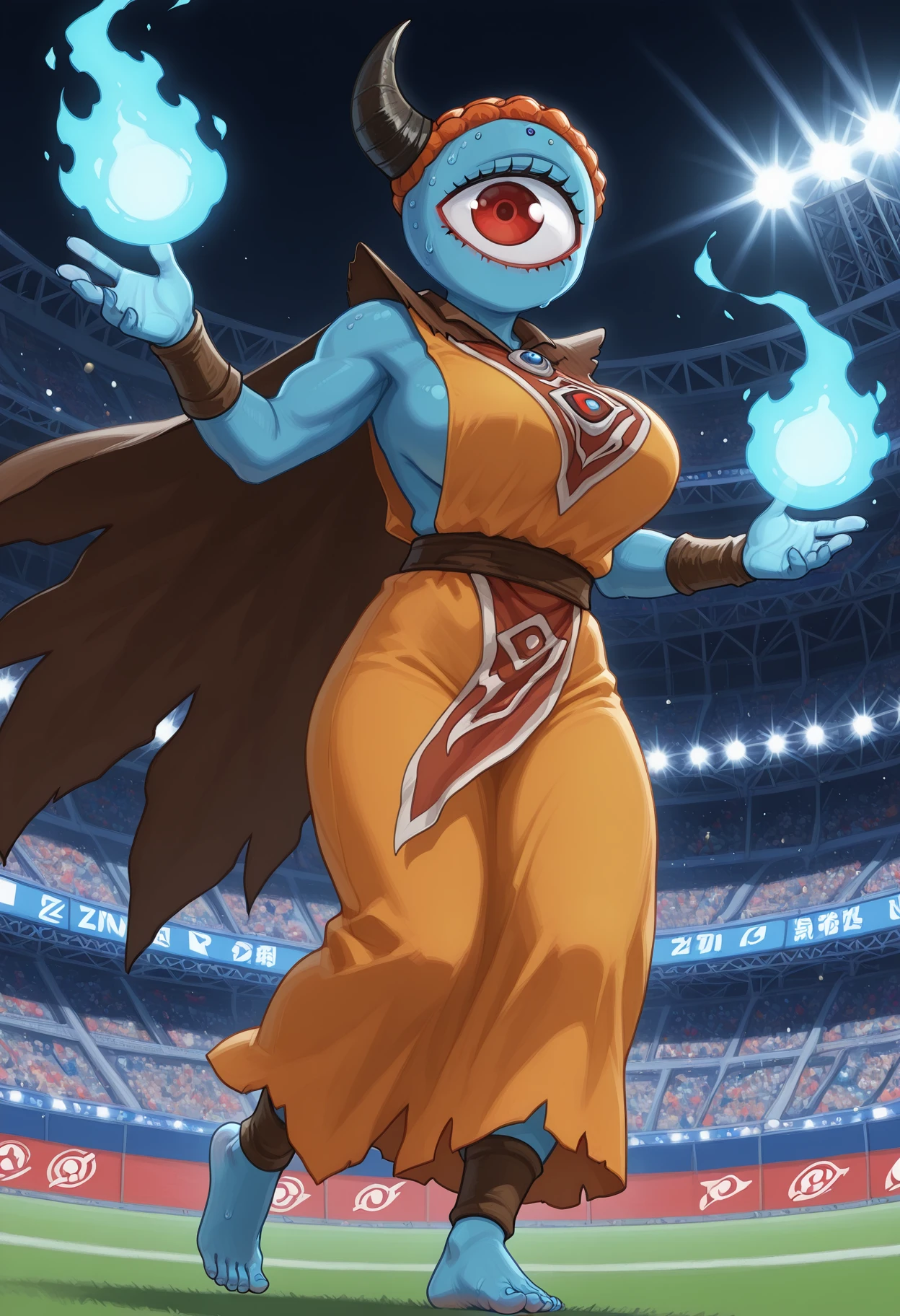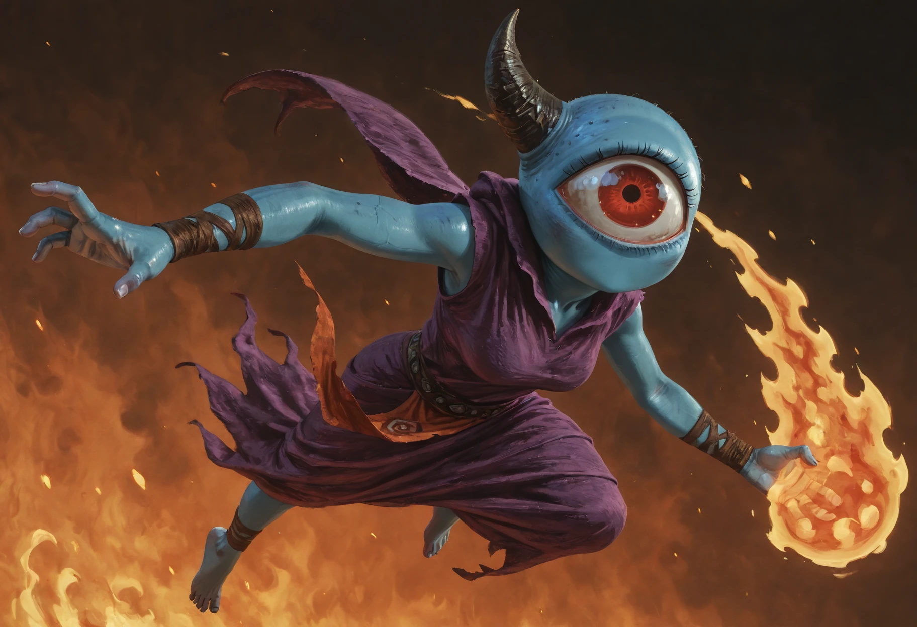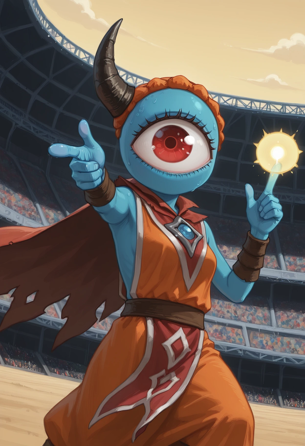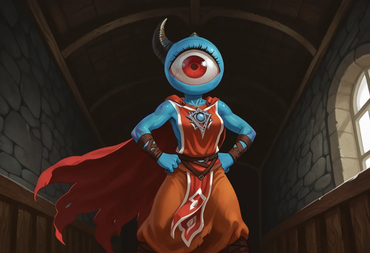 Tags: homunculus, short, monster girl, blue skin, red eye, mouthless, cyclops [or one-eyed], horn (optional), chibi (optional can help make her smaller as sometimes she aint)