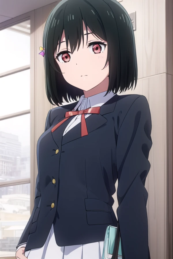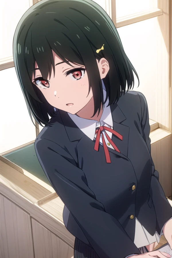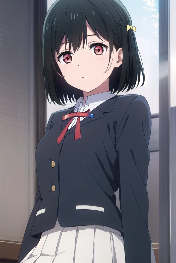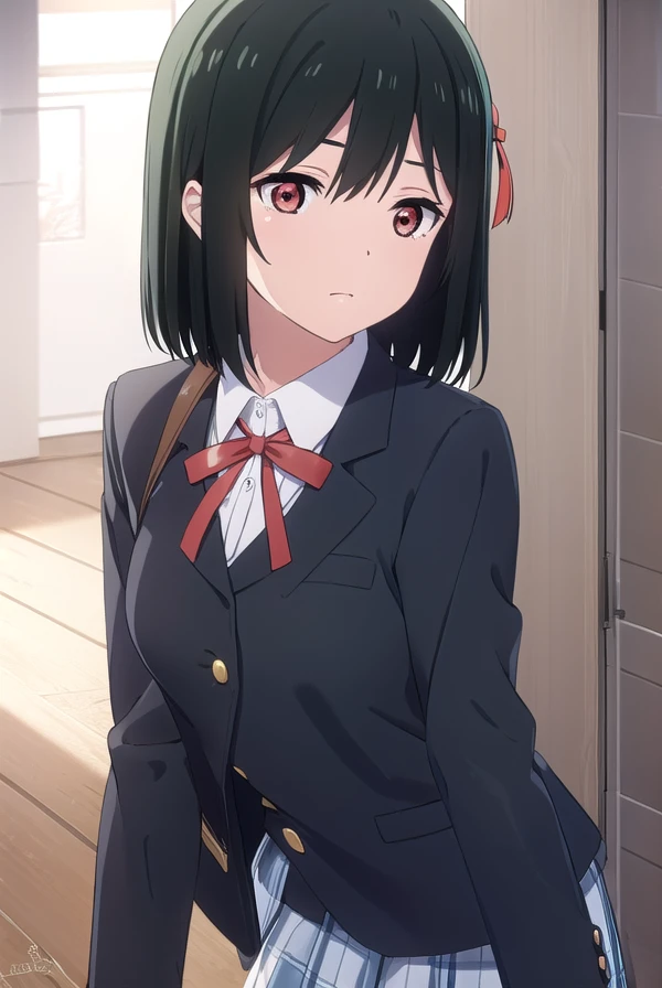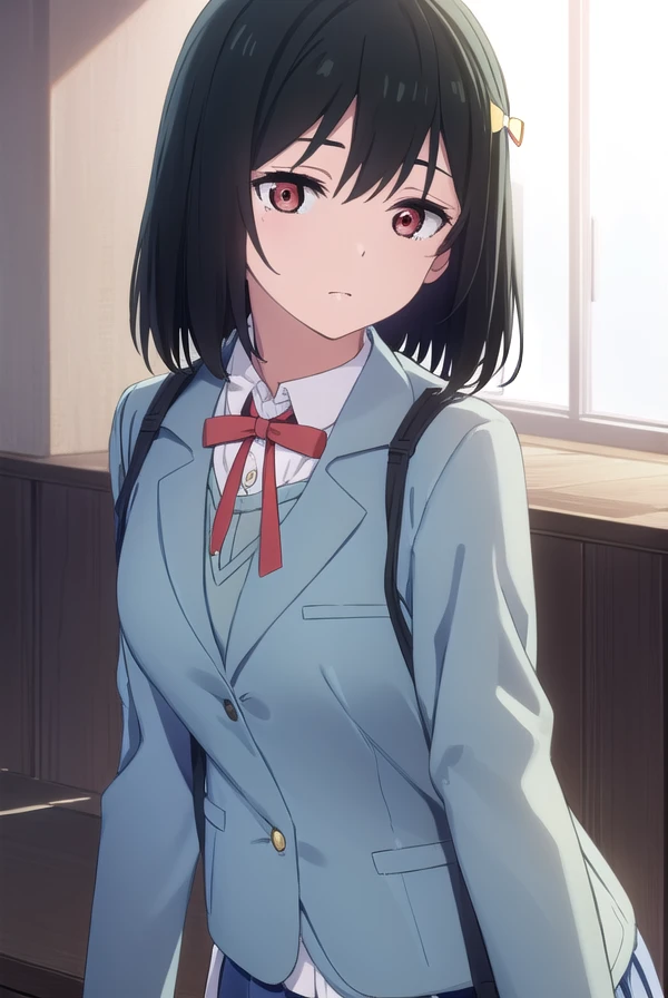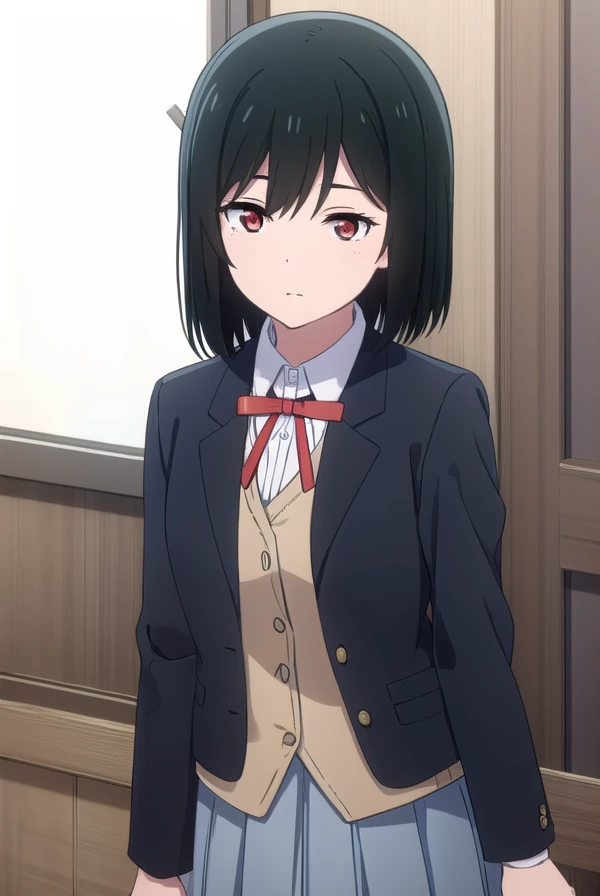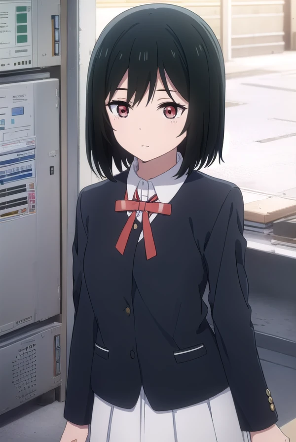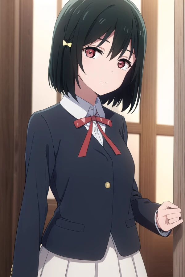 shioriko mifune, short hair, bangs, black hair, (red eyes:1.3), ribbon, hair ribbon, dark green hair,