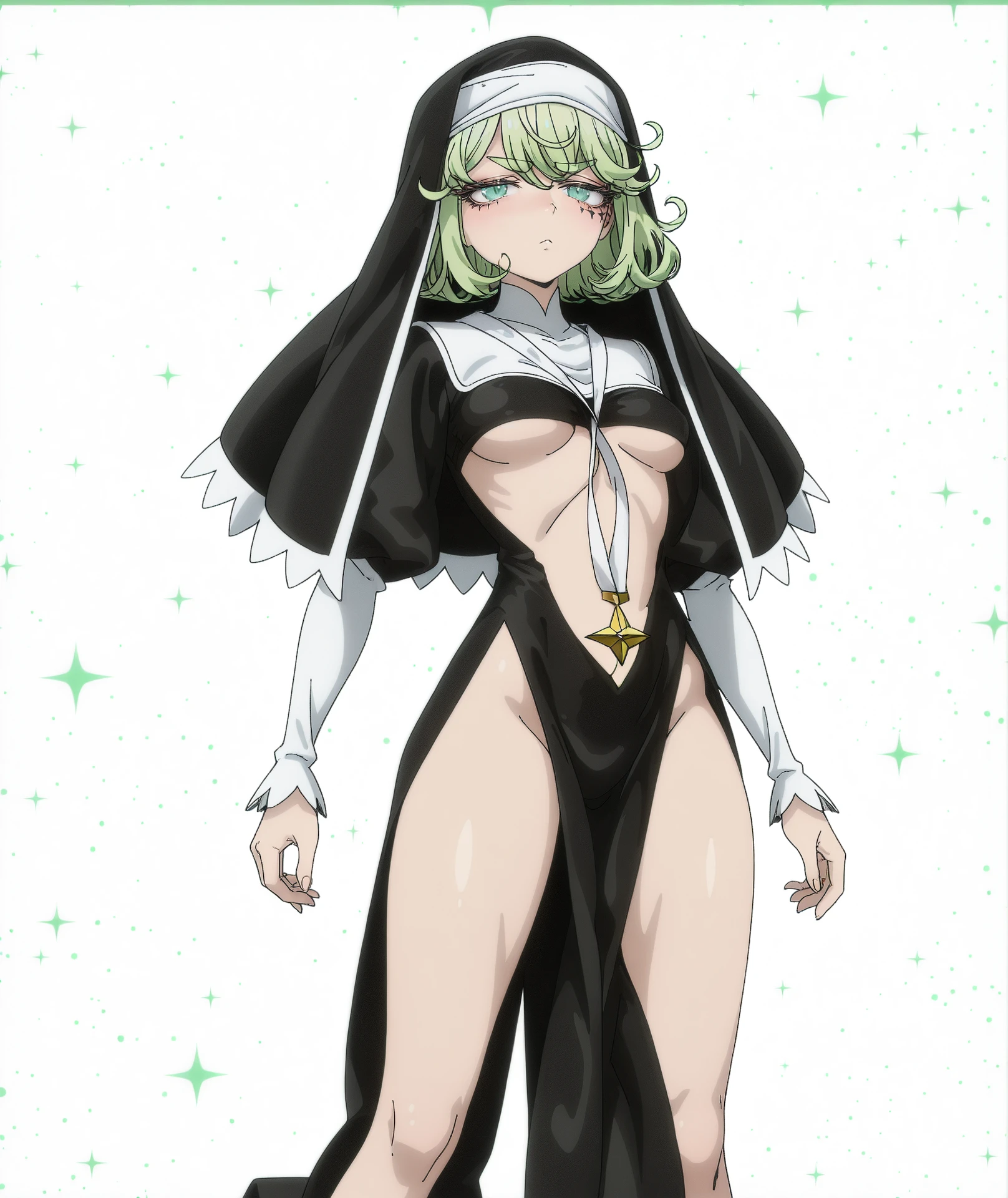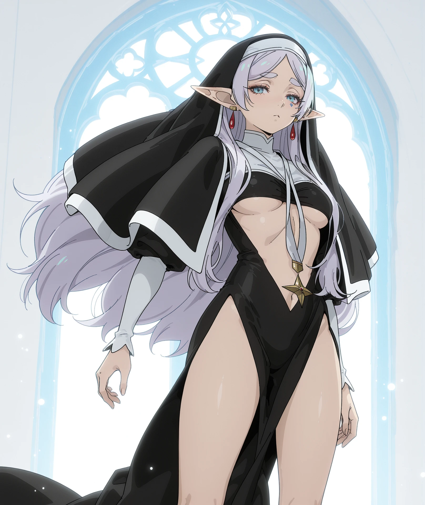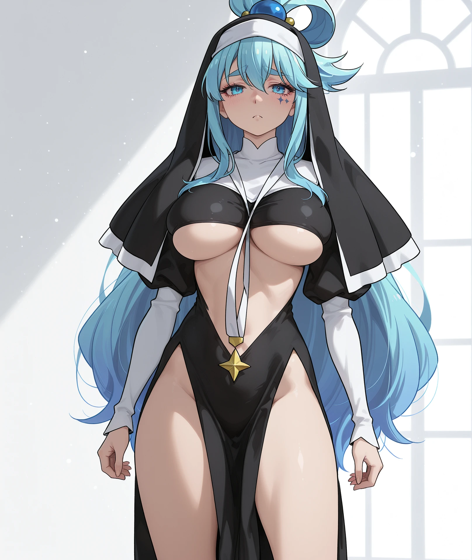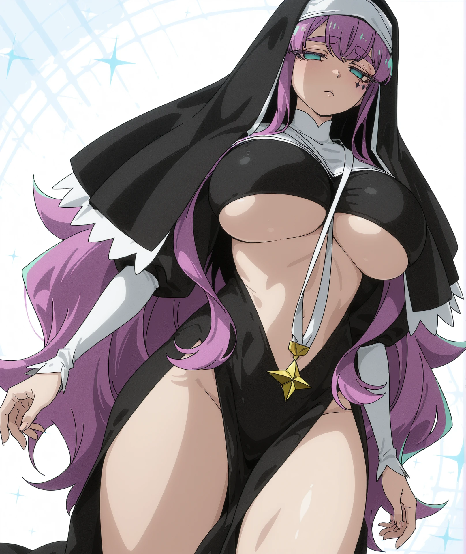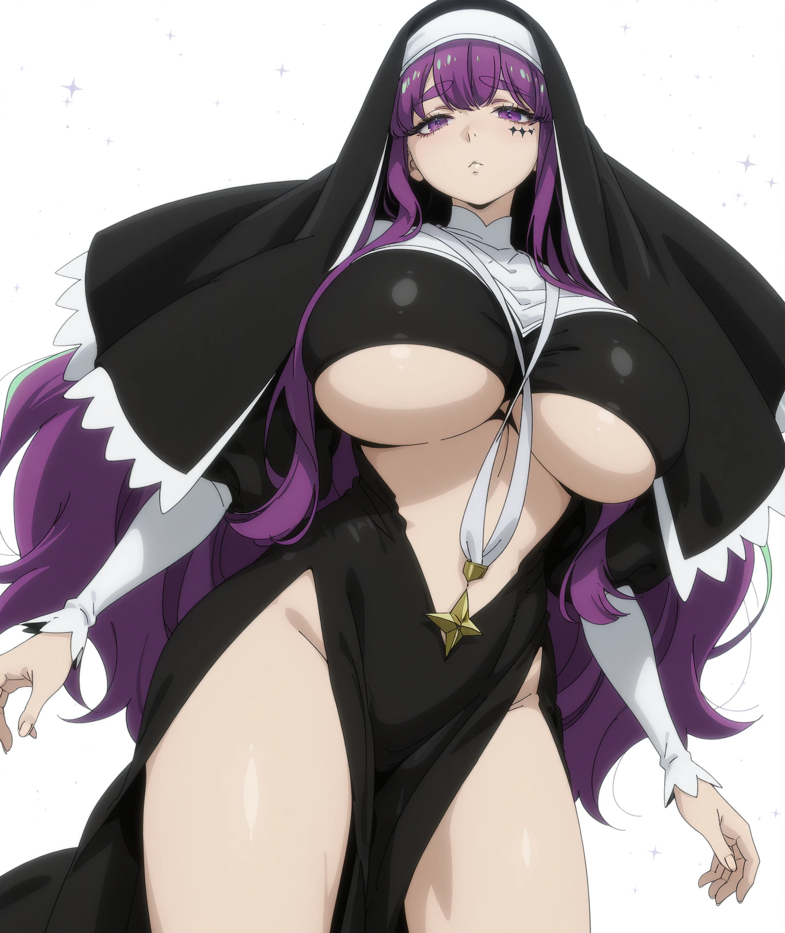 breasts, large breasts, huge breasts, impossible clothes, black dress, dress, pelvic curtain, revealing clothes, underboob, star (symbol), cross, veil, nun, habit, bare legs, legs,