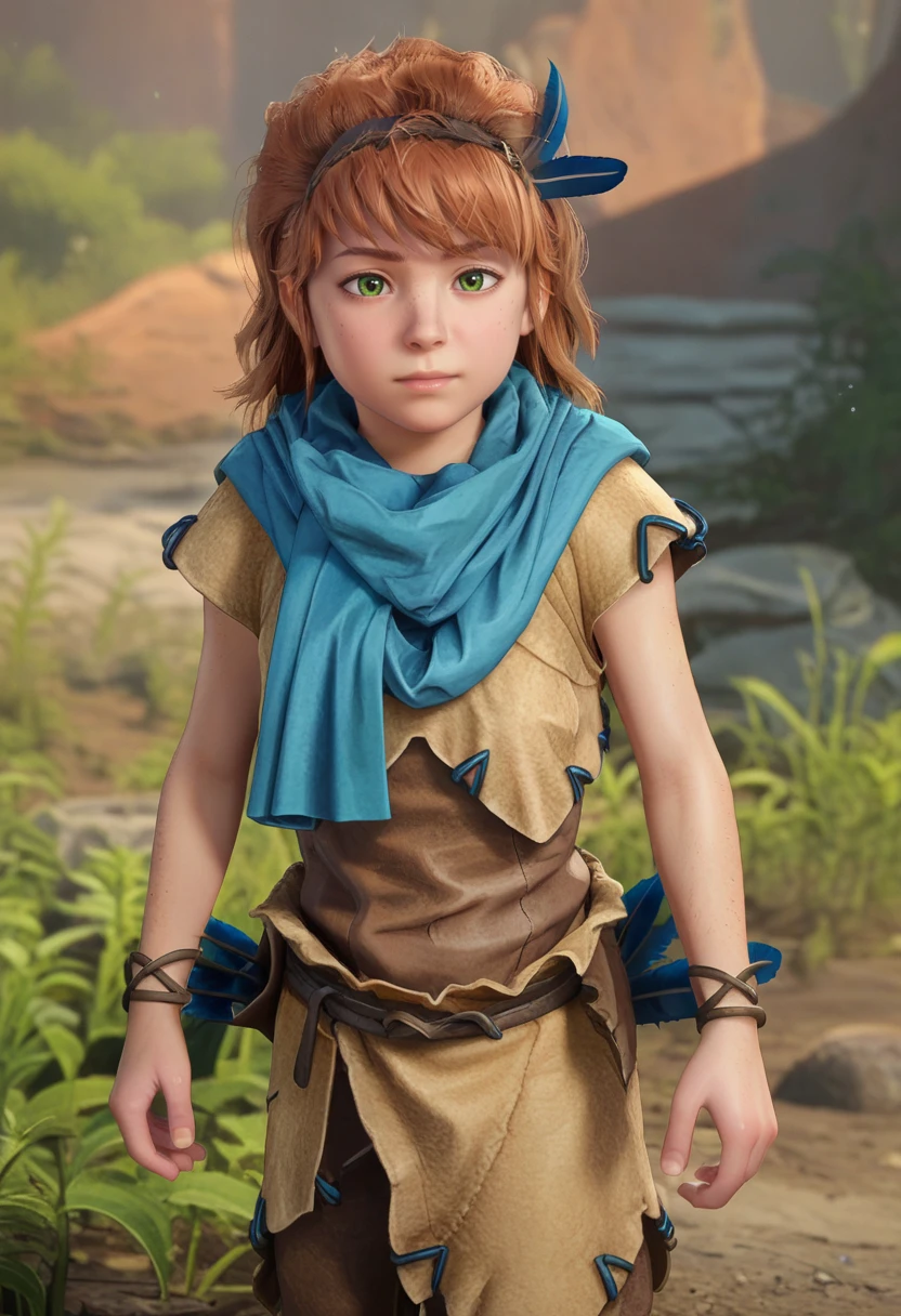 aloy, realistic, freckles, green eyes, brown hair, feather hairband, tribal clothes, scarf, brown pants,
