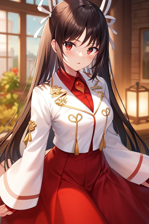 hiyouKC,black hairs, long sleeves,white jacket,long hair,hakama skirt,hair ribbon, red skirt, hakama skirt, white ribbon, hime cut, magatama,