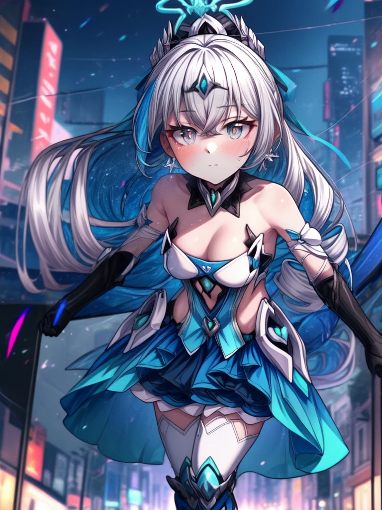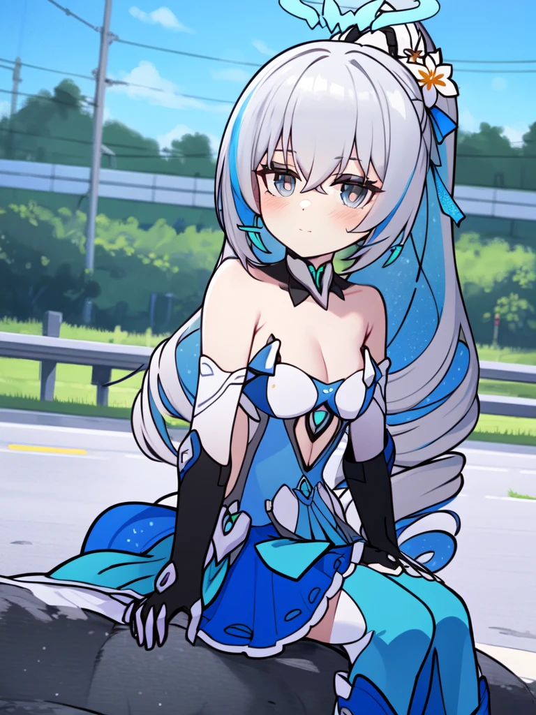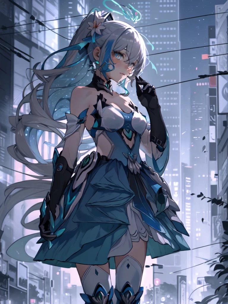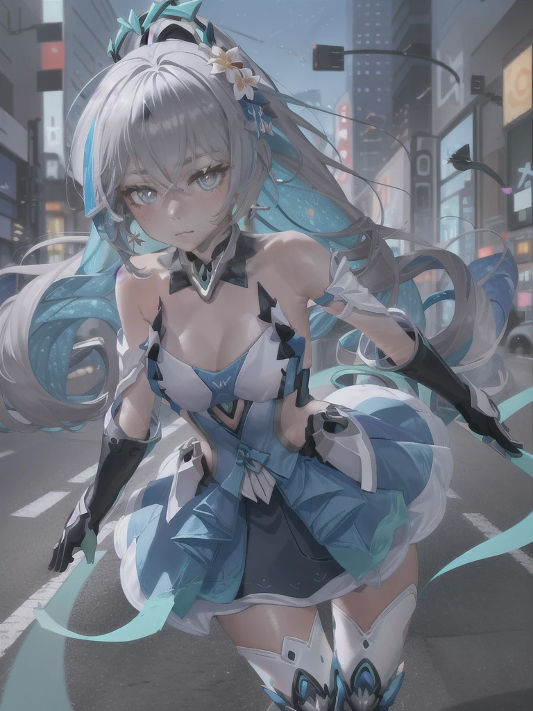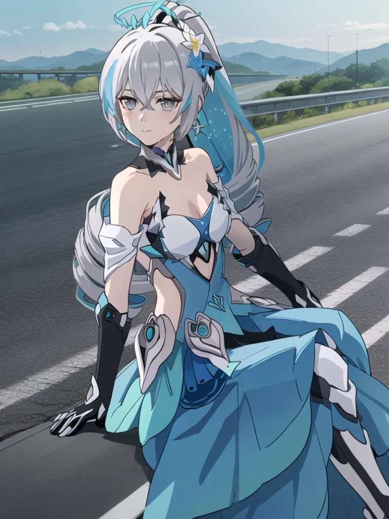 1girl,long hair,solo,grey hair,bronya zaychik,bare shoulders,grey eyes,looking at viewer,hair between eyes,dress,closed mouth,ponytail,drill hair,gloves,hair ornament,thighhighs,black gloves,small breasts,halo,blue hair,twin drills,cleavage,elbow gloves,jewelry,earrings,blush,armor,boots,very long hair,blue eyes,white dress,flower