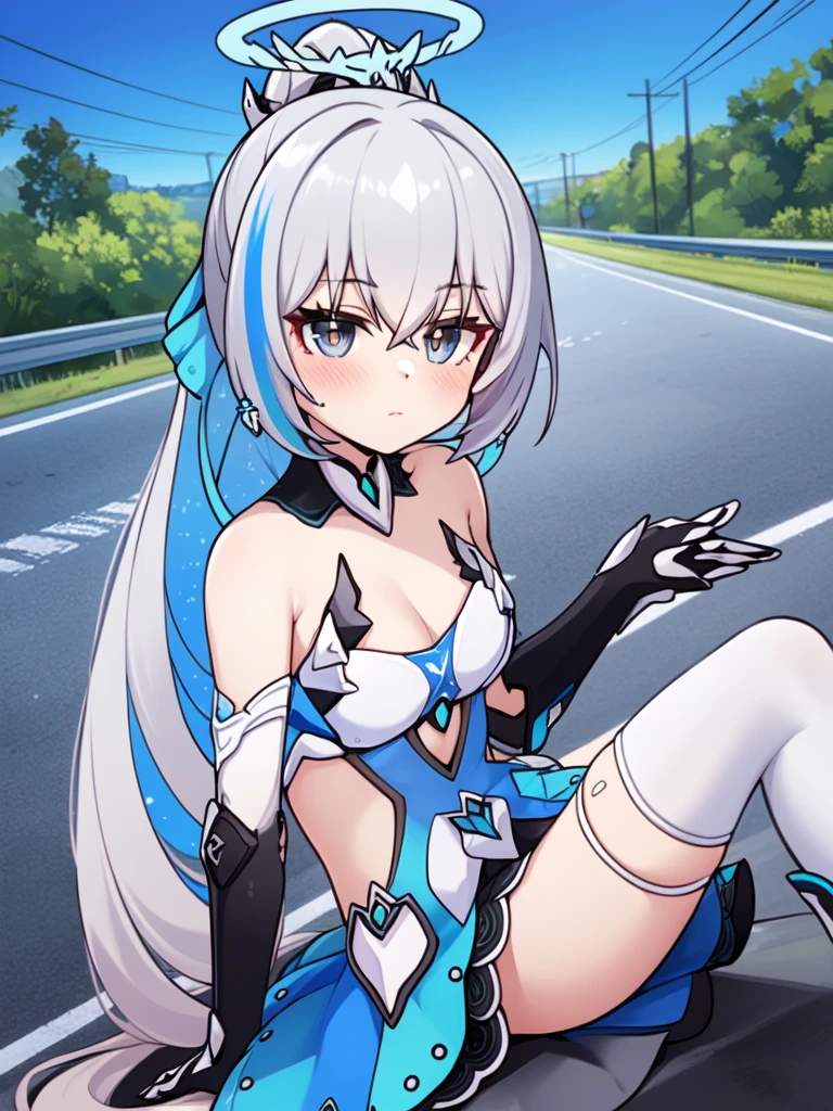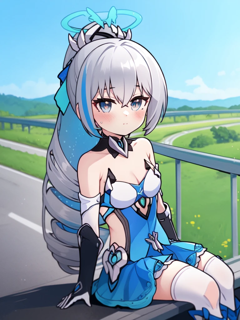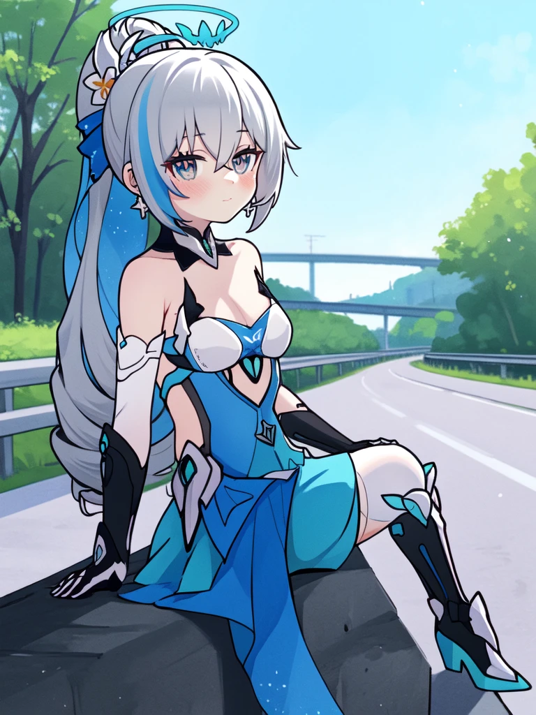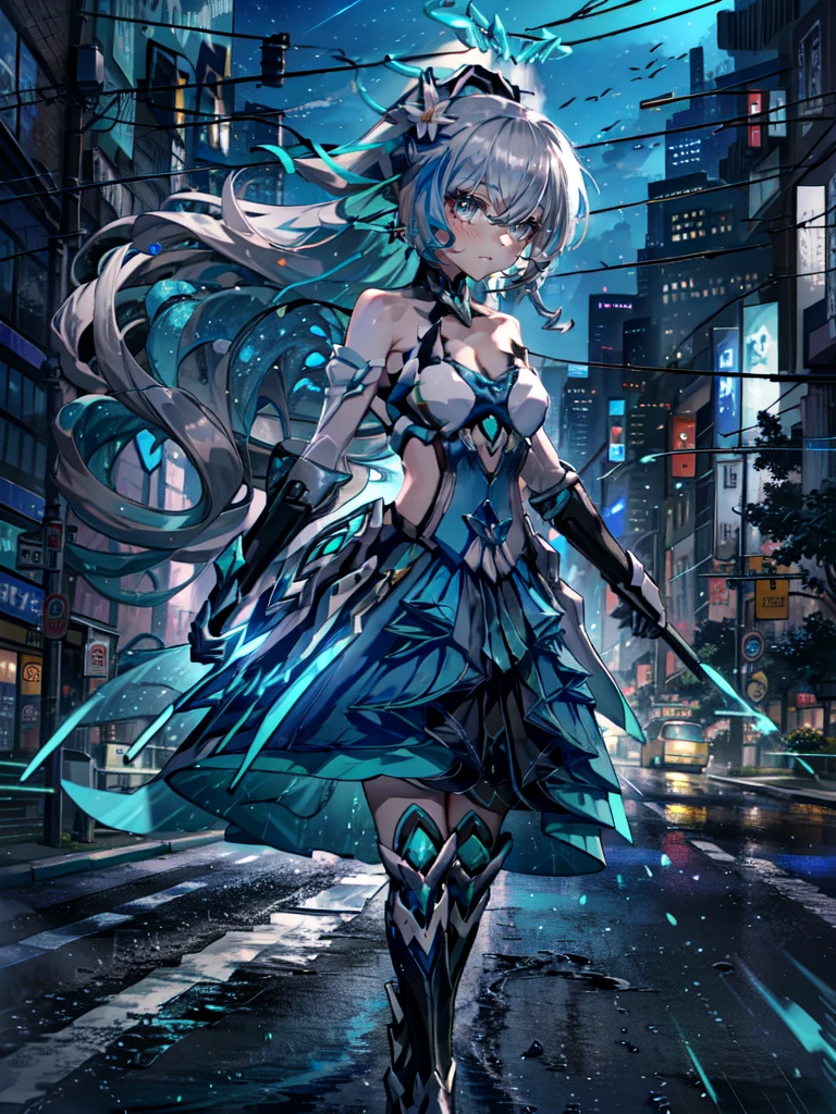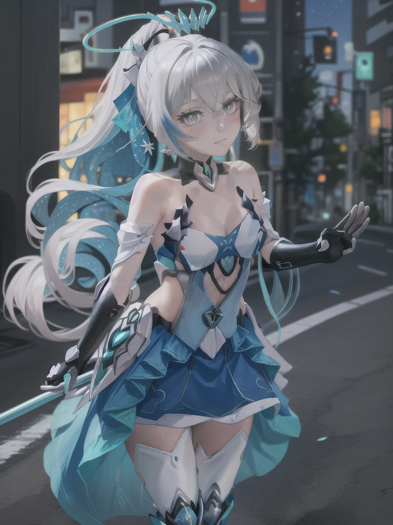 1girl,long hair,solo,grey hair,bronya zaychik,bare shoulders,grey eyes,looking at viewer,hair between eyes,dress,closed mouth,ponytail,drill hair,gloves,hair ornament,thighhighs,black gloves,small breasts,halo,blue hair,twin drills,cleavage,elbow gloves,jewelry,earrings,blush,armor,boots,very long hair,blue eyes,white dress,flower