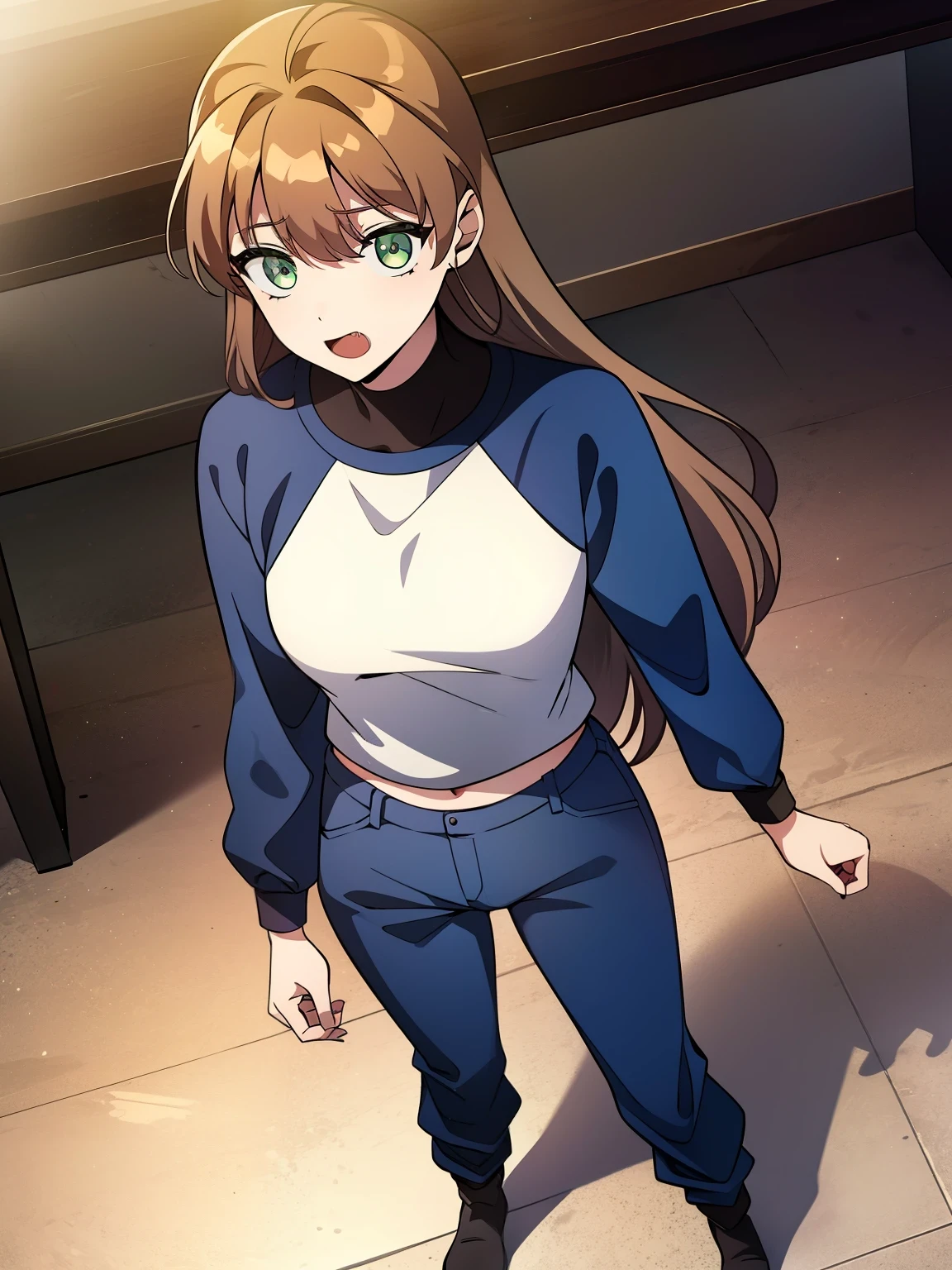 ChopioChaeNayun, 1girl, solo, ahoge, black footwear, blue pants, boots, brown hair, green eyes, long hair, long sleeves, open mouth, fang, pants,