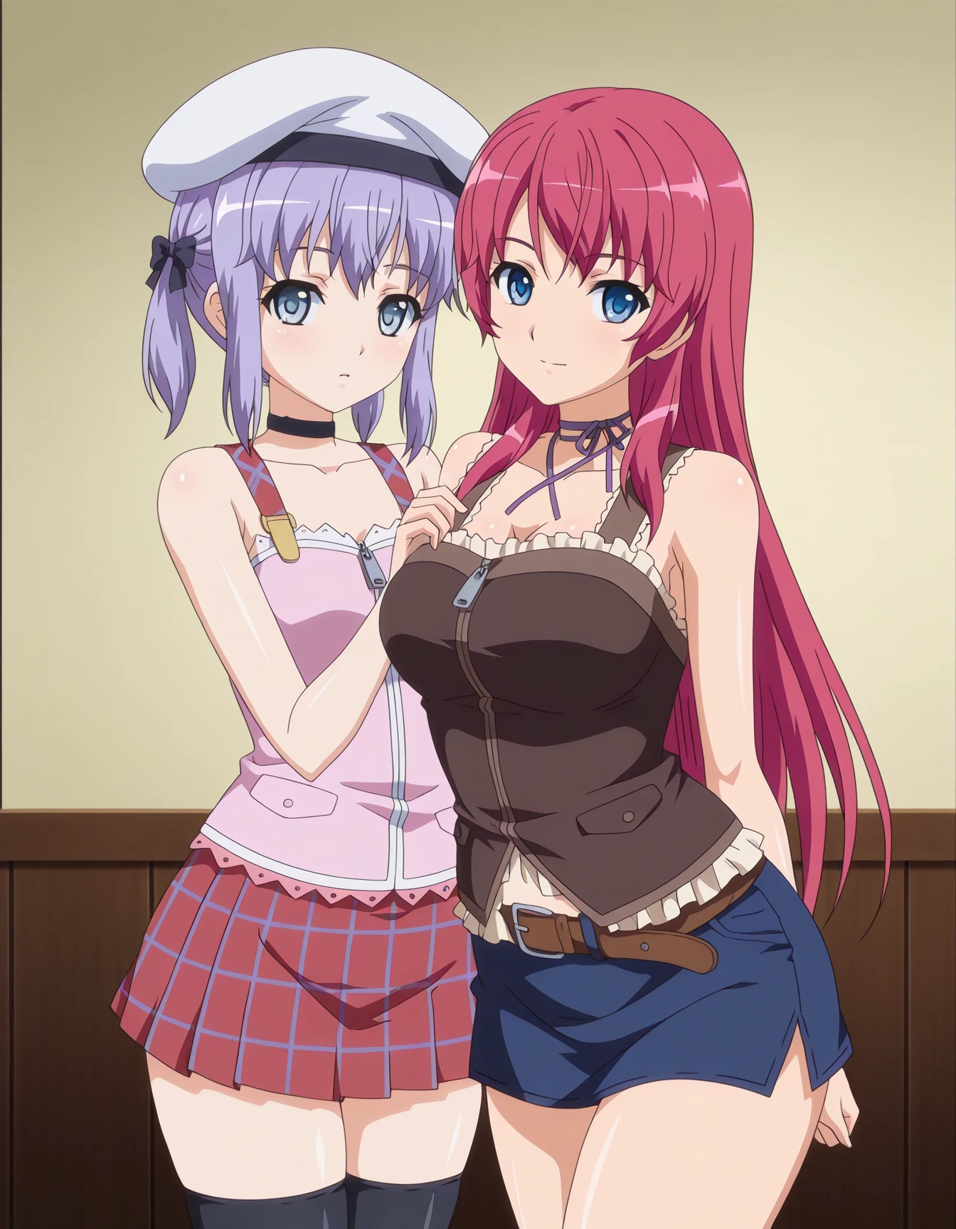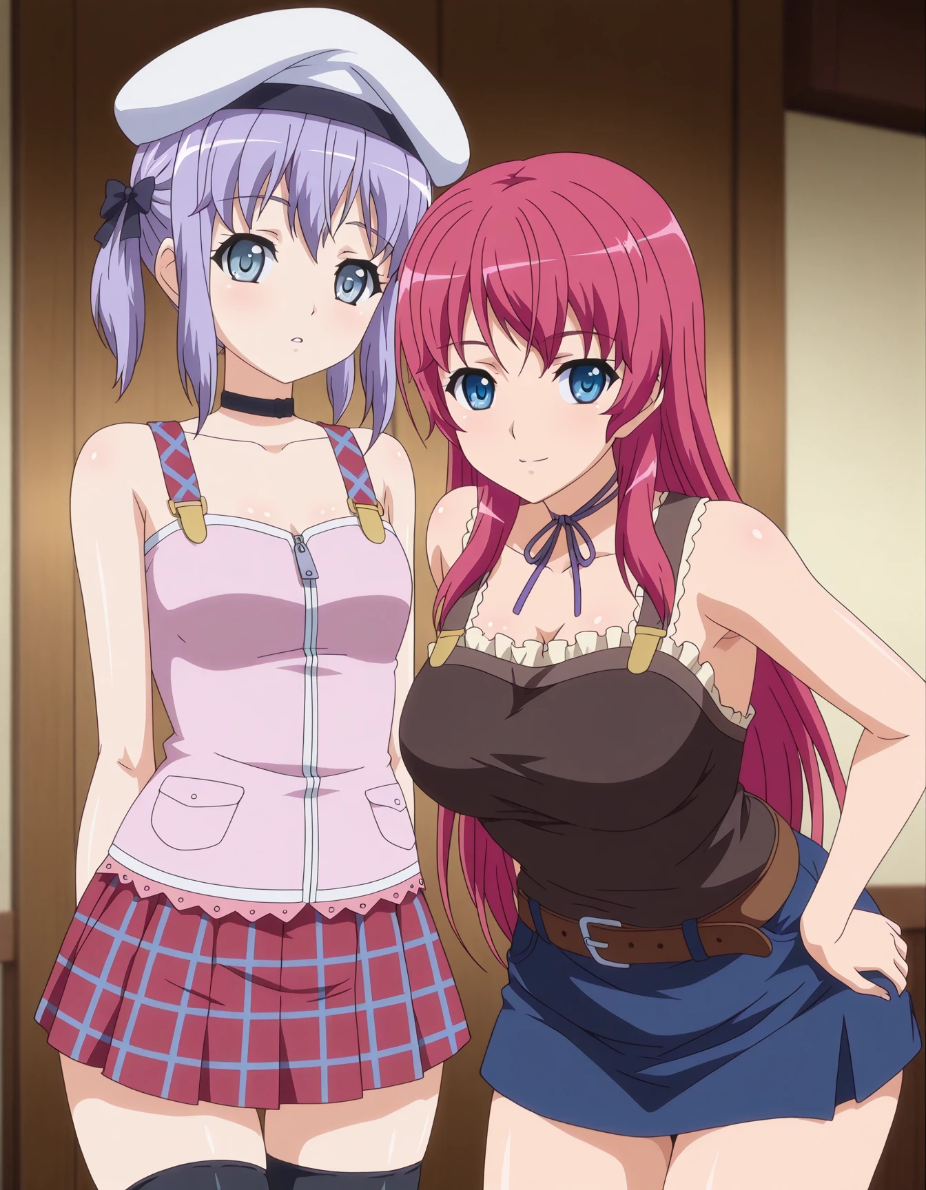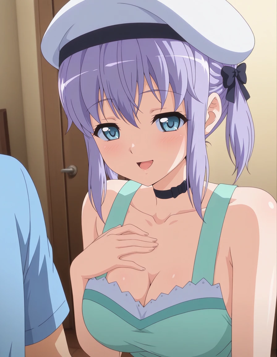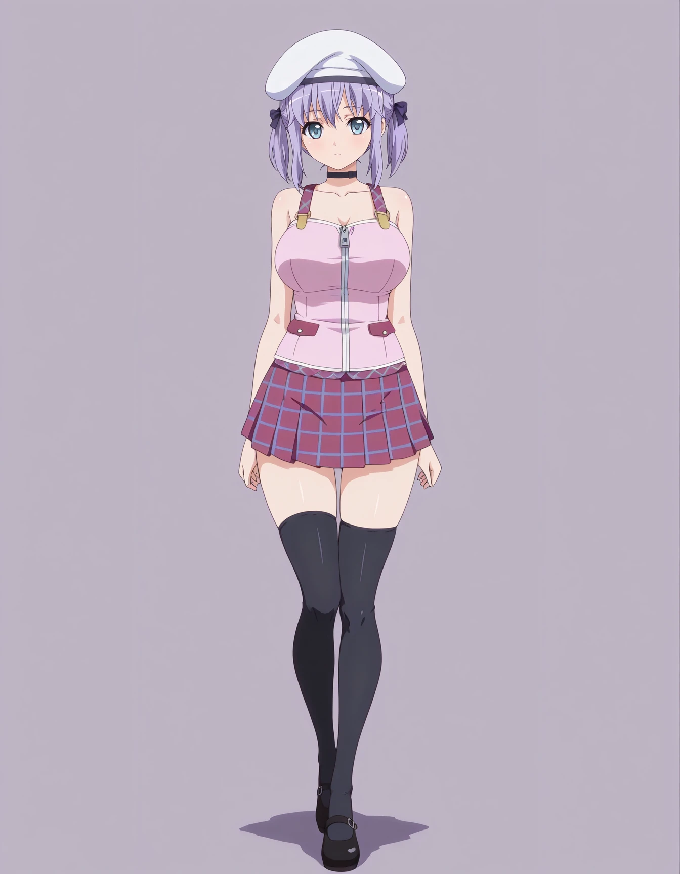 mai_mcn,mai_yukimn,short_hair,short_twintails,purple_hair,blue_eyes,hair_ribbon,choker,bare_shoulders,zipper,white_beret,pleated_skirt,plaid_skirt,black_thighhighs,mary_janes