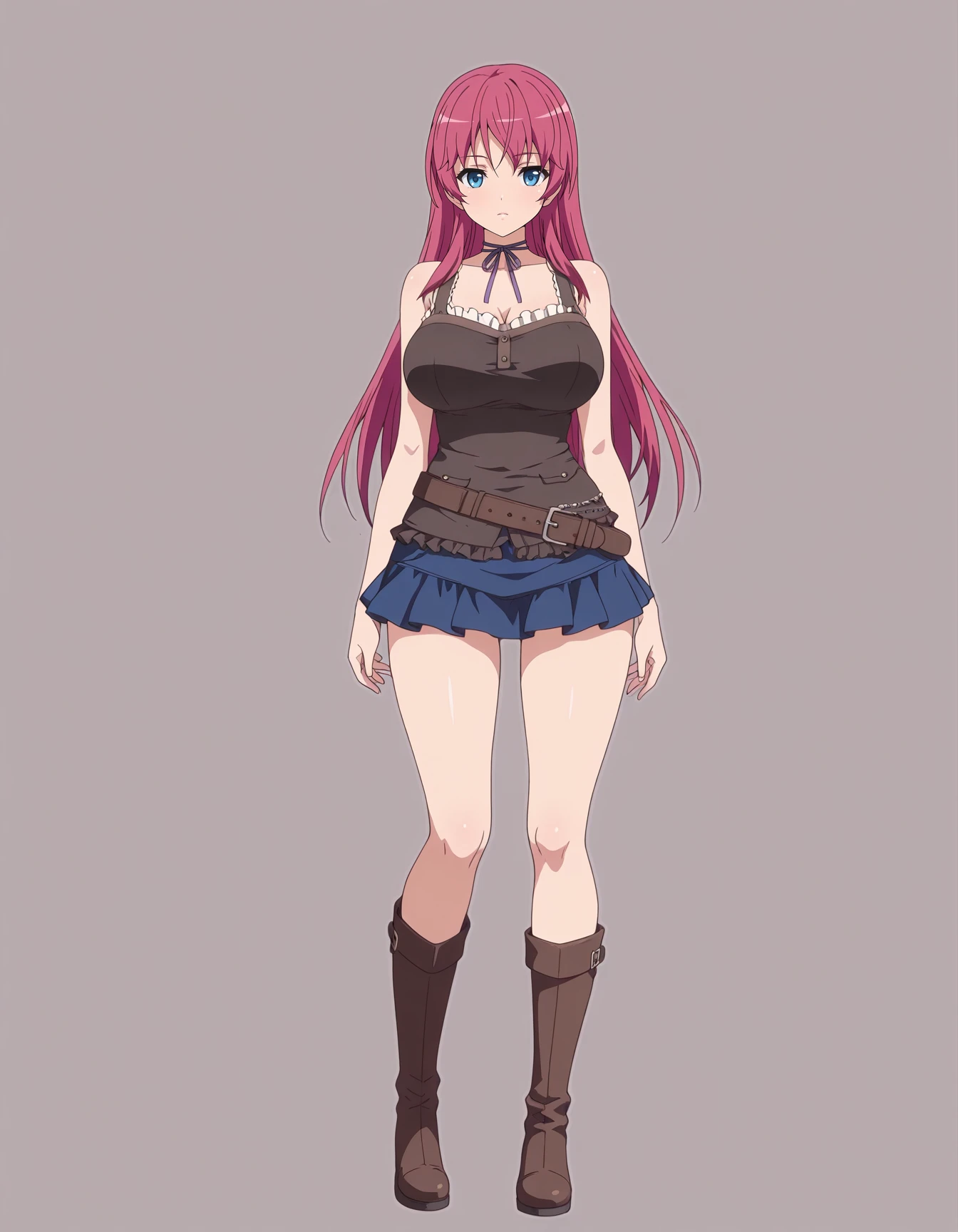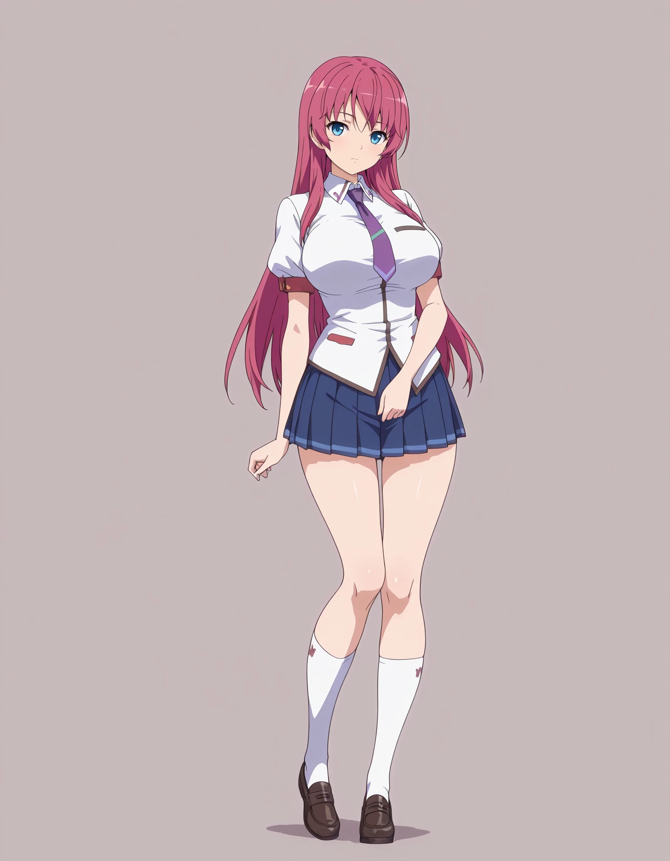mai_mcn,mai_makimn,long_hair,pink_hair,blue_eyes,large_breasts,school_uniform,necktie,short_sleeves,blue_pleated_skirt,white_socks,loafers