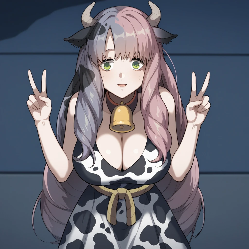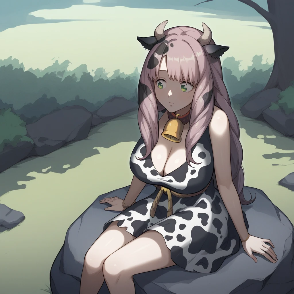 YiLi, 1girl, solo, pink hair, long hair, green eyes, cow horns, cow ears, cowbell,